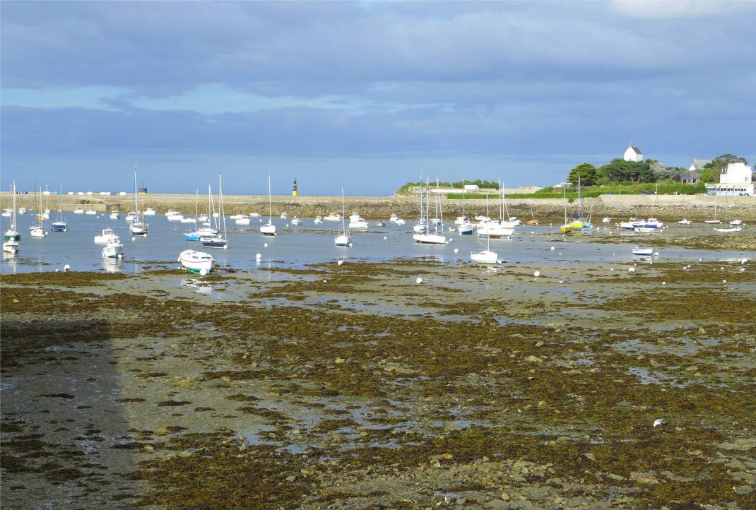 Um halb sieben klingelt der Wecker. Wir liegen in der Koje und betrachten fassungslos den Himmel über unserer Koje. Es ist ja stockdunkel! War es nicht die letzten Tage irgendwie früher hell? Wir hatten ausgerechnet, dass wir um sieben, kurz vor Niedrigwasser auslaufen wollen, aber im Dunkeln? Nö. Nobbi überredet sich schließlich Kaffee zu kochen. Auf dem Weg zu den Waschräumen stellen wir fest, dass wir die rote Tonne hinter dem Hafen gar nicht sehen. Nebel. Am Abend vorher hatten wir gesehen, dass für morgens 9 Grad angesagt sind, dass es zu Nebel kommt, wenn diese kalte Luft über das warme Wasser schwabbelt, weiß man ja eigentlich… Wollen wir jetzt los oder nicht? Wir trödeln ein bisschen, beschließen dass der Nebel weniger wird und legen ab. Langsam hangeln wir uns von Tonne zu Tonne. Die Sonne geht auf und die Fahrt auf dem Fluss ist wunderschön. Als wir die Mündung erreichen ist der Nebel fast verschwunden und zwei Delfine begrüßen uns. Der Tag wird richtig schön und warm und die Bekleidung wechselt langsam von Ölzeug zu kurzer Hose. Obwohl der Wind aus Südwest kommt, also ablandig ist, gibt es eine hohe Dünung aus Nordwest. Die Wellen sind manchmal bis zu 3m hoch und schön lang. Manchmal kann man, wenn man im Wellental ist, zu keiner Seite den Horizont sehen. Nachmittags kommen wir in Roscoff an, kurz vor der Ansteuerung treffen wir wieder Delfine, diesmal viele Tiere, bestimmt über 20 und eine andere Art als morgens. Sie sind viel kleiner, als die beiden bei Treguier. Abends machen wir noch einen langen Spaziergang durch den schönen Vieux Port mit den vielen Geschäften und Restaurants, essen Räuchermakrele und fallen ins Bett.