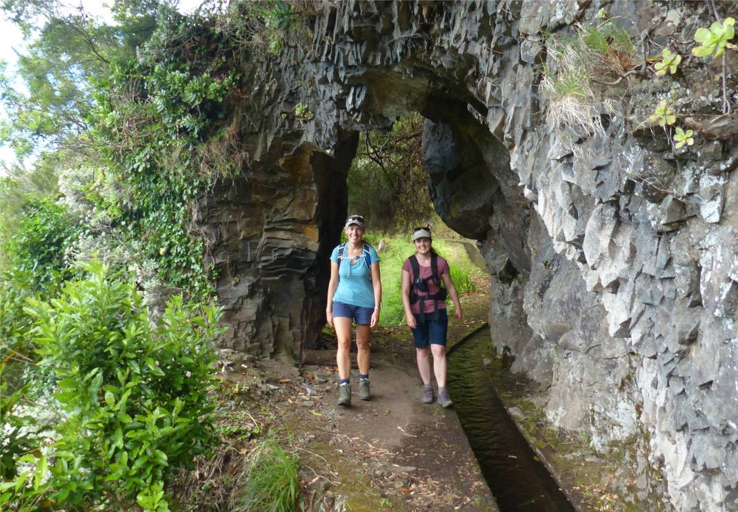 An der Kirche von Boaventura im Norden Madeiras startet eine Wanderung mit vielen Treppenstufen, die uns zu einem Aussichtspunkt über das Dorf bringt. Anschließend klettern wir auf schmalen Pfaden hinauf zu einer ursprünglichen Levada. Nach einem gemächlichen Abschnitt entlang des Bewässerungskanals folgen wir einem Bach. Die Vegetation ist üppig und überall blüht es. Wir gelangen zu einem kleinen Ort, wo wir wiederum kleine Pfade hinauf steigen, um zur nächsten Levada zu gelangen. Hier müssen wir auf der Kante der Levada balancieren, an der einen Seite der nasse, überhängende Felsen, auf der anderen Seite geht es in die Tiefe. Besser nicht nach unten gucken. Zum Glück ist der Weg nur ein kurzes Stück so aufregend, danach spazieren wir wieder gemütlich entlang der Levada. Der letzte Teil des Weges verläuft durch Gärten und Felder und bringt uns zurück nach Boaventura.