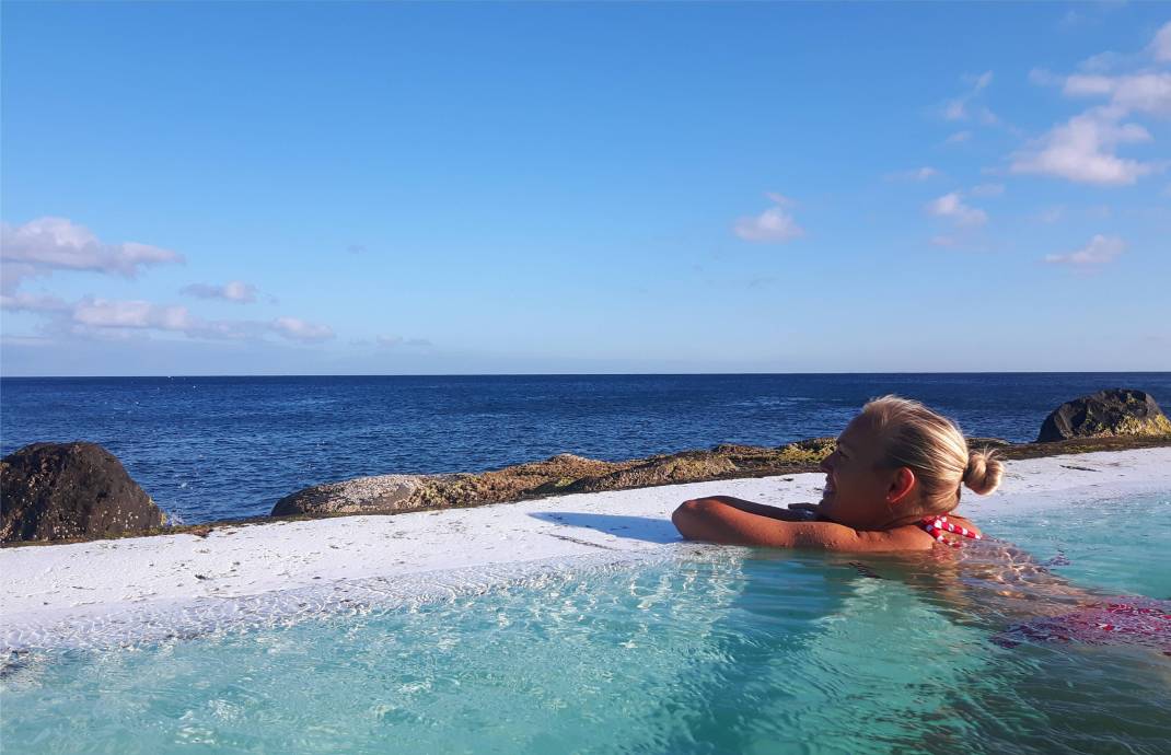 Auch der Meerwasserpool des Hotels ist schön und in der kleinen Bucht vor dem Hotelstrand haben wir Fische und Seeigel beim Schnorcheln angeguckt und sogar einen kleinen Rochen gesehen. Nur der Ein- und Ausstieg ist hier nicht ganz einfach. Bei Hochwasser kann man an der Treppe, die auch die Tauchschule benutzt, ins Wasser steigen, bei Niedrigwasser bleibt nur der Einstieg über den Strand. Das ist mühsam, da es auch bei wenig Wind immer eine recht ordentliche Brandung gibt. In der Nachbarbucht, nur eine Viertelstunde zu Fuß entfernt, gibt es einen der seltenen Sandstrände Madeiras. Hier haben wir letzte Woche Mareikes Abschiedsbad genommen und die kleine Strandbar stellt einen netten Anlaufpunkt für Spaziergänge dar. Eigentlich wollten wir hier noch Tauchen, doch jetzt sind wir mit Schnorcheln und Baden ganz zufrieden.