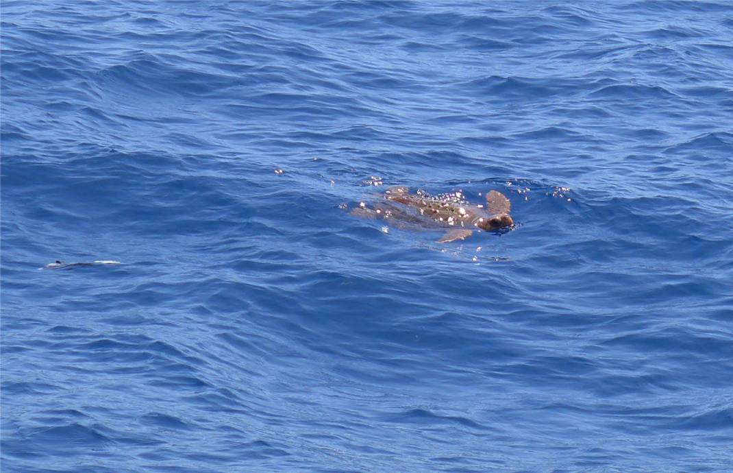 Kaum kommen wir südwestlich von La Palma in die Abdeckung der Insel nimmt der Wind innerhalb weniger Meter von 6 Bft auf 0 bis 1 Bft ab. Hier ist das Wasser ganz ruhig und optimal zu Schildkröten sichten. Gleich fünf große Schildkröten sehen wir, die sich an der Wasseroberfläche sonnen. (Liebe Aloma, wir zählen jetzt Schildkröten ;-))