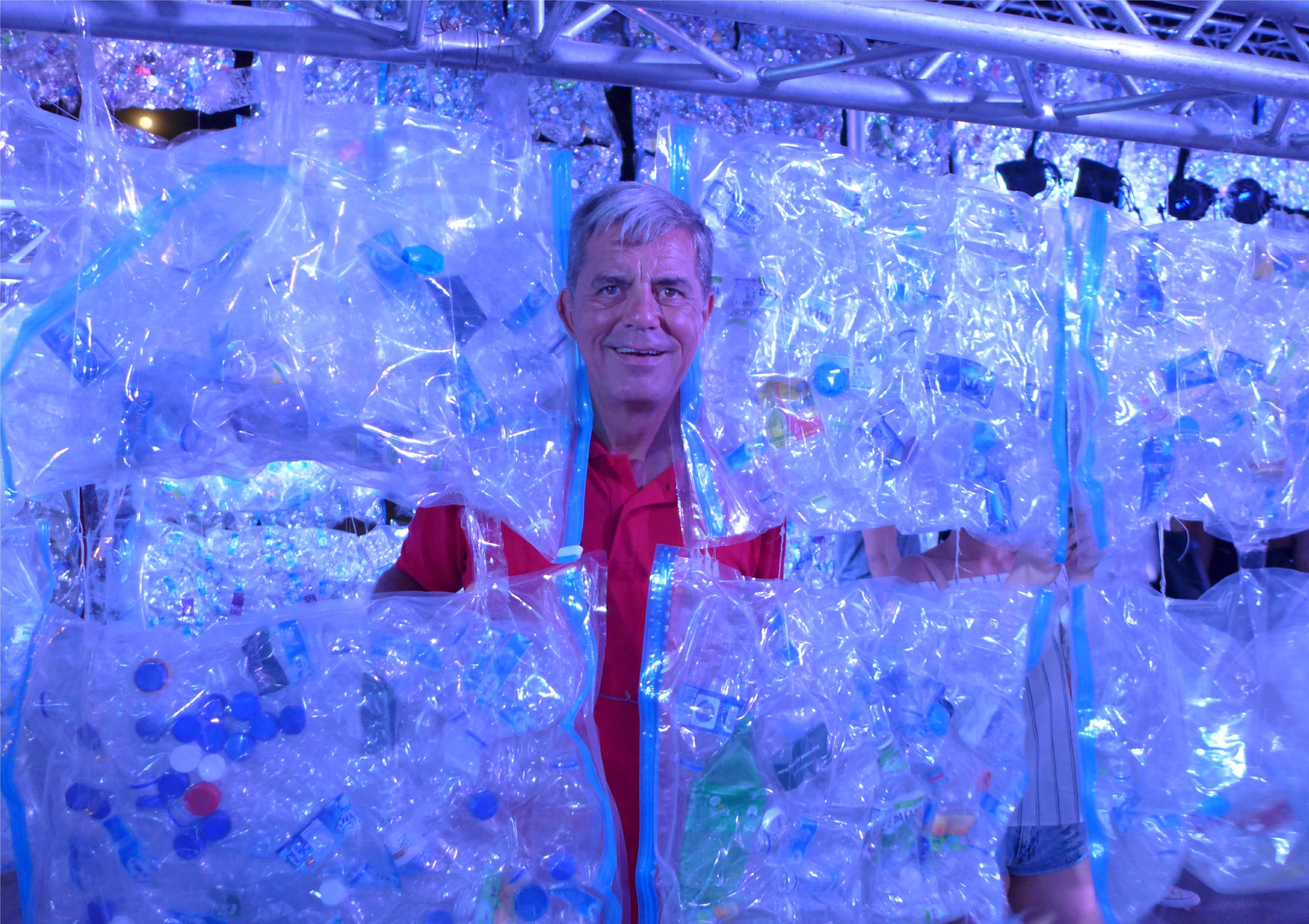 Singapore beleuchteter Plastikmüll mit neugierigem Besucher