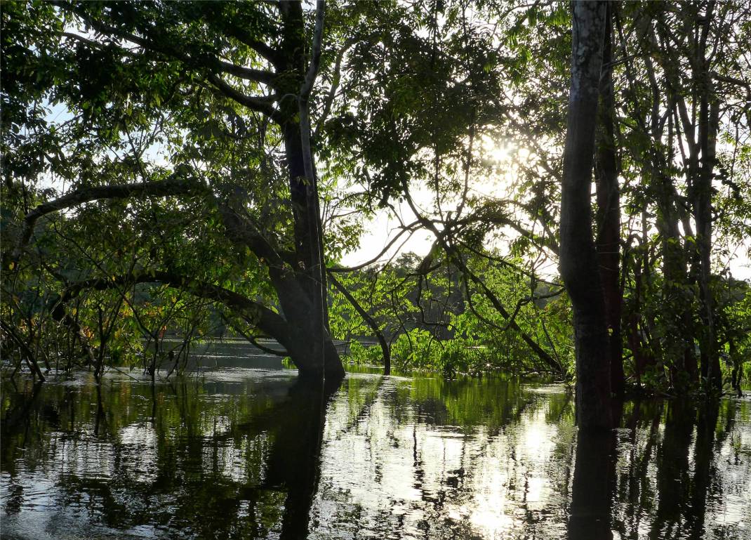 Nachmittags geht es auf unsere letzte Bootstour. Wir unternehmen eine weite Fahrt um dem Sonnenuntergang auf dem Rio Japura anzusehen. Der Sonnenuntergang ist schön, aber noch schöner sind die vielen kleinen, ruhigen Kanäle, durch die wir auf dem Weg dorthin fahren. Wir sehen wieder sehr viele Affen. Eine große Gruppe Schwarzkopftotenkopfäffchen mit Babys, mehrere Gruppen Brüllaffen, einmal mit Baby, eine Truppe Gewöhnliche Totenkopfäffchen, die so wild von Baum zu Baum springen, dass ein Ast mit Affe darauf abbricht und Kapuziner mit zwei Babys. Was für ein schöner Abschied. Am Rio Japura machen wir noch einen kleinen Stopp bei einer Familie, die unser Guide kennt. Hier ist das Land etwas höher gelegen. Die Familie hat viele Kühe, die auf dem Trocknen stehen, und baut Bananen an. Auf der Rückfahrt genießen wir noch ein letztes Mal das goldene Licht auf den schönen Bäumen.