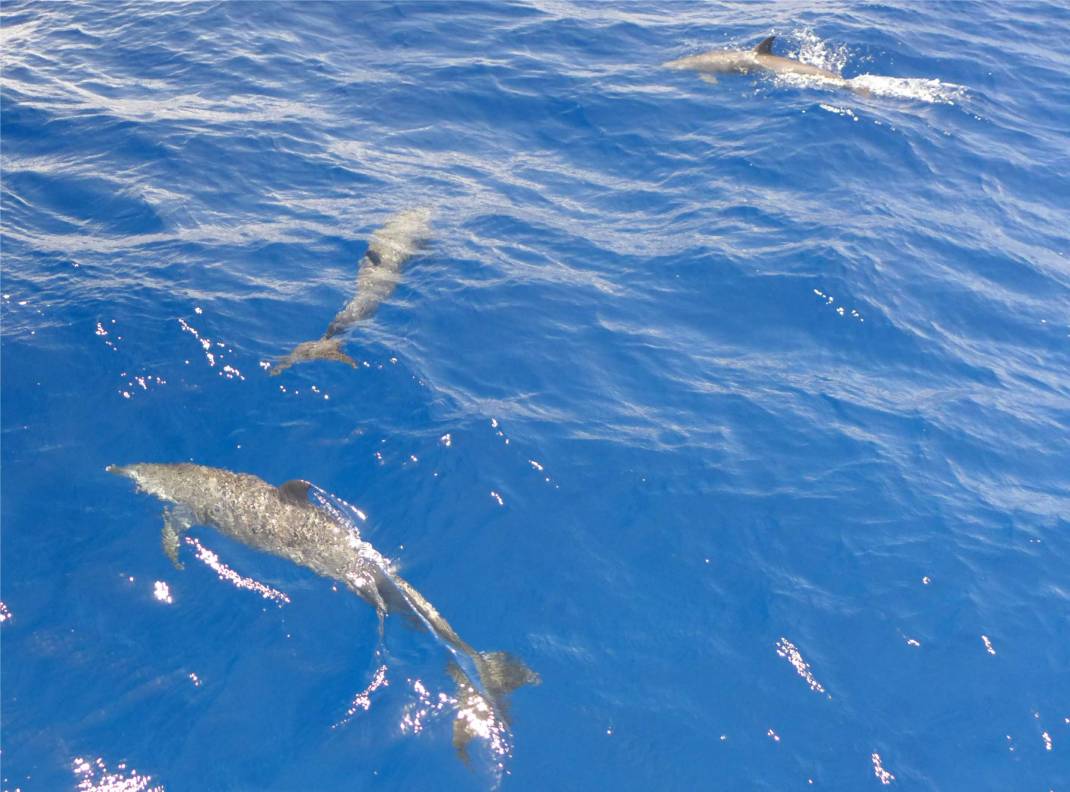 Eine Gruppe kleiner Fische begleitet uns, anscheinend gefaellt es ihnen in Maris Schatten zu schwimmen. Heute Morgen hatten wir Besuch von einem Delfin und heute Nacht einen schwarzen Vogel als Passagier. Gelegentlich werden wir von einem Schiff ueberholt. Die Sonnenauf- und Untergaenge sind wunderschoen. Dass wir bereits eine ganze Strecke nach Westen zurueckgelegt haben, merken wir auch daran, dass die Sonne deutlich spaeter verschwindet und auch wieder auftaucht. Praktischerweise haben Start und Ziel dieser Etappe die gleiche Zeitzone, wir muessen die Uhren also nicht umstellen.
