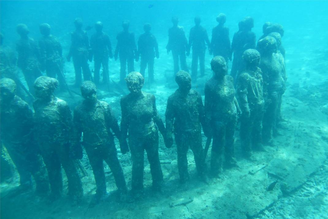 Heute Morgen nutzen wir die Windstille und wechseln von unserer Genua auf die kleinere Fock. Der anstrengendste Teil ist das Zusammenlegen der großen Genua an Deck noch vor dem Frühstück. Vormittags fahren wir mit dem Dinghi um die Ecke zum Moliniere Point. Dort gibt es einen Unterwasser-Skulpturen-Park, den wollen wir uns ansehen. Wir binden unser Schlauchboot an eine der Bojen für die Ausflugsschiffe und machen uns schnorchelnd auf den Weg. Die Sicht ist gut und bald sehen wir die ersten Statuen, überall auf den Sandflächen stehen sie. Wir entdecken z.B. eine Meerjungfrau, einige Gesichter, kleine und größere Gruppen von Menschen die im Kreis stehen und eine Frau die auf einer Bank sitzt. Viele der Statuen sind leider kaputt, doch trotzdem gibt es noch genug zusehen. Es sind viele Fische unterwegs: Doktorfische, Papageifische, Sepias, ein Barakuda, eine riesige Languste, eine Muräne… Wir sind zufrieden und wiederholen unsere Tour am Nachmittag. Der Platz ist sehr beliebt. Schnorchel-Gruppen und Tauchboote kommen und gehen. Da wir quasi in der ersten Reihe liegen, konnten wir einen Zeitpunkt abpassen wo wir den Platz für uns alleine haben.