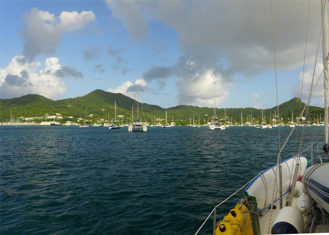Donnerstag (gestern) verlassen wir Grenada. Im Windschatten der Insel haben wir zunächst wenig Wind und motoren nach Norden. Hinter der Insel können wir segeln, doch der Wind kommt sehr spitz, also sehr weit von vorne und ein starker Strom versetzt uns nach Westen. Das Segeln ist zunächst mühsam, die Welle stoppt uns immer wieder auf. Umso länger wir unterwegs sind, umso besser wird das Segeln und so rauschen wir schließlich auf Carriacou zu. Das Wetter ist schön, die Sonne scheint und das Meer leuchtet tiefblau. Unterwegs sehen wir endlich mal wieder Mondfische, die sich sonnen, außerdem Tropikvögel mit ihren langen Schwanzfedern und viele Tölpel.