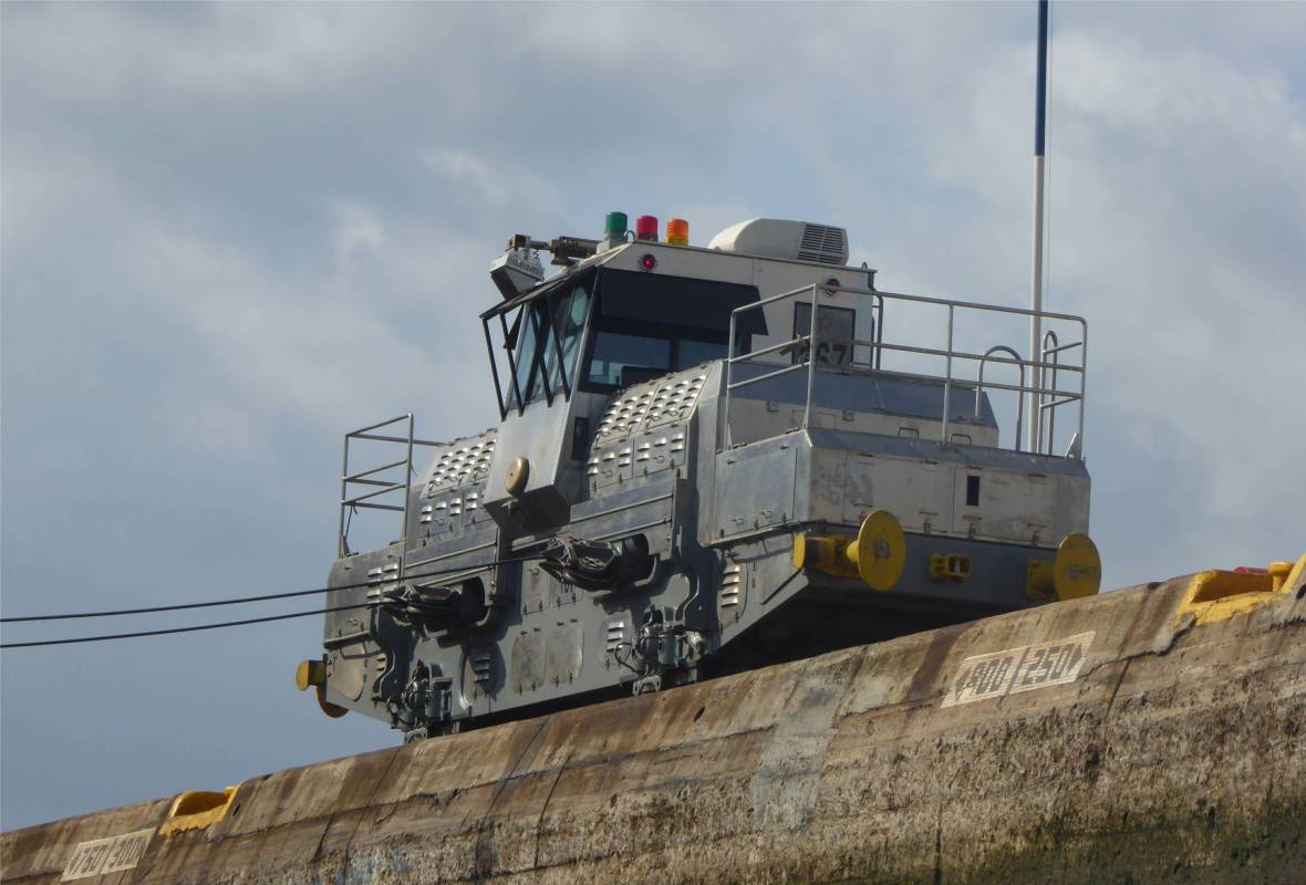 Panamakanal die Loks halten die grossen Schiffe in Position