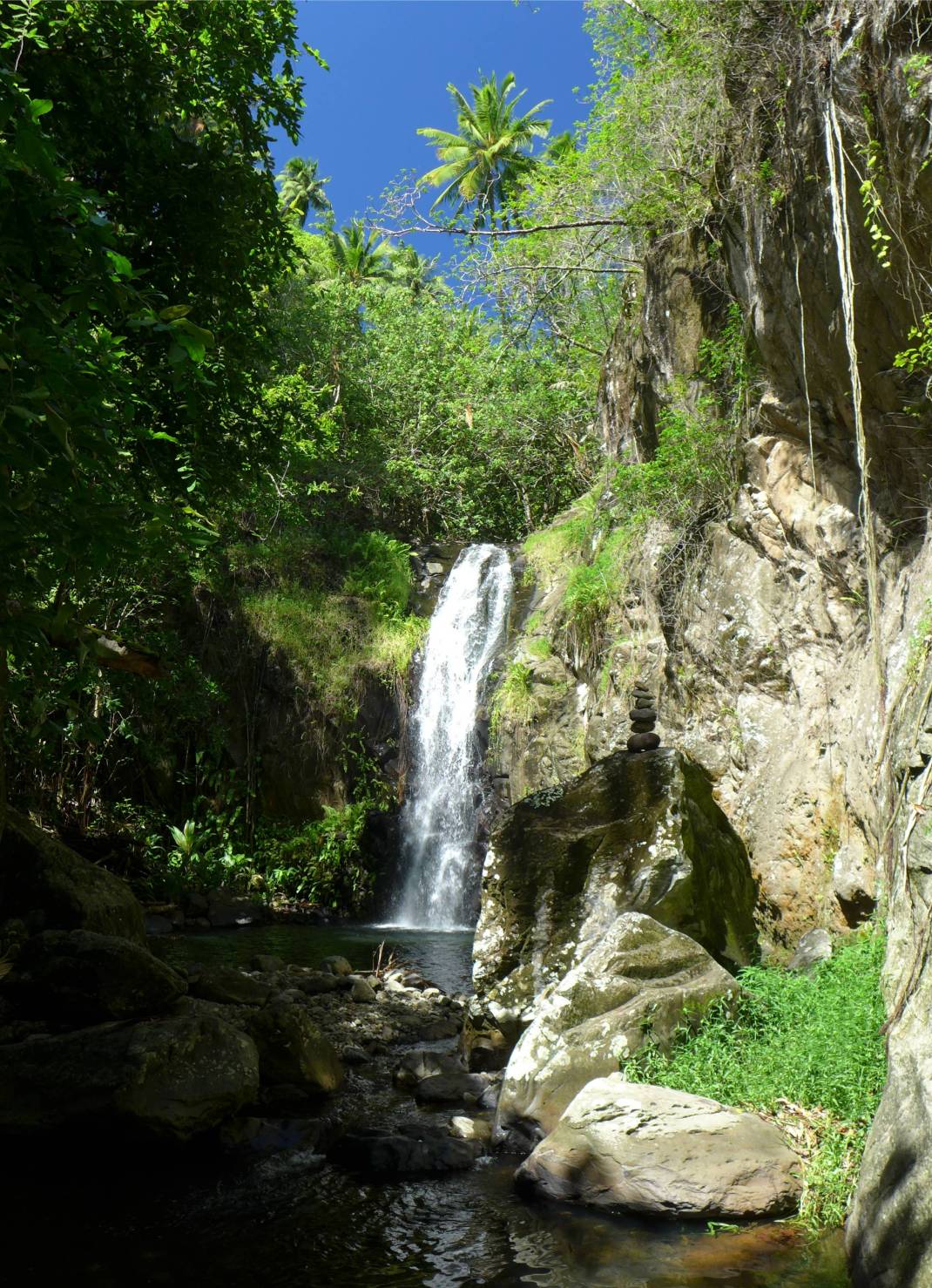 Auf den Tuamotus weht es tüchtig, wir bleiben noch etwas hier und vielleicht darf ich noch einmal am Wasserfall baden.