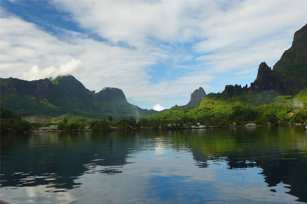 Die Sonne geht hinter den hohen Bergen unter. Die steilen Felsen werfen sich ständig verändernde Schatten auf die Bucht. Wir liegen in der Baie de Cook in Moorea. Diese Bucht ist eine der Buchten im Who-is-Who der Ankerbuchten der Welt. Das Panorama ist fantastisch. Die meisten Weltumsegler ankerten hier. Die Bilder dieser Bucht kennen wir aus all den Büchern, die auf unseren Nachttischen lagen als wir noch von einer solchen Reise träumten. James Cook selbst lag in der Nachbarbucht, diese aber wurde nach ihm benannt.