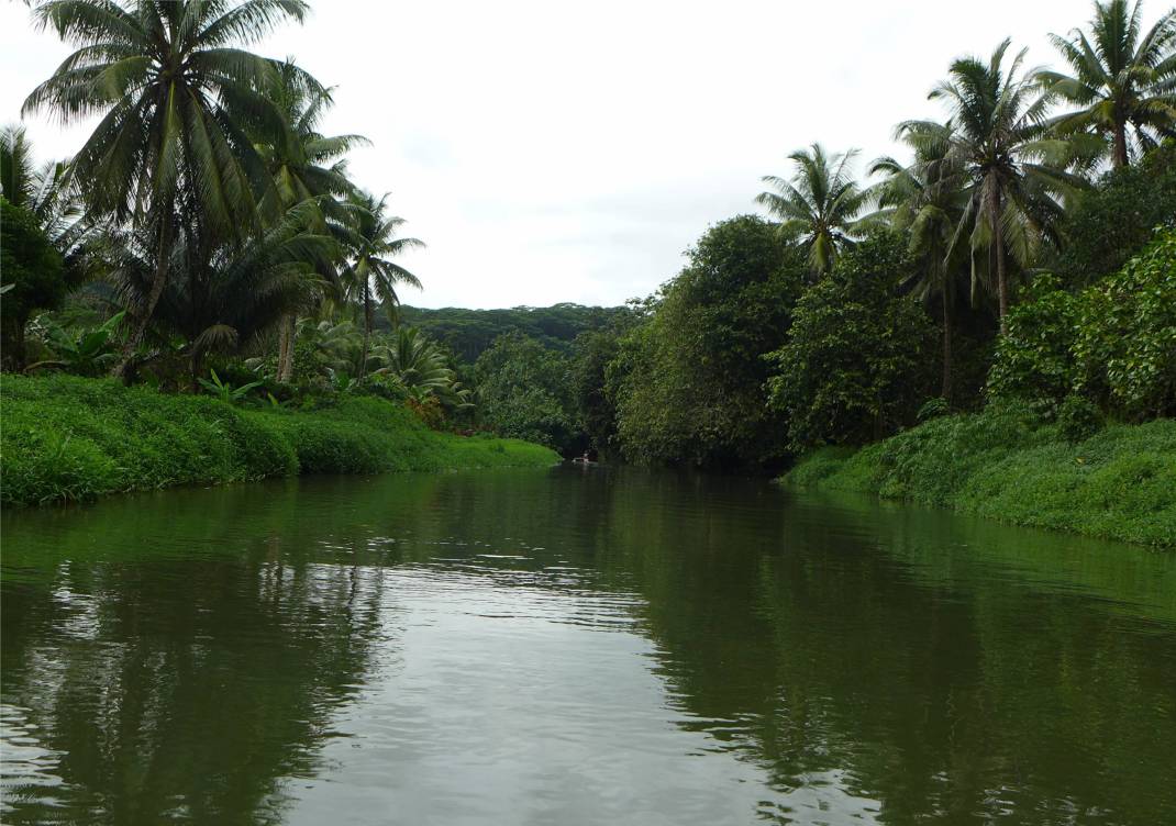 Zum Glück regnet es nicht immer, sondern nur fast immer. Wir fahren mit dem Schlauchboot den Fluss hoch. André bewirtschaftet hier zwei Hektar Land und hat mit den Touristen eine Einnahmequelle gefunden. Er zeigt seinen Garten, erklärt welche Pflanzen er anbaut und verkauft Obst. Wir treffen ihn hinter der ersten Biegung des Flusses. Für uns kehrt er um. In seinem Kanu ist er deutlich schneller als wir mit dem Schlauchboot mit Außenborder. Der kleine Fluss wird immer schmaler und schlängelt sich durch das Tal. Wir müssen aufpassen, dass wir nicht auflaufen, so flach ist es. Seit langem treffen wir in André das erste Mal auf einen Menschen der sich über unsere mühsamen Versuche Französisch zu sprechen freut. Wir erfahren, dass er kein Auto hat und deshalb nicht auf dem Markt verkaufen kann. Doch mittlerweile kommen so viele Touristen, dass er davon gut leben kann. Neben den Seglern, bei denen dieser Ausflug beliebt ist, kommen Touristen mit gemieteten Kanus und sogar ein kleines Ausflugsboot fährt in den Fluss. Er pflanzt verschiedene Sorten Bananen, unterschiedliche Arten Taro, Papaya, Gurken und Bohnen. Er hat einen Mango- und einen Rhambutanbaum, Zitronenbäume und viele schöne Blumen. Pampelmusen- und Orangenbäume hat er neugepflanzt, sie brauchen noch ein paar Jahre, außerdem versucht er sein Glück mit Pfeffersträuchern. Wir kaufen ihm Bananen und Kochbanen, sowie zwei Papaya ab, bekommen noch ein paar Zitronen zugesteckt und eine Trinknuss serviert.