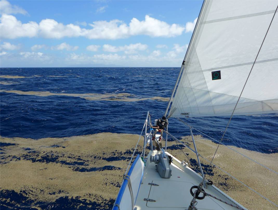 Dann entdecken wir die Bimssteinfelder. Wir segeln durch große Teppiche aus kleinen Bimssteinen. Seit August sind diese Bimssteine unterwegs. Sie stammen von einem Vulkanausbruch in Tonga und treiben mit dem Wind in Richtung Australien. Einige australische Wissenschaftler hoffen, dass diese Bimssteine Fische und Algen in Tonga und Fiji einsammeln, sie zum Great Barrier Reef bringen und dieses neu beleben. Bis dahin machen die Steinchen den Seglern das Leben schwer. Zu Beginn war der Teppich bis zu 15 cm dick und riesig groß, wir haben nun kleinere Felder gesehen und auch nur noch eine Lage kleiner Steinchen dick, trotzdem waren wir froh, dass wir gesegelt sind, wir möchten das Zeug nicht in unserem Kühlkreislauf haben. Mal sehen, wo wir die Steinchen noch überall treffen.