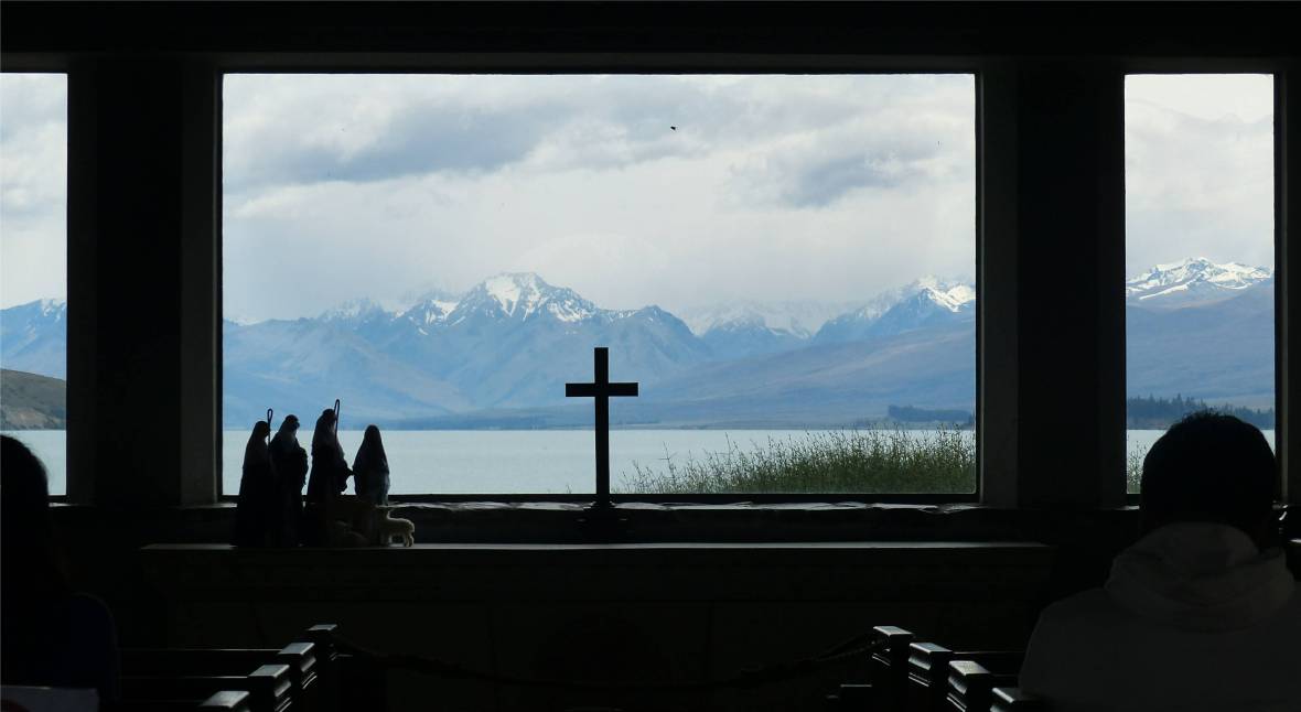 NZ Kirche Lake Tekapo Aussicht statt Altarbild