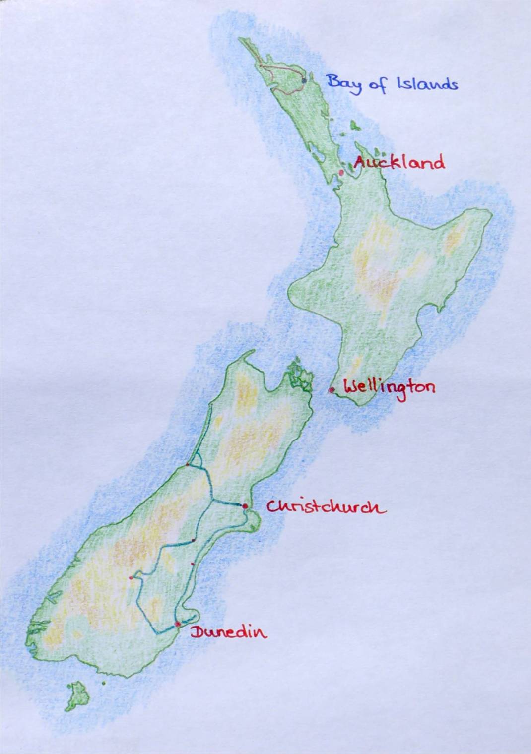 Für den besseren Überblick wo wir unterwegs waren, habe ich eine Neuseelandkarte gemalt. Der lila Kringel ganz im Norden deutet unsere Fahrt nach Cape Reinga Anfang Dezember an. Die blaue Route auf der Südinsel beschreibt unsere Reise, die wir Mitte Dezember unternommen haben.