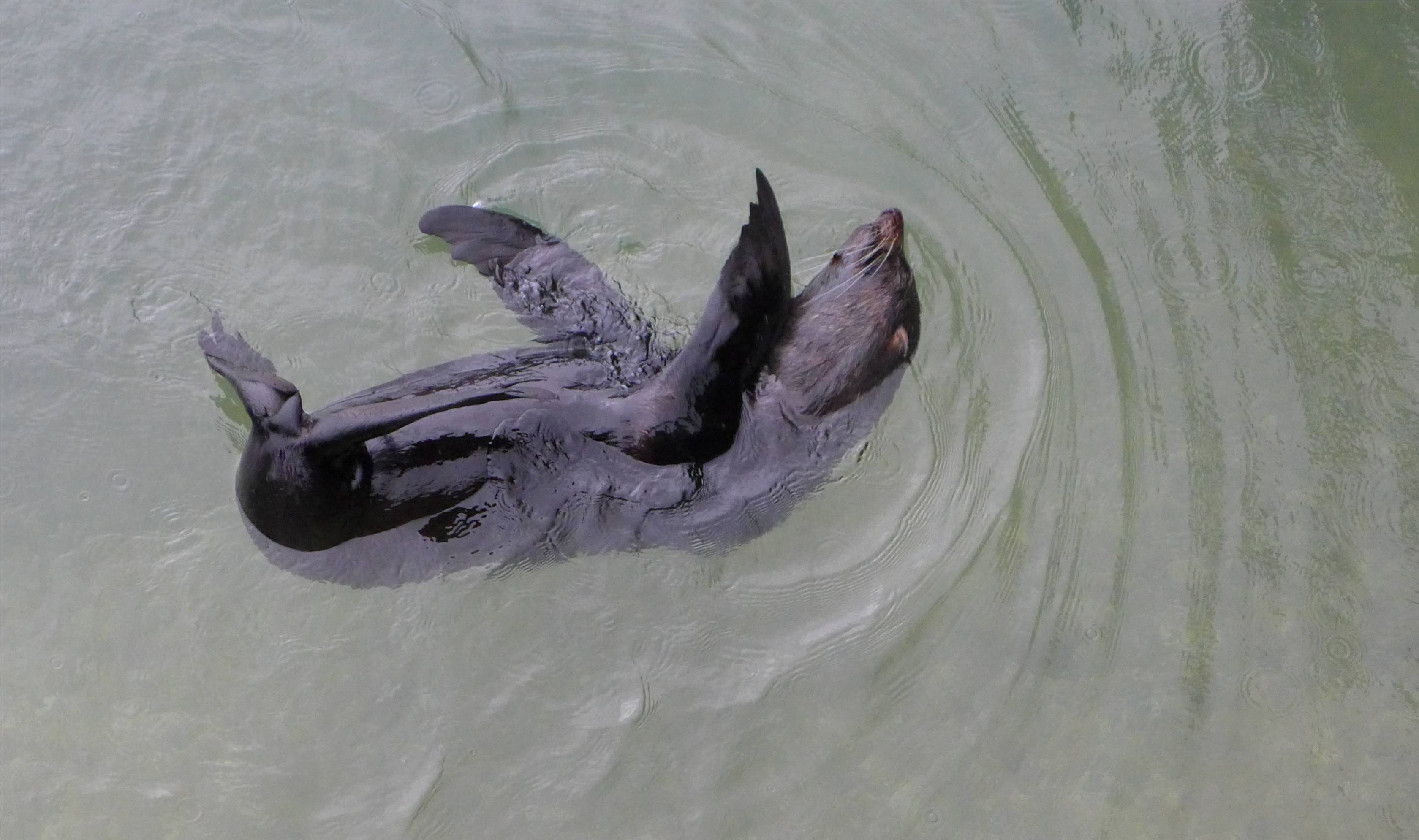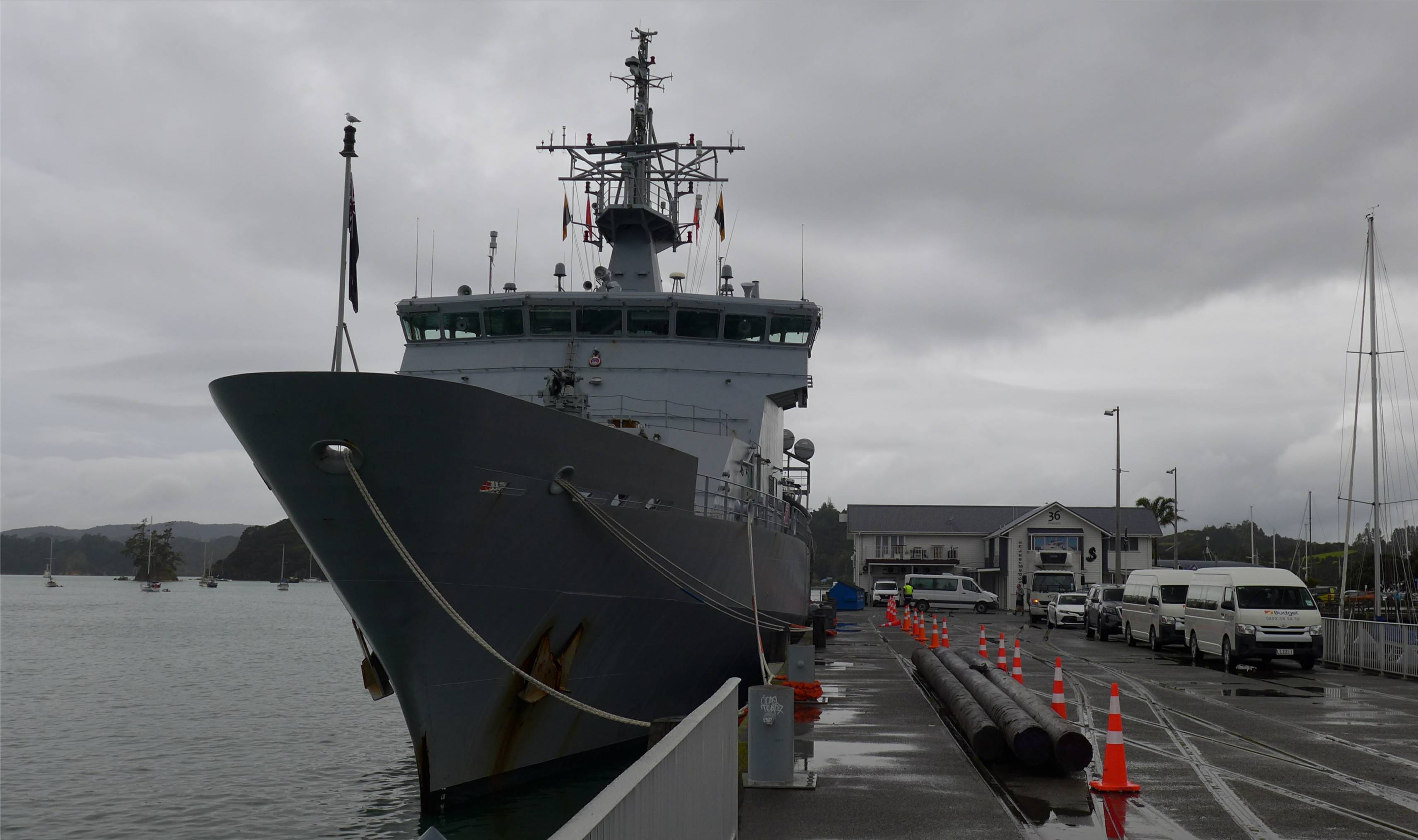 Am Samstag haben wir eine kleine Wanderung gemacht, obwohl es den ganzen Tag geregnet hat. Es hat gut getan sich zu bewegen und beugt dem Bootskoller vor. Außerdem gibt es immer etwas zu entdecken. Die HMNZS Wellington, ein Schiff der New Zealand Navy, liegt hier in Opua an der Holzpier. Wir freuen uns über die freundlichen Soldaten, die jeden Passanten grüßen und über den Kiwi am Schornstein. Irgendwie mutig, einen fast blinden, flugunfähigen Vogel auf ein Kriegsschiff zu malen. Mir gefällt’s! Zwischen Fähranleger und Laden badete ein Seebär, also kein neuseeländischer Segler, sondern eine kleine Robbe.