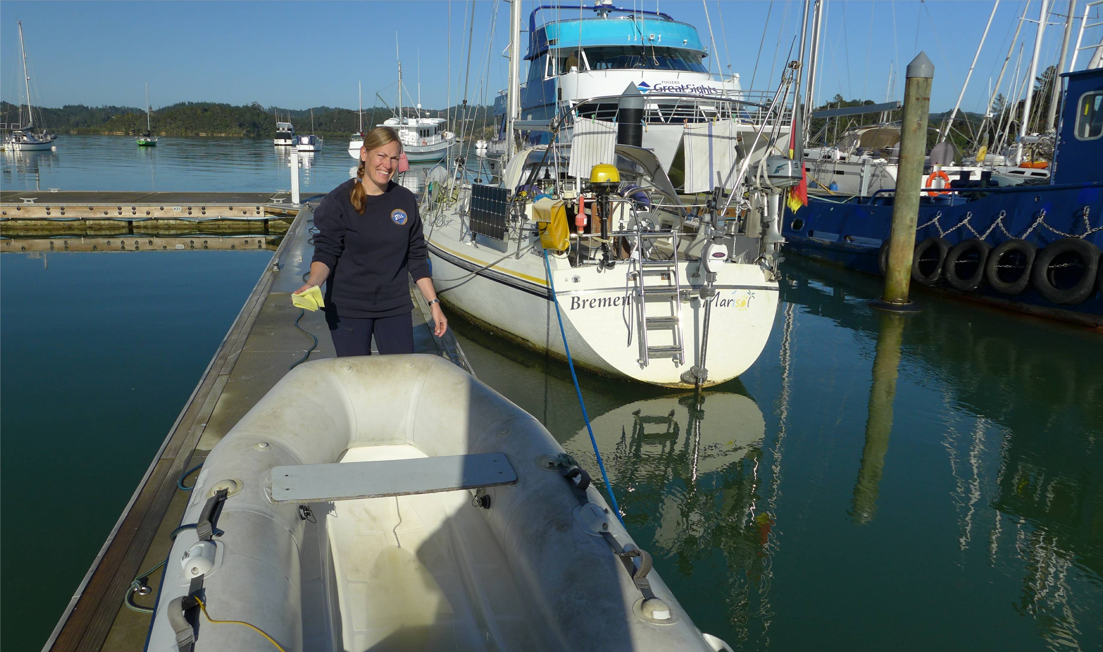 Zusammenfassend kann man sagen, dass es recht nass ist. Vor allem von oben. Vorgestern hat es durchgehend geregnet, nur unterschiedlich stark. Gestern war es trocken und wir hatten Chance uns und das Schiff zu trocknen. Heute war es wieder ziemlich nass. Zum einen stört es, dass wir es kaum schaffen das nächtliche Schwitzwasser wegzulüften, zum anderen stört der Regen bei vielen der anstehenden Bootsarbeiten. Wir machen das Beste draus. Was sollen wir auch sonst tun? Immerhin schneit es hier nicht, wie auf der Südinsel, und das Wasser ist recht warm.