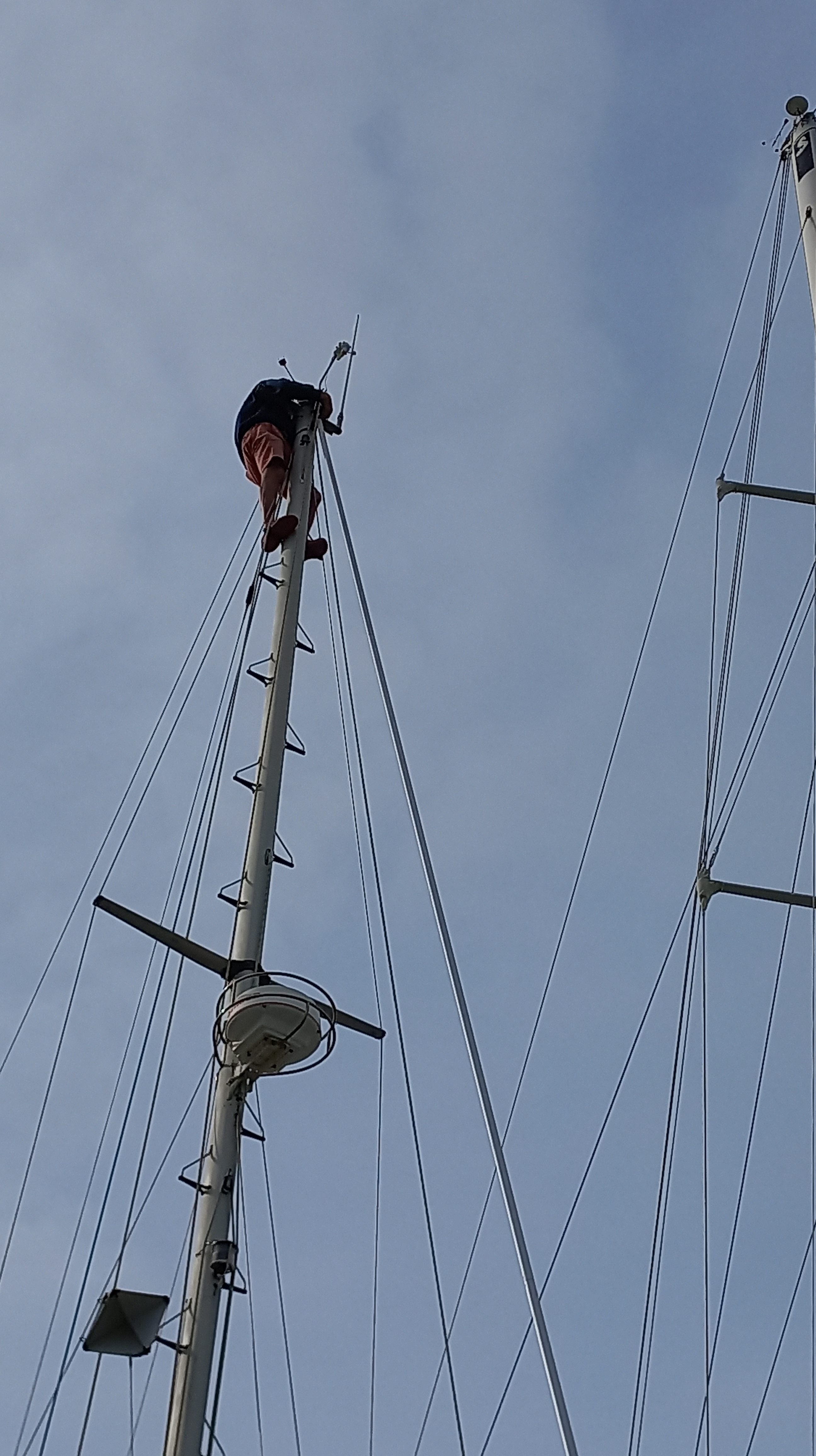 In Sachen Bootsarbeiten ist die Lage noch immer unübersichtlich. Wir sind froh, dass der Motor läuft, nachdem er eine neue Starterbatterie bekommen hat. Einiges haben wir schon erledigt, den Lümmelbeschlag ersetzt, den neue Bildschirm angebaut und ein Oberwant getauscht. Außerdem putzen, kontrollieren und waschen wir. Es gibt auch einige Verluste. Die Borduhr steht still, die Windanzeige zeigt zwar die Richtung, nicht aber die Windgeschwindigkeit und die Rolle vom Großfall will sich nicht drehen.