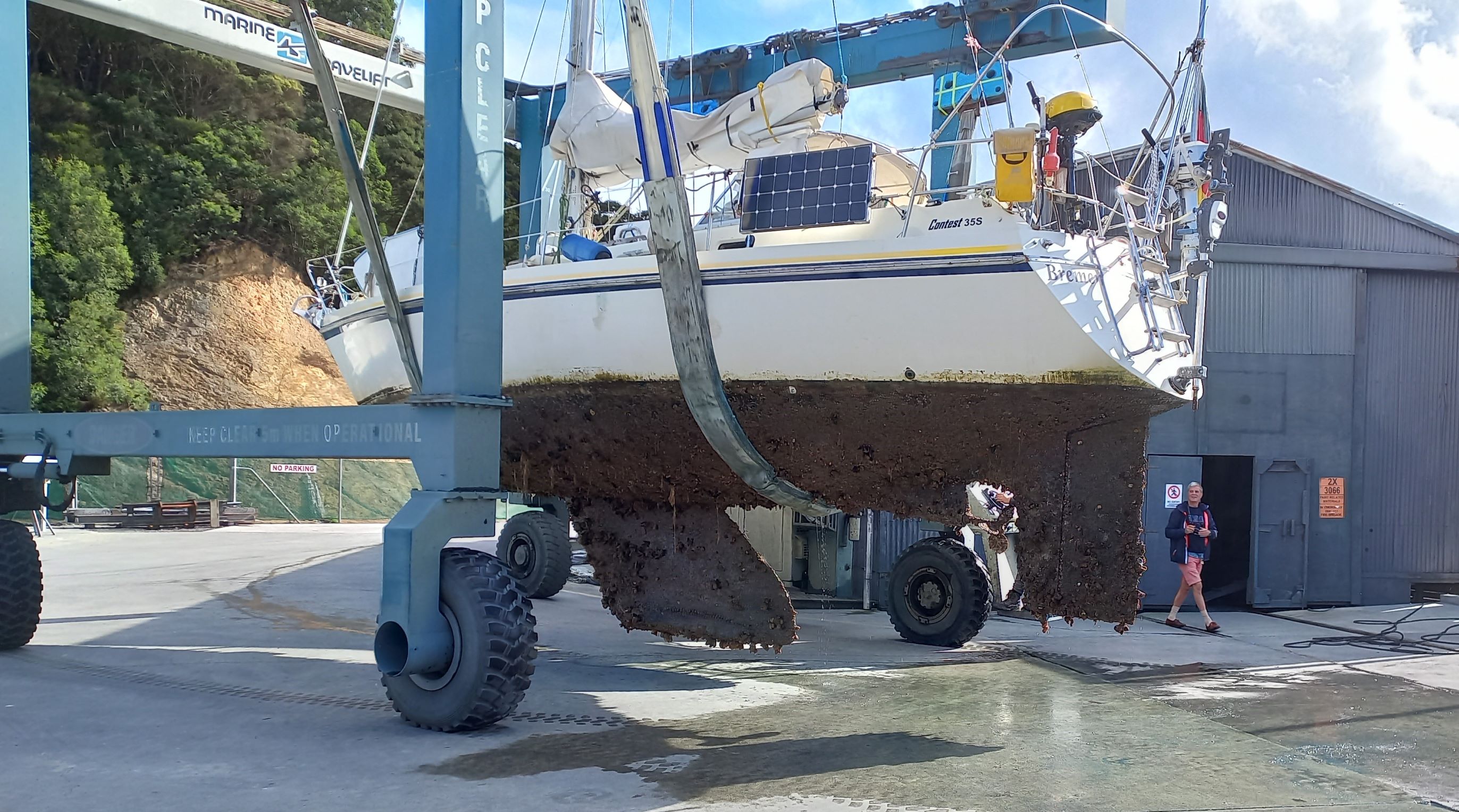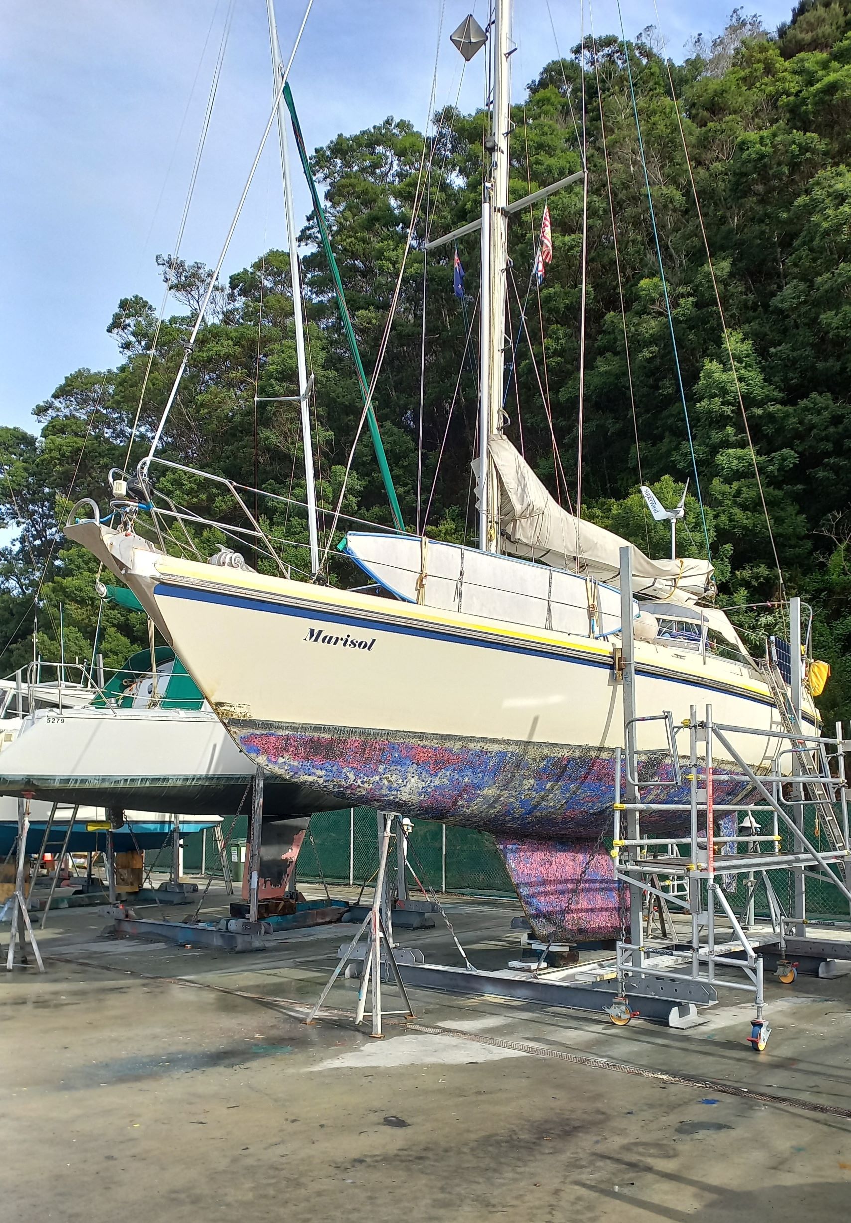 Seit einer Woche wohnen wir jetzt an Land. Wir sind nicht aus Mari ausgezogen, sondern mit ihr aufs Trockene. Das Leben an Bord ist etwas mühsam, wenn man immer die Leiter hoch und runter kraxeln muss. Viel nerviger ist allerdings die hohe Luftfeuchtigkeit. An manchen Tagen brauchen wir den ganzen Tag um das Kondenswasser der Nacht hinaus zu lüften. Mit unserem Stellplatz hatten wir Glück. Marisols Platz ist gut beleuchtet und nicht weit von den Toiletten, das ist wichtig. Teile der Werft gleichen nachts, also ab 18 Uhr, dann ist es stockdunkel, einem schwarzen Loch. Wenn Regen aufs Deck prasselt ist es besonders bitter, wenn man nachts mal raus muss. Aus dem warmen Bett schälen, eine Jacke über den Schlafanzug ziehen, ins Cockpit klettern, in die Crocs schlüpfen, den Niedergang wieder verschließen, die Leiter runtersteigen, über den Hof rennen, auf dem Rückweg das Ganze retour und am Ende die Füße beim Bettnachbar wieder aufwärmen.