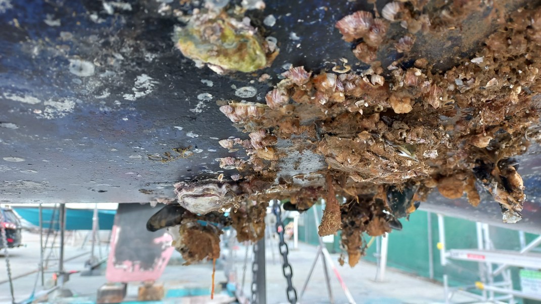 Mari ist ihre Muschelbank losgeworden. Das war interessant, verschiedene Muscheln und Austern, Krebse, merkwürdige Würmer, Seepocken und viele andere Meeresbewohner haben ihre Heimat verloren. Im Unterwasserbereich war es recht einfach die Reste abzukratzen, nachdem die Werft mittels „Water Blast“ d.h. starkem Wasserstrahl die Hauptarbeit bereits erledigt hatte. Über der Wasserlinie jedoch halten uns die Bewuchsreste weiter auf Trab. Wir arbeiten wetterabhängig vor uns hin und sind froh über jede Baustelle, die wir abschließen können. Mal sehen, wann wir so weit sind, dass Mari wieder in ihr Lieblingselement zurück darf.