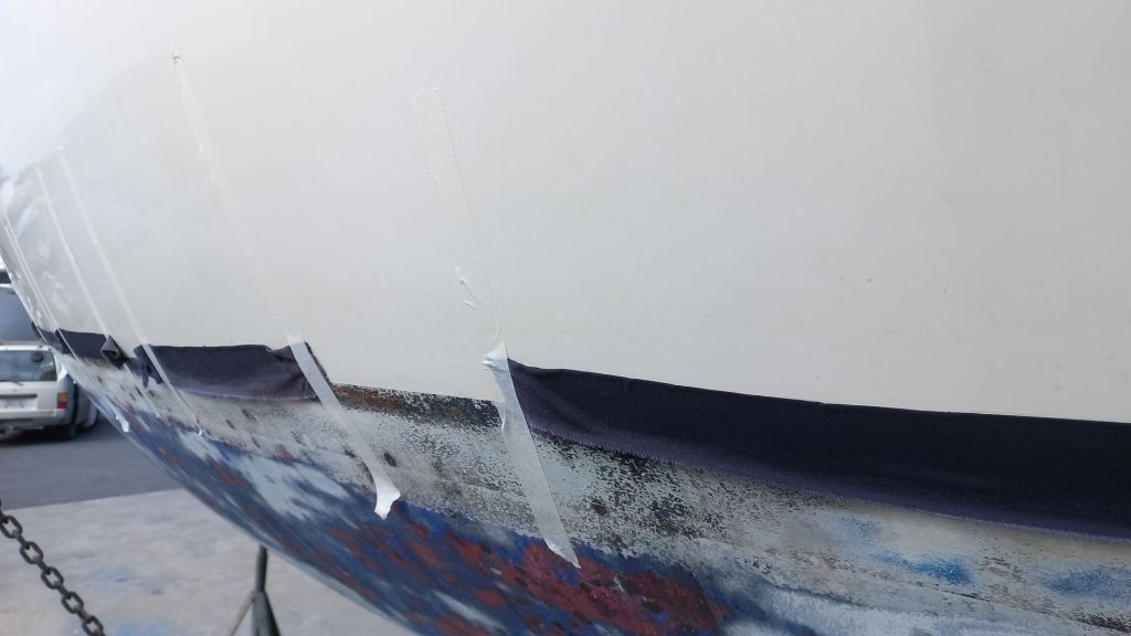 Der Rumpf wurde gereinigt, poliert und gewachst. Das hört sich einfach an, insbesondere die Reinigung war diesmal aber unerfreulich, es galt Austern am Rumpf mit Essig aufzulösen. Und mit vielen Flecken müssen wir nun einfach erstmal leben. Und, es gab einen neuen gelben Streifen.