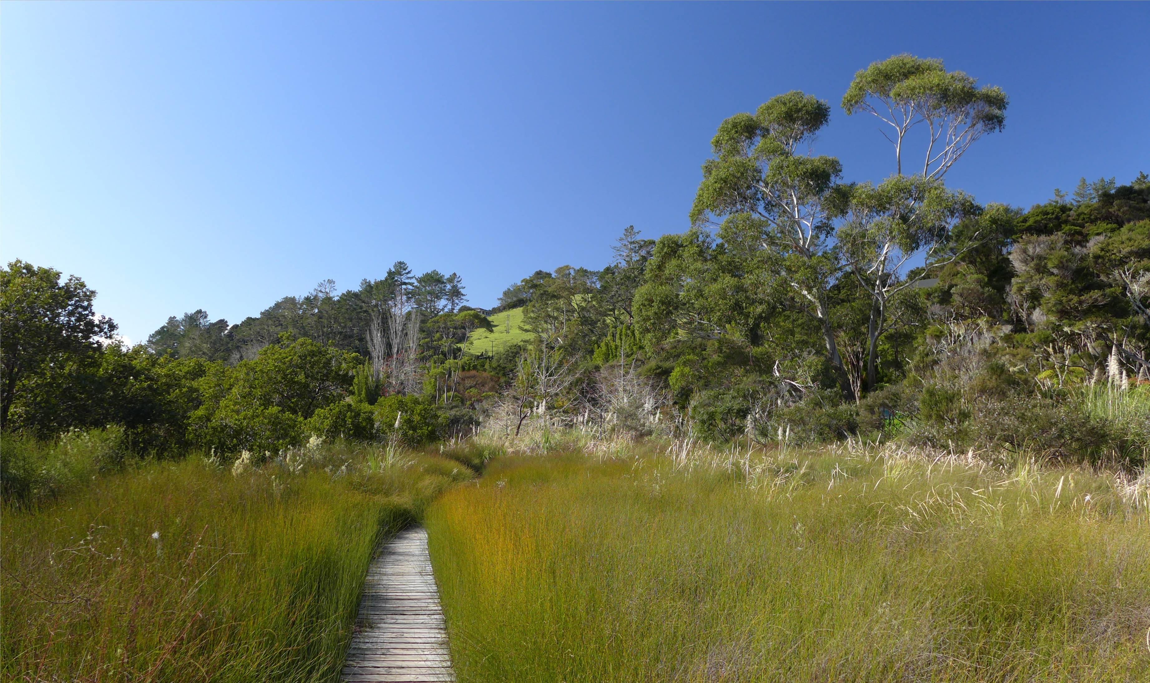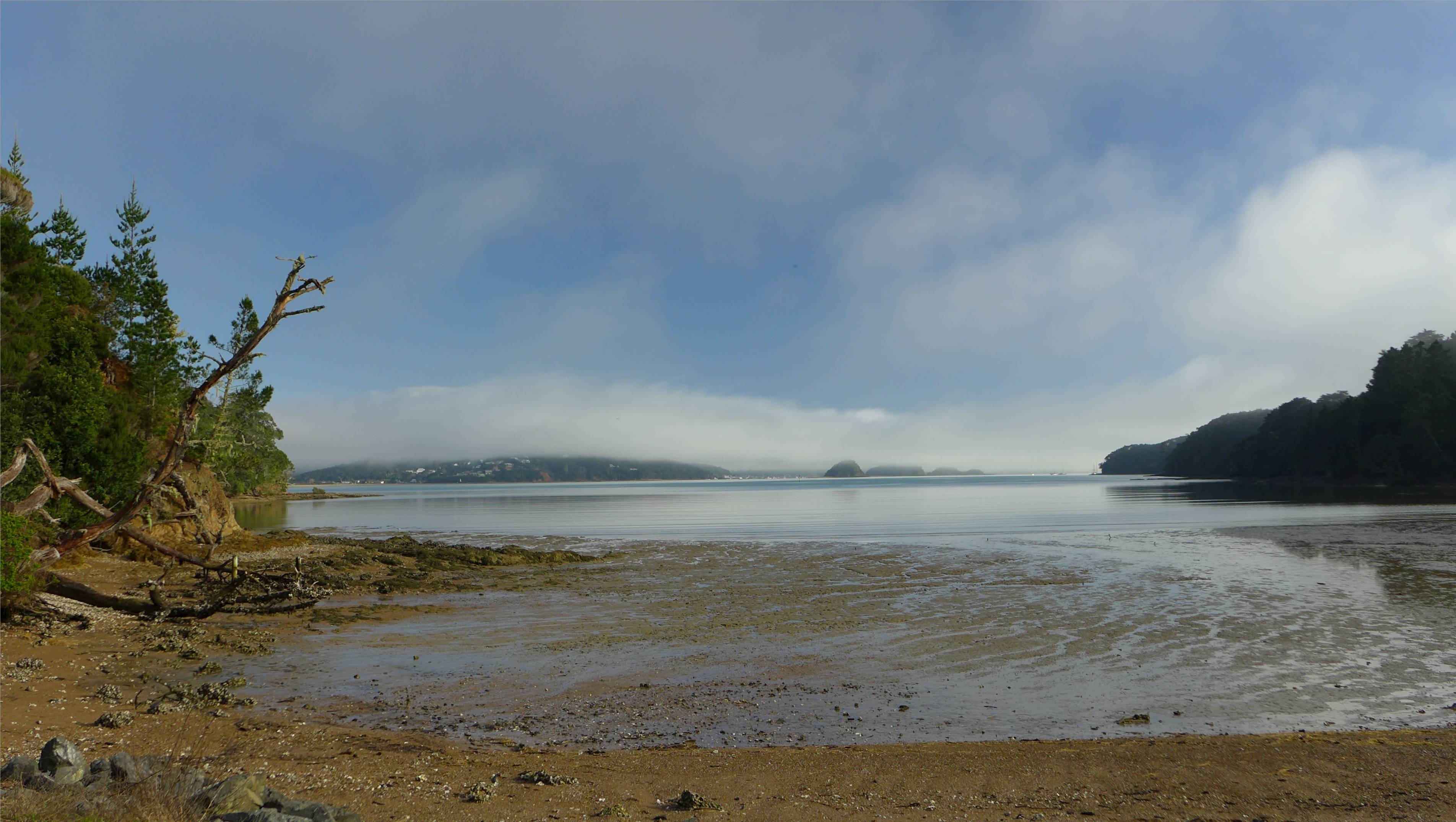Am Dienstag stellen wir uns den Wecker, ausnahmsweise haben wir einen Zeitplan. Als wir aufstehen ist der Nebel so dicht, dass wir den Hafen nicht sehen können. Wir fahren trotzdem mit dem Schlauchboot dorthin. Weil es so kalt ist, lassen wir die Regenhosen zunächst an und laufen zur Fähre, die uns nach Okiato übersetzt. Die Fährpreise haben sich verdoppelt, aber mit zwei Dollar pro Person ist die Fahrt trotzdem weiterhin erschwinglich. Von Okiato laufen wir nach Russell. Diese Wanderung hatten wir im Sommer, bevor wir Neuseeland verlassen haben, schon gemacht und sie hatte uns gefallen.