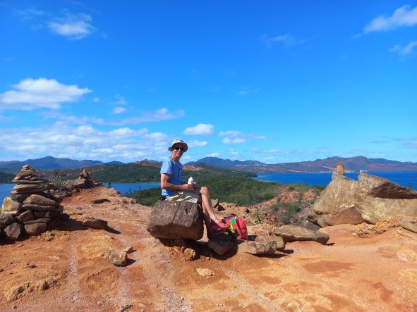 Abends kommt eine zweite Yacht und fischt eine Boje auf der anderen Seite der Bucht. Nachts schläft der Wind ein, ist ganz ruhig und ein wunderschöner Sternenhimmel zeigt sich. So ruhig und friedlich der Freitag verlief, so turbulent wird das Wochenende. Beim ersten Kaffee im Cockpit winken wir den Nachbarn, die genau wie wir erstmal baden. Dann geht es los. Ein Ausflugskatamaran mit einer Gruppe quiekender Frauen macht einen Zwischenstopp, ein Schlauchboot und eine kleine Fähre bringen Tagestouristen. Kühltaschen und Luftmatratzen werden ausgeladen, Kinder plantschen im flachen Wasser, SUPs werden durch die Bucht gepaddelt und Picknick Plätze im Schatten ausgesucht. Wirklich voll wird es nie. Wir machen mit und unternehmen jeden Tag einen ausgiebigen Spaziergang auf der Insel. Immer wieder entdecken wir tolle Pflanzen, wie die fleischfressenden Exemplare, die Kannen ausgebildet haben, in denen kleine Insekten ertrinken oder kleine Bäume, deren Wurzeln ganze Felsbrocken umarmen. Nachmittags wird ausgiebig geschnorchelt. Die Korallen in der Bucht sind ziemlich kaputt, trotzdem gibt es eine Vielzahl interessanter Fische zusehen. Mein Highlight ist der winzige, gelbe Kofferfisch. Wir sehen unsere erste Seeschlage in Neukaledonien, von denen soll es hier sehr viele geben und in der Bucht wohnt mindestens eine Schildkröte.
