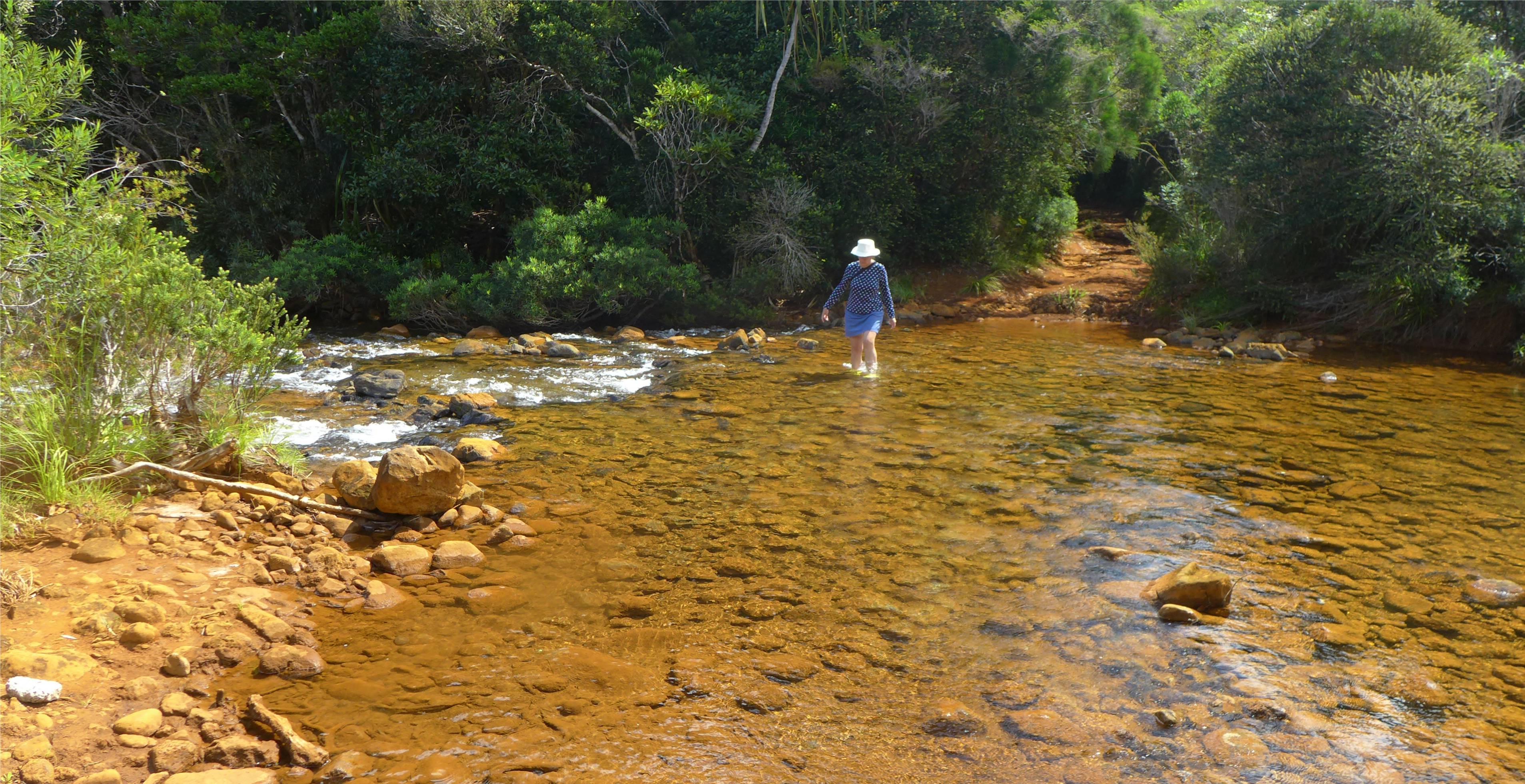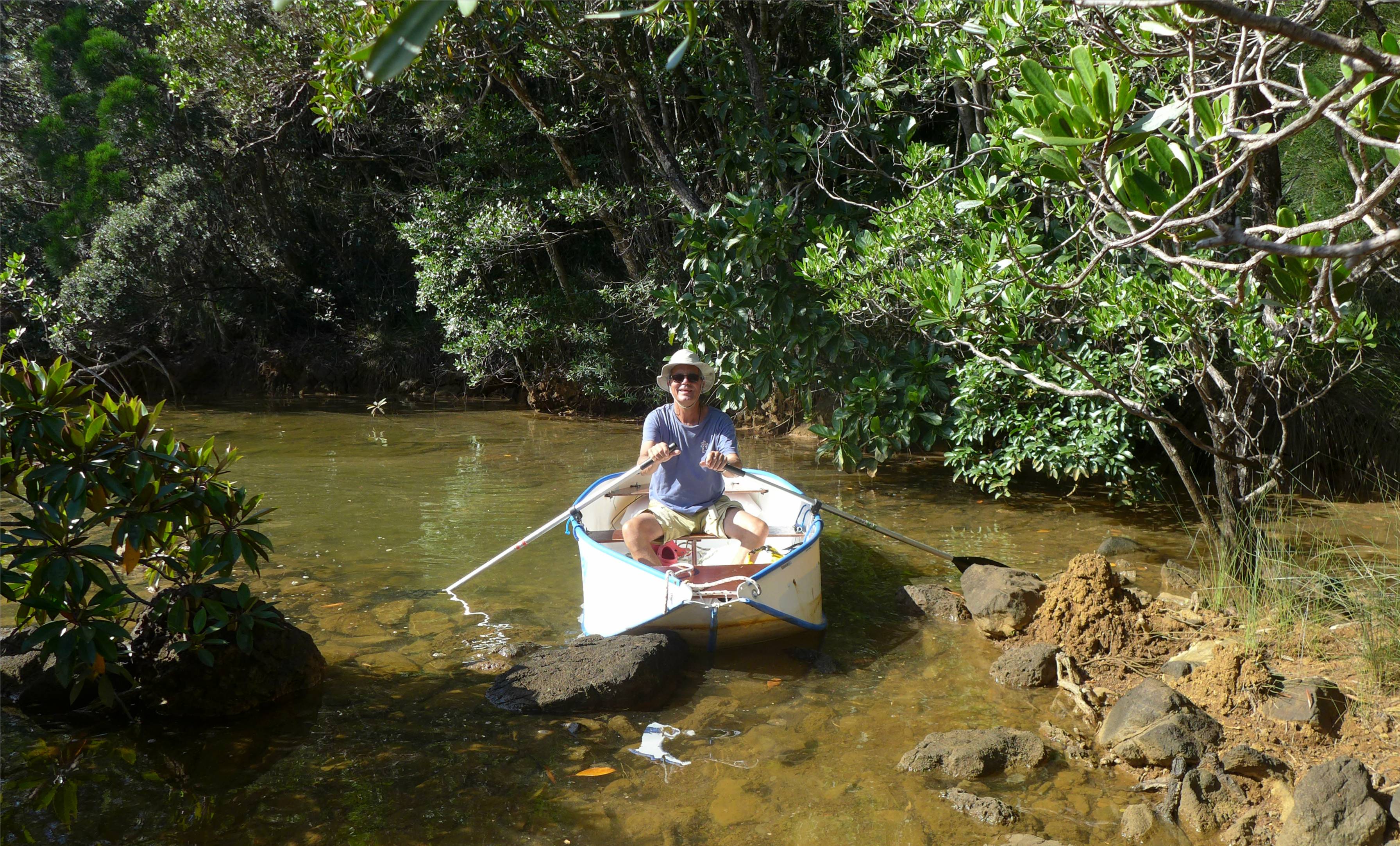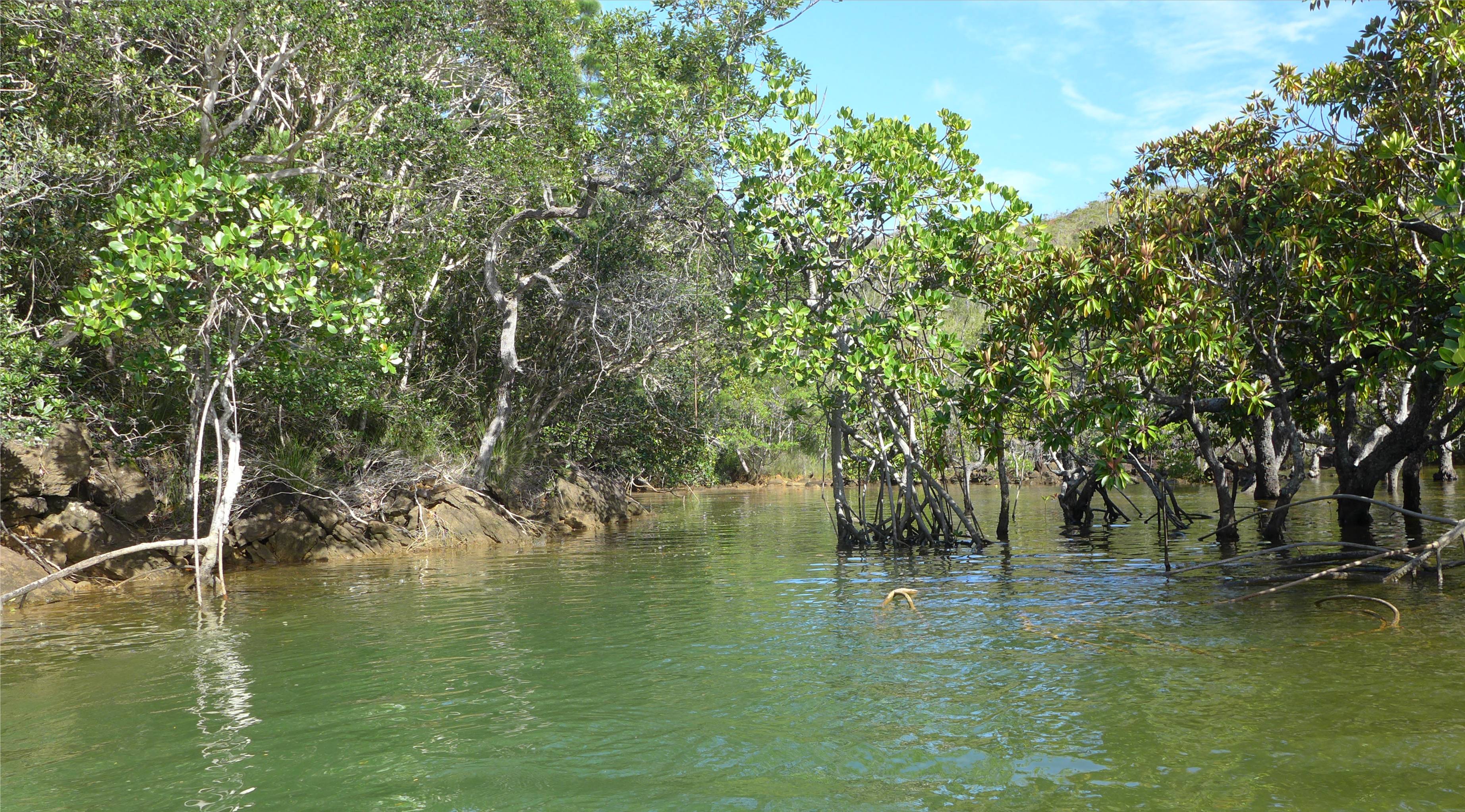 Im Norden der Baie de Prony münden mehrere Flüsse in die große Bucht, außerdem unzählige kleine Bäche. Wir lassen unseren Anker zunächst in der Baie de Kaori, der östlichen Bucht fallen. Unser Ankerplatz ist von grünen Hügeln umgeben. An anderen Stellen haben die grünen Hänge rote Wunden. Bodenerosion ist hier ein großes Problem. Beim intensiven Abbau von Nickel und anderen Rohstoffen wurden ganze Bergkuppen abgetragen, hinzukommt die Abholzung der ursprünglichen Wälder. Zurück bleiben rote Hänge.