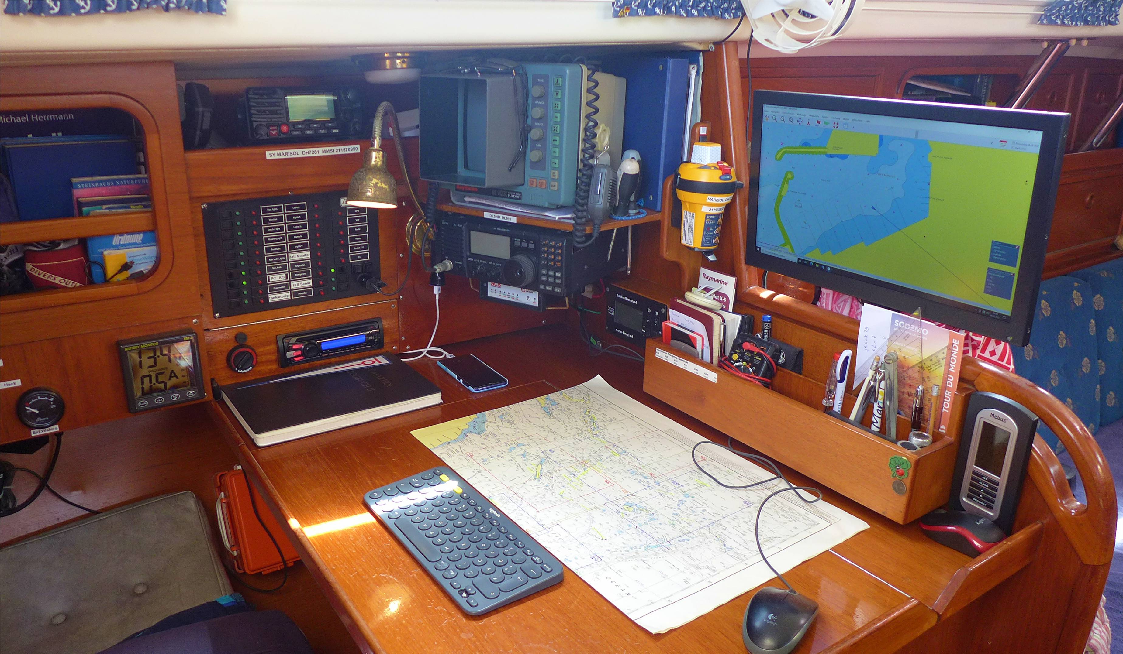 Der Wind soll erst auf Nord dann auf West drehen, da liegen wir hier nicht so gut. Also ziehen wir am nächsten Morgen in den Norden der Baie de Prony um und ankern wieder in der Baie de Kaori. Tatsächlich pustet es ganz ordentlich, aber wir liegen hier sehr ruhig und nutzen die Gelegenheit für einen Haushaltstag. Ein kleiner Wohnungsputz steht an, wir setzten Joghurt an und kochen Milchreis. Und wir haben Zeit für einige kleine Arbeiten. Unsere Mari bekommt eine neue Schalttafel. Zwei Geräte sind nicht mehr in Betrieb und können verschwinden, unser Radio zieht um, so dass es einfacher zu bedienen ist, der Heizungsschalter bekommt einen neuen Platz und ein Teil der Schalttafel soll in Zukunft klappbar sein. Alles was wir brauchen findet sich an Bord. Ein Rest Bootssperrholz passt fast genau, ein Stück Klavierband schrauben wir von einem Brett ab, das wir ohnehin nie benutzen, und die alte Schalttafel wird in Teilen weiter benutzt. Nobbi sägt alles von Hand mit der Japansäge, quält sich einige Zeit mit den Kabeln in der Schalttafel, schmeißt einige Kabel raus die nicht mehr benötigt werden und schließt schließlich alle Geräte wieder an. Der anschließende Check verläuft zufriedenstellend, alle Geräte funktionieren. Das neue Brett muss nun noch lackiert werden, das ist mein Job. Es findet sich ein Marmeladenglas im Farbschapp, auf das ich „Bootslack International + Terpentin“ geschrieben habe. Das ist genau das richtige. Inzwischen ist das Brett viermal lackiert worden. An drei verschiedenen Orten. Eine reisende Baustelle.