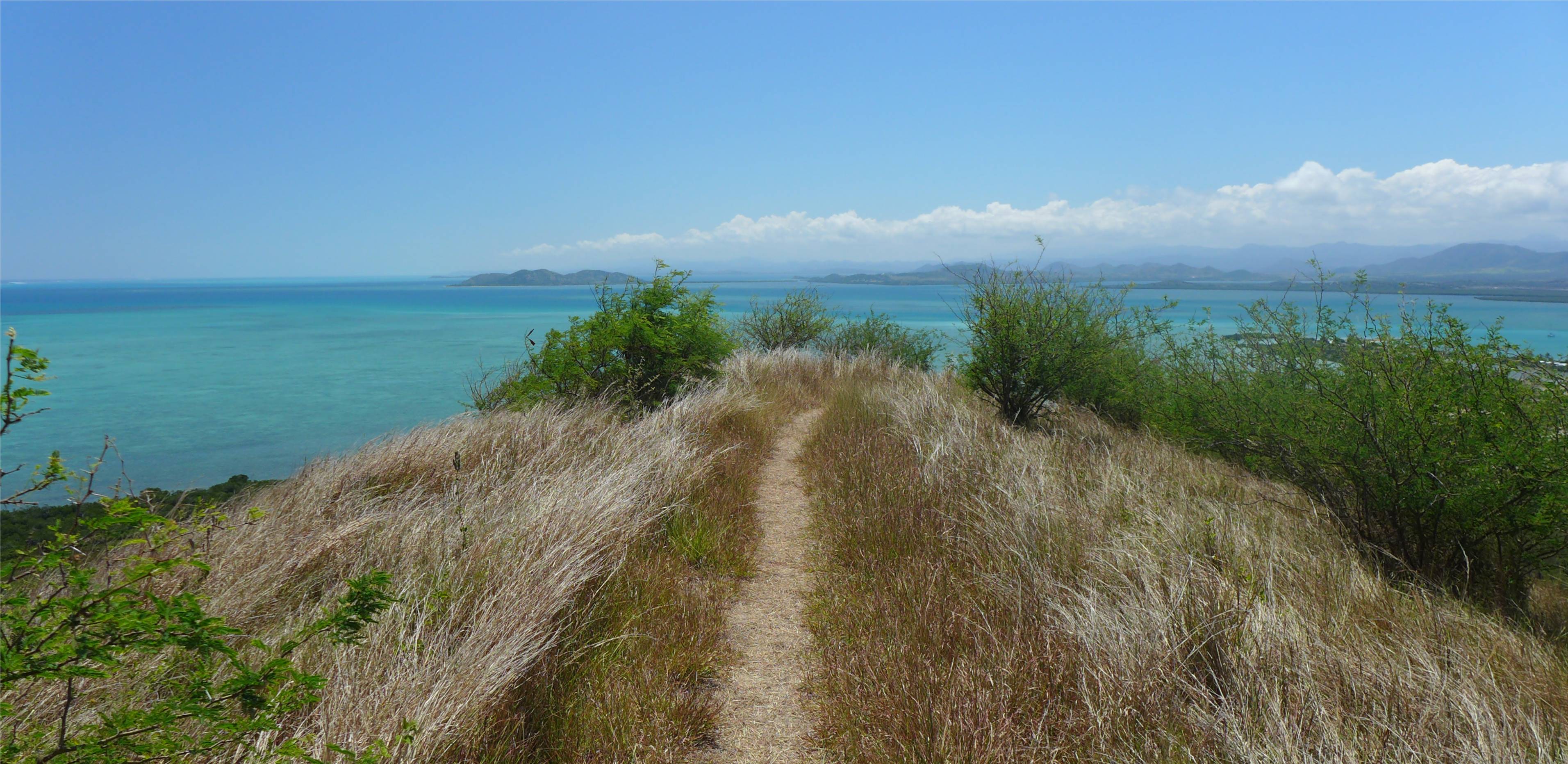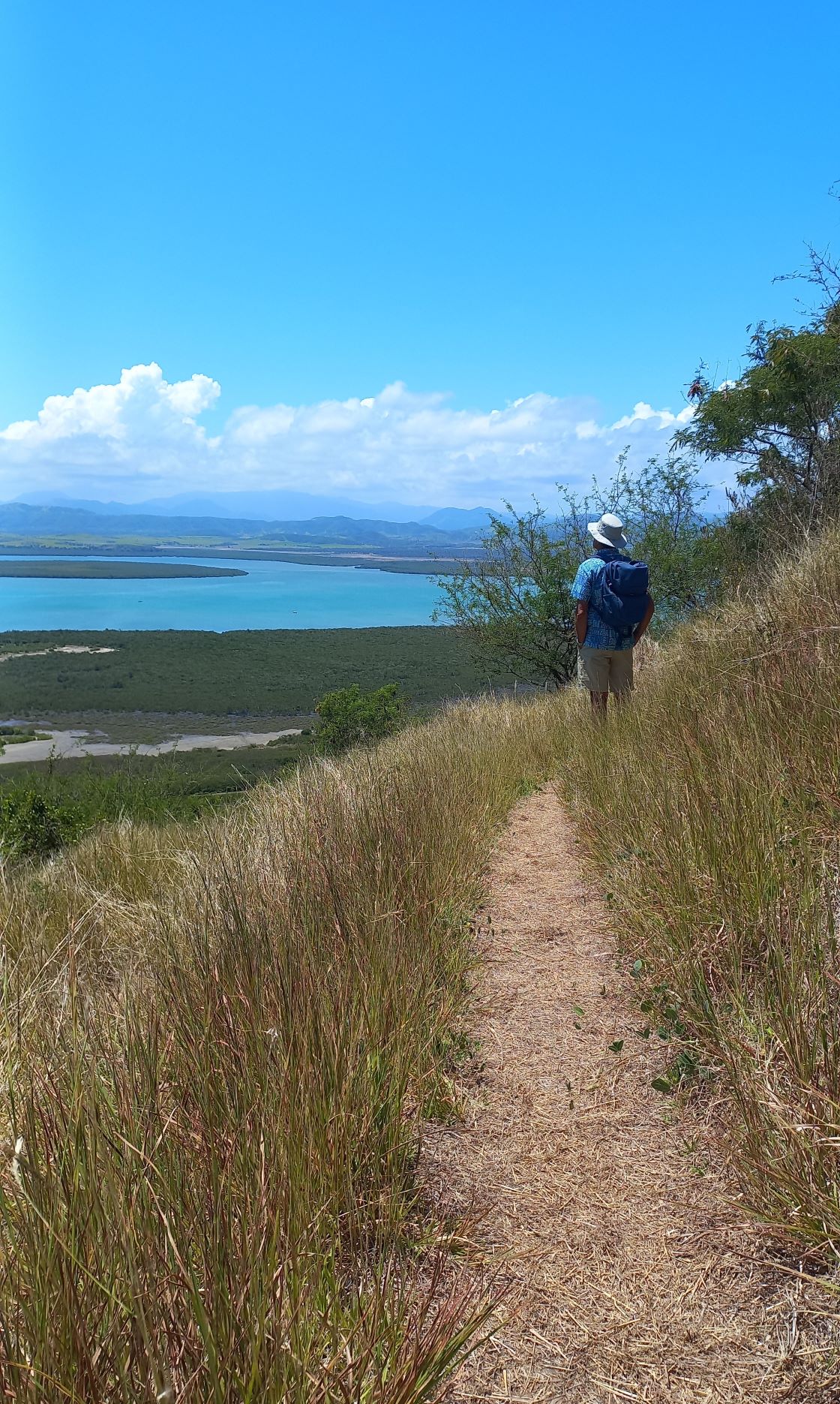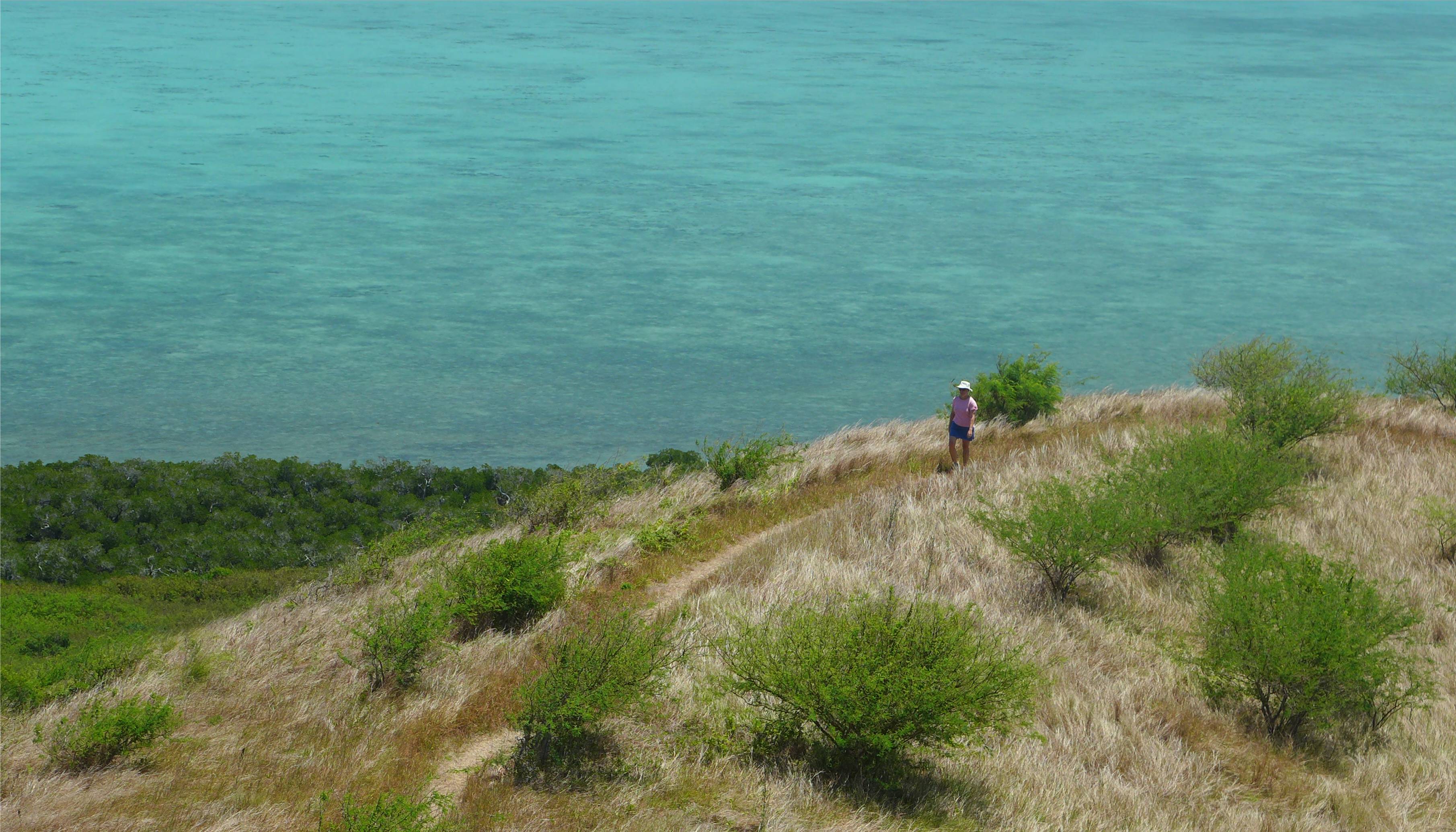 Auf den Ankerplatz hinter Ouano sind wir aufmerksam geworden als wir in der Touri-Info in Noumea ein Faltblatt mit Wanderwegen auf der Landspitze mitgenommen haben. Diese Wege machen wir am nächsten Tag unsicher. Als erstes freuen wir uns über einen Müllcontainer und Wasserhähne. Gelegenheit seinen Müll zu entsorgen hat man an nicht so vielen Orten in der Umgebung. Wir folgen dem Wanderweg den Strand entlang und verlassen den ausgeschilderten Weg, weil wir nur mal kurz um die nächste Ecken gucken wollen und um die dahinter natürlich auch. Der Ausblick über die Küste ist beeindruckend. In der Ferne sieht man die weiße Gischt der brechenden Welle auf dem Außenriff, das flache Wasser leuchtet in allen Tönen von hellgrün bis türkis, das tiefere dunkelblau. Die Konturen der Riffe zeichnen sich in braun ab und hier und da liegt eine dekorative Insel mit weißem Strand herum. Wir kehren auf den Wanderweg zurück, entdecken das Beobachtungsdeck, eine Holzterrasse, von den man auch einen guten Blick hat und steigen dann auf den Hausberg. Also, Haushügel. Die Erhebung ist nur gute hundert Meter hoch, bietet aber einen schönen Rundumblick. Neben der Aussicht begeistert uns die Vegetation. Hier ist es sehr trocken und zwischen den gelblichen Gräsern wachsen viele interessante Blumen. Zum Abschluss sehen wir uns auf dem Campingplatz um, auf dem es ein Restaurant geben soll. Das Restaurant ist montags und dienstags geschlossen, aber der Wirt sehr nett. Alternativ machen wir unsere Pause unter einer Palme am Strand, bevor wir wieder an Bord rudern.