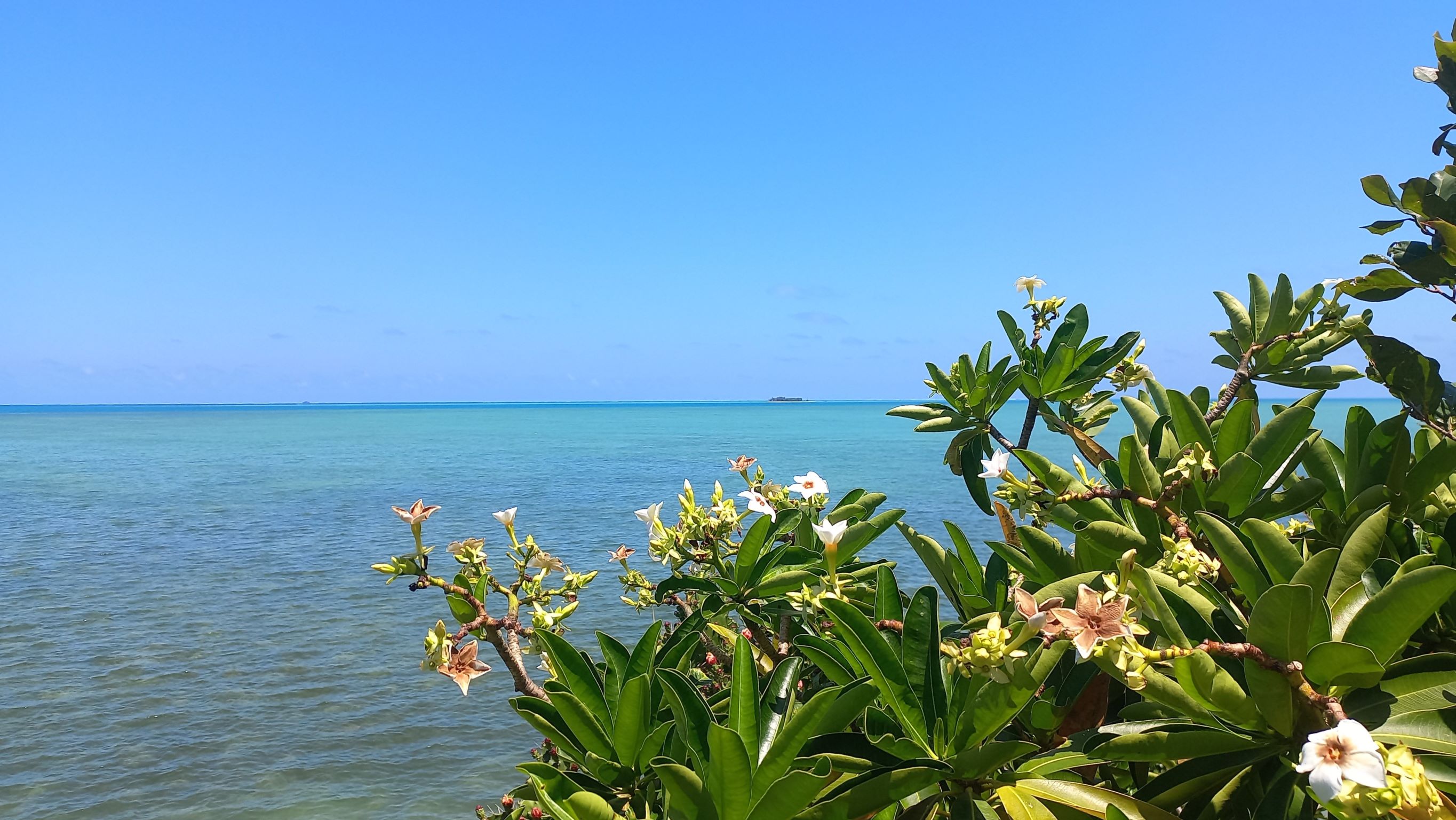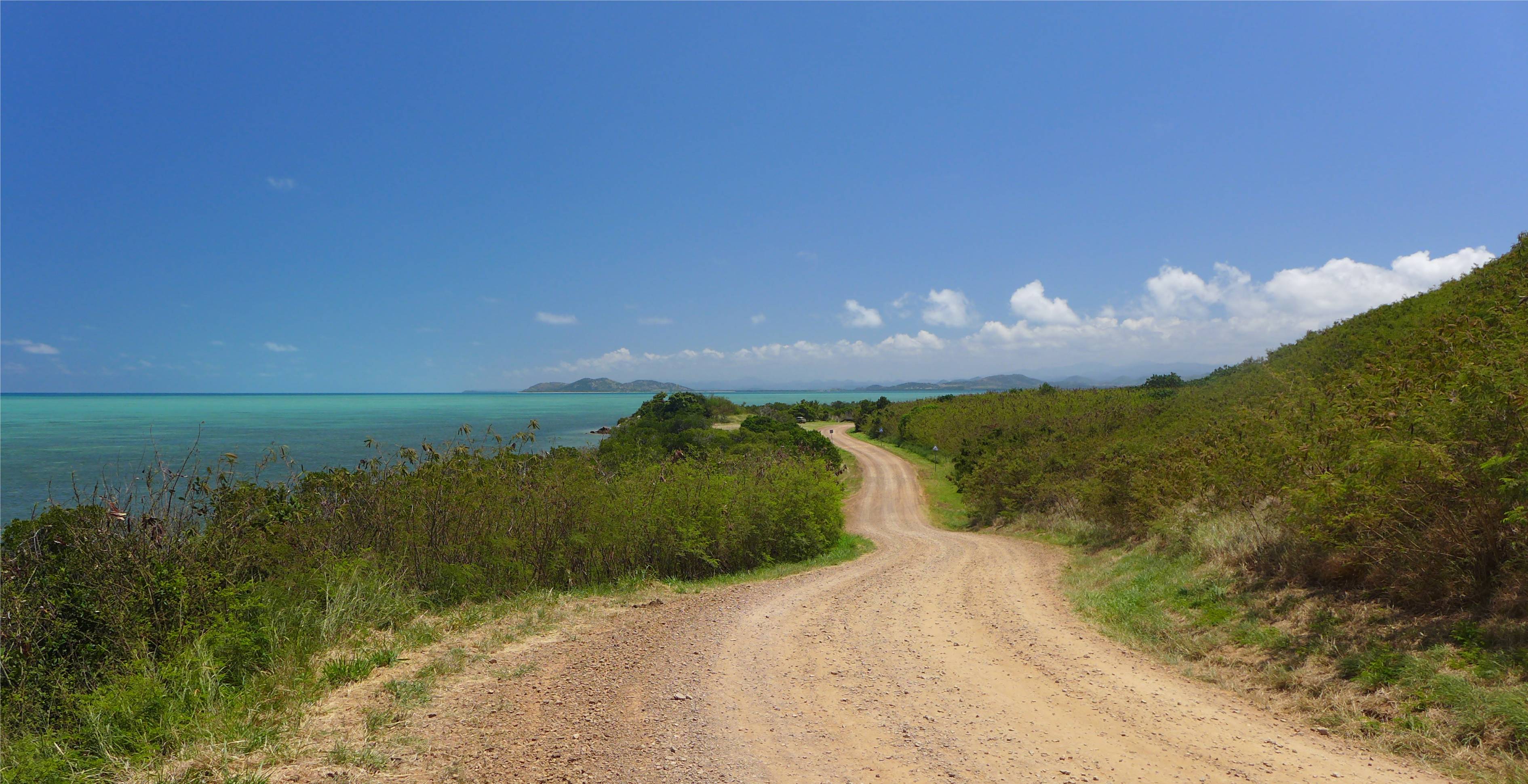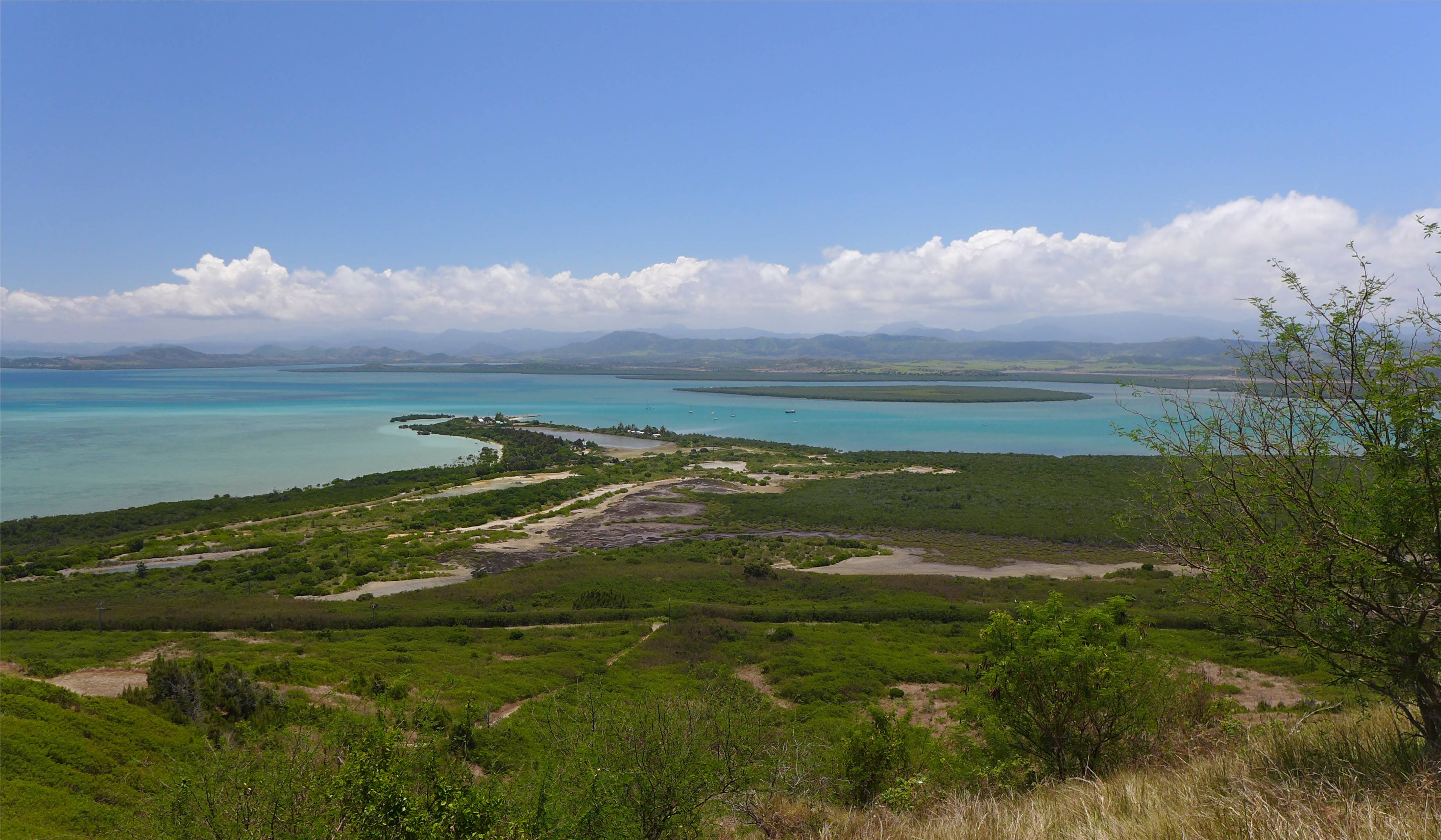 Auf den Ankerplatz hinter Ouano sind wir aufmerksam geworden als wir in der Touri-Info in Noumea ein Faltblatt mit Wanderwegen auf der Landspitze mitgenommen haben. Diese Wege machen wir am nächsten Tag unsicher. Als erstes freuen wir uns über einen Müllcontainer und Wasserhähne. Gelegenheit seinen Müll zu entsorgen hat man an nicht so vielen Orten in der Umgebung. Wir folgen dem Wanderweg den Strand entlang und verlassen den ausgeschilderten Weg, weil wir nur mal kurz um die nächste Ecken gucken wollen und um die dahinter natürlich auch. Der Ausblick über die Küste ist beeindruckend. In der Ferne sieht man die weiße Gischt der brechenden Welle auf dem Außenriff, das flache Wasser leuchtet in allen Tönen von hellgrün bis türkis, das tiefere dunkelblau. Die Konturen der Riffe zeichnen sich in braun ab und hier und da liegt eine dekorative Insel mit weißem Strand herum. Wir kehren auf den Wanderweg zurück, entdecken das Beobachtungsdeck, eine Holzterrasse, von den man auch einen guten Blick hat und steigen dann auf den Hausberg. Also, Haushügel. Die Erhebung ist nur gute hundert Meter hoch, bietet aber einen schönen Rundumblick. Neben der Aussicht begeistert uns die Vegetation. Hier ist es sehr trocken und zwischen den gelblichen Gräsern wachsen viele interessante Blumen. Zum Abschluss sehen wir uns auf dem Campingplatz um, auf dem es ein Restaurant geben soll. Das Restaurant ist montags und dienstags geschlossen, aber der Wirt sehr nett. Alternativ machen wir unsere Pause unter einer Palme am Strand, bevor wir wieder an Bord rudern.