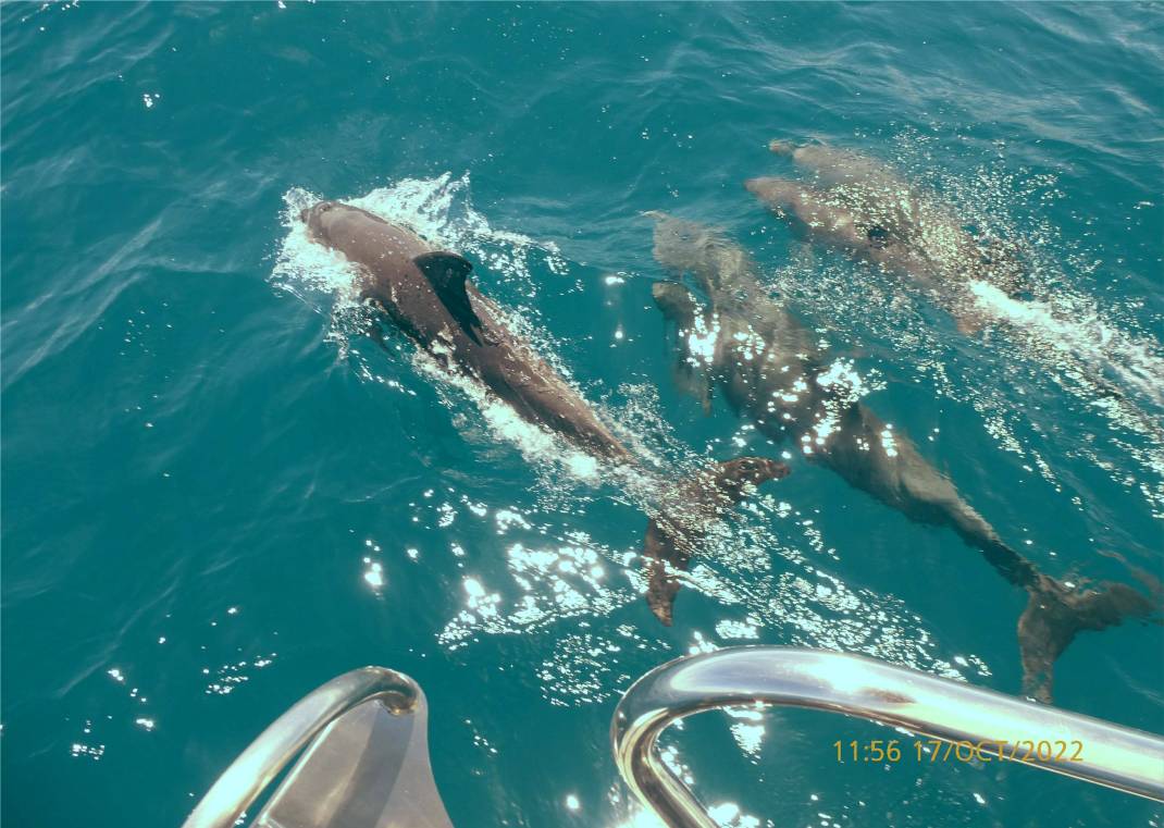 Segelt man innerhalb der Lagune weiter nach Nordwesten, nähert sich das Außenriff immer weiter Grande Terre, der Hauptinsel, an. Irgendwann wird es zwischen Riff und Insel so flach, dass hier für größere Boote die Welt zu Ende ist. Wer weiter an der Küste entlang segeln möchte muss hier das schützende Riff durch einen der vielen Pässe verlassen. Kurz vor der Sackgasse zwischen Riff und Insel liegt die Halbinsel Ouano, unser nächster Ankerplatz. Wir segeln ganz ruhig dahin. Das Wasser der Lagune leuchtet türkis und wir bekommen Delfinbesuch. Eine kleine Familie aus vier Tieren begleitet uns. Die drei erwachsenen Tiere wollen dem Delfinbaby anscheinend ein Segelboot zeigen. Eins der Tiere scheint großen Spaß am Spiel mit Mari zu haben, immer wieder schwimmt es ganz dicht vorm Bug, dreht sich auf den Rücken und schwimmt Bauch oben an Maris Bug. Wir können uns gar nicht stattsehen.