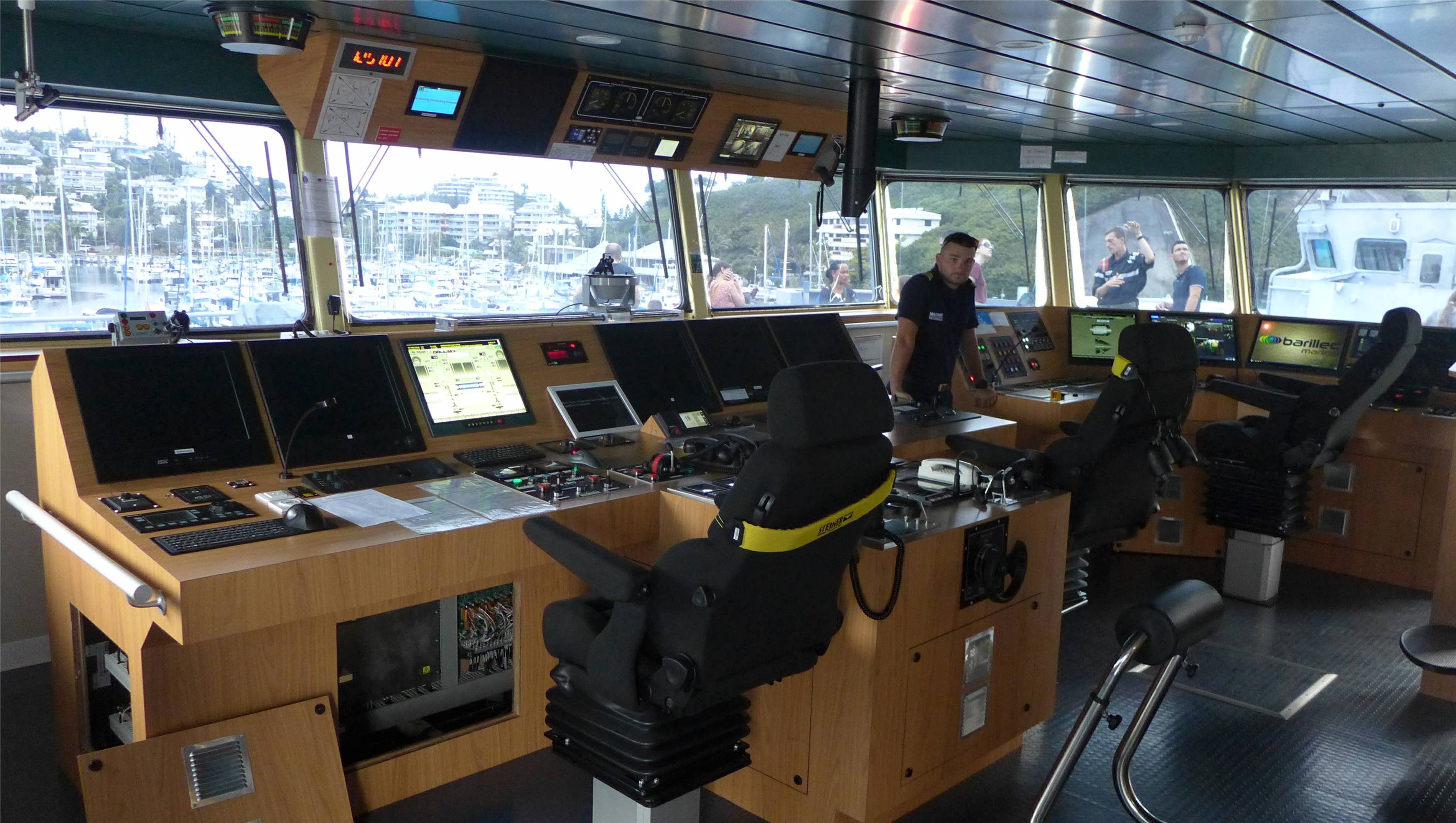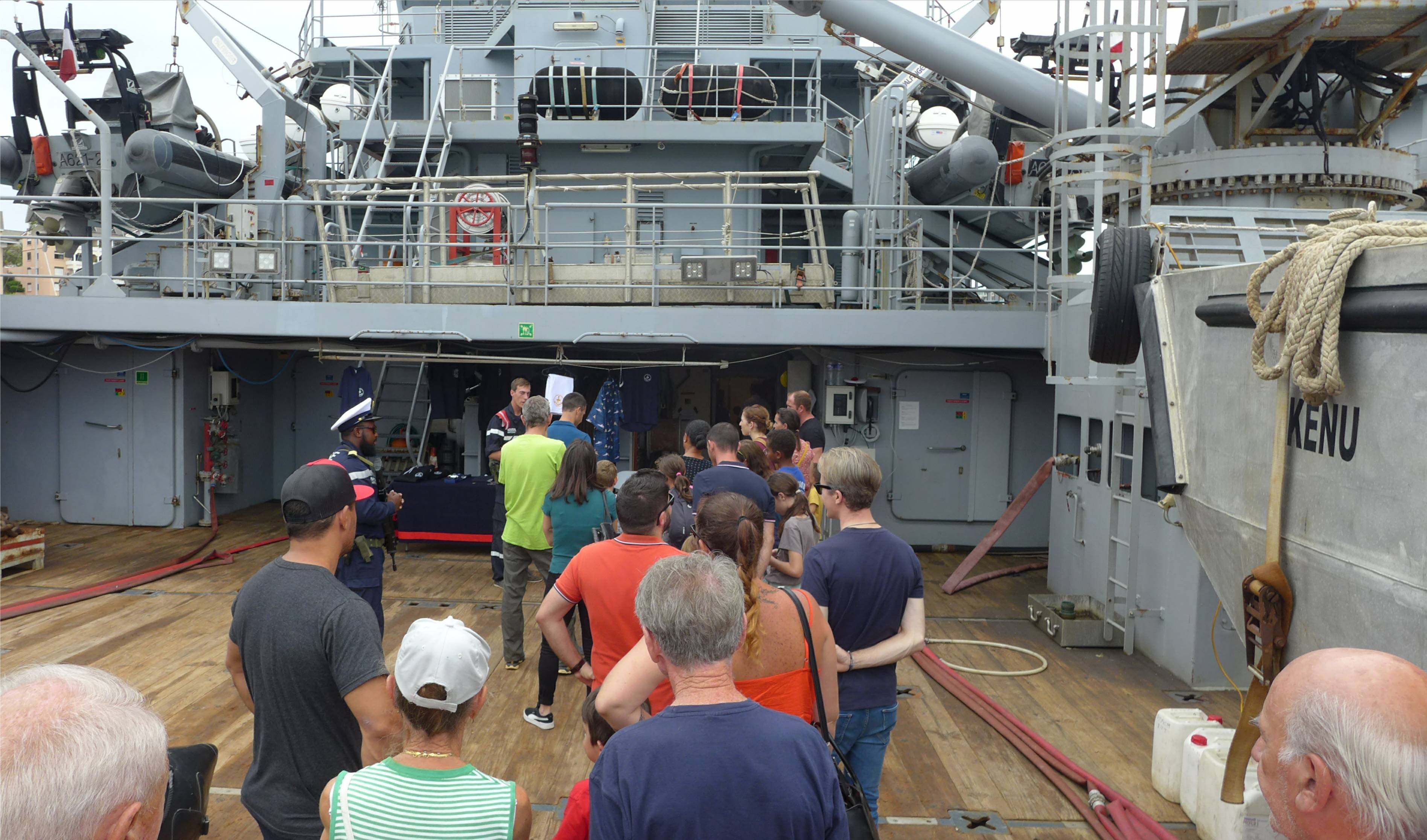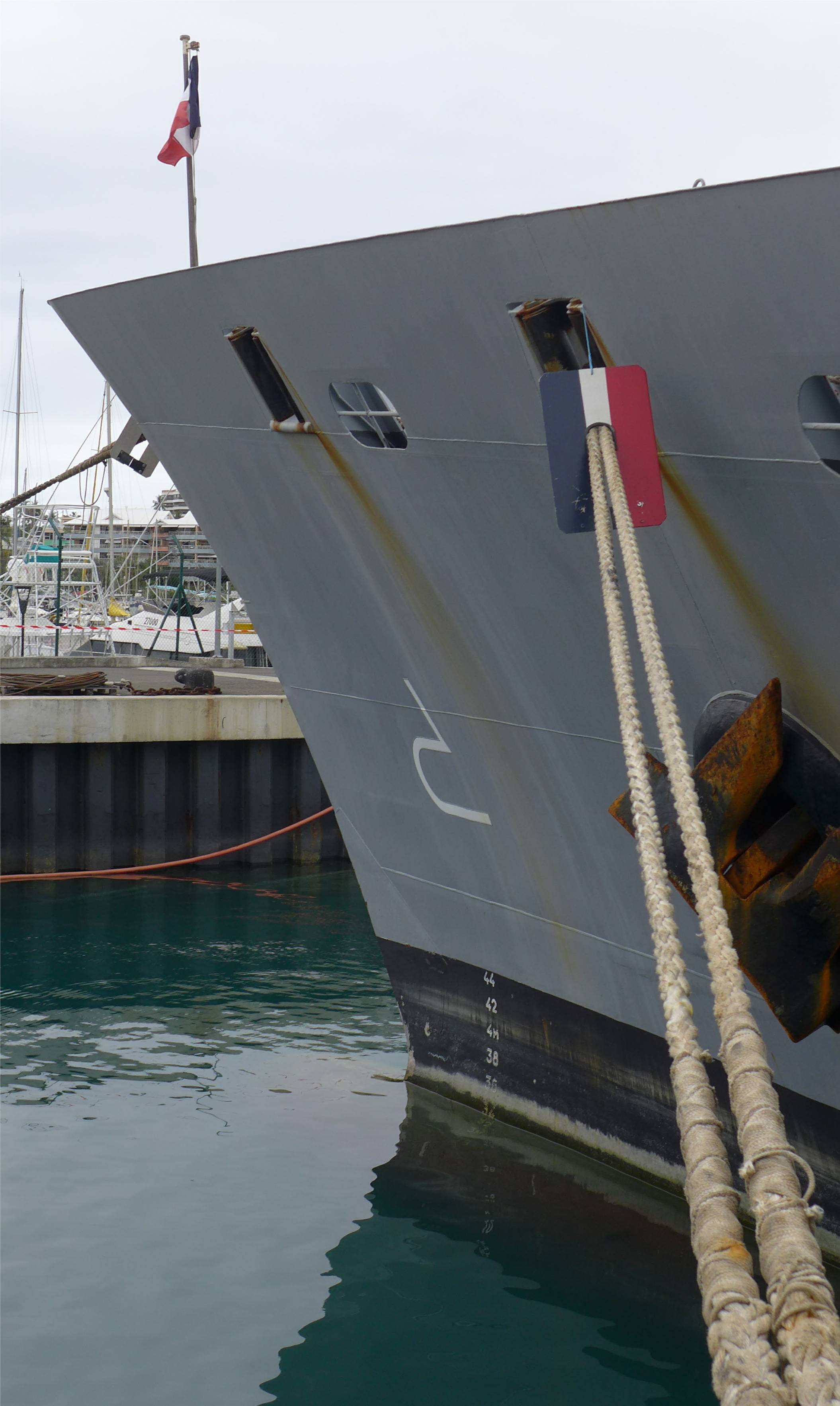 Am allerbesten hat es uns natürlich gefallen, dass die Schiffe besichtigt werden konnten. Hier liegen eine ältere Fregatte und ein Versorger. Wir entscheiden uns für den Versorger und stellen uns für die Führung an. An Deck können wir uns schon umsehen, während wir warten. Während des ausführlichen Rundgangs sehen wir uns nicht nur an Deck um, besuchen die Mannschaftsmesse, die Unterkünfte der Crew und die Kabine des Kapitäns, wir dürfen auch aufs Oberdeck und die Brücke. Wir verstehen nicht alles, aber doch genug, um einen guten Eindruck zu bekommen und sind beeindruckt von der modernen Brücke. Nobbi ist neidisch und hätte nun auch gerne ein Control Panel, das Druck und Temperatur an jedem Zylinderkopf anzeigt. Das schönste Detail sind die Rattenbleche in den französischen Farben. Wir haben keine Rattenbleche an Bord, aber wenn wir welche hätten, dann würde ich das Marisol-Logo draufmalen.