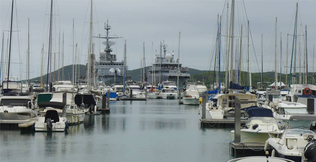 Am allerbesten hat es uns natürlich gefallen, dass die Schiffe besichtigt werden konnten. Hier liegen eine ältere Fregatte und ein Versorger. Wir entscheiden uns für den Versorger und stellen uns für die Führung an. An Deck können wir uns schon umsehen, während wir warten. Während des ausführlichen Rundgangs sehen wir uns nicht nur an Deck um, besuchen die Mannschaftsmesse, die Unterkünfte der Crew und die Kabine des Kapitäns, wir dürfen auch aufs Oberdeck und die Brücke. Wir verstehen nicht alles, aber doch genug, um einen guten Eindruck zu bekommen und sind beeindruckt von der modernen Brücke. Nobbi ist neidisch und hätte nun auch gerne ein Control Panel, das Druck und Temperatur an jedem Zylinderkopf anzeigt. Das schönste Detail sind die Rattenbleche in den französischen Farben. Wir haben keine Rattenbleche an Bord, aber wenn wir welche hätten, dann würde ich das Marisol-Logo draufmalen.