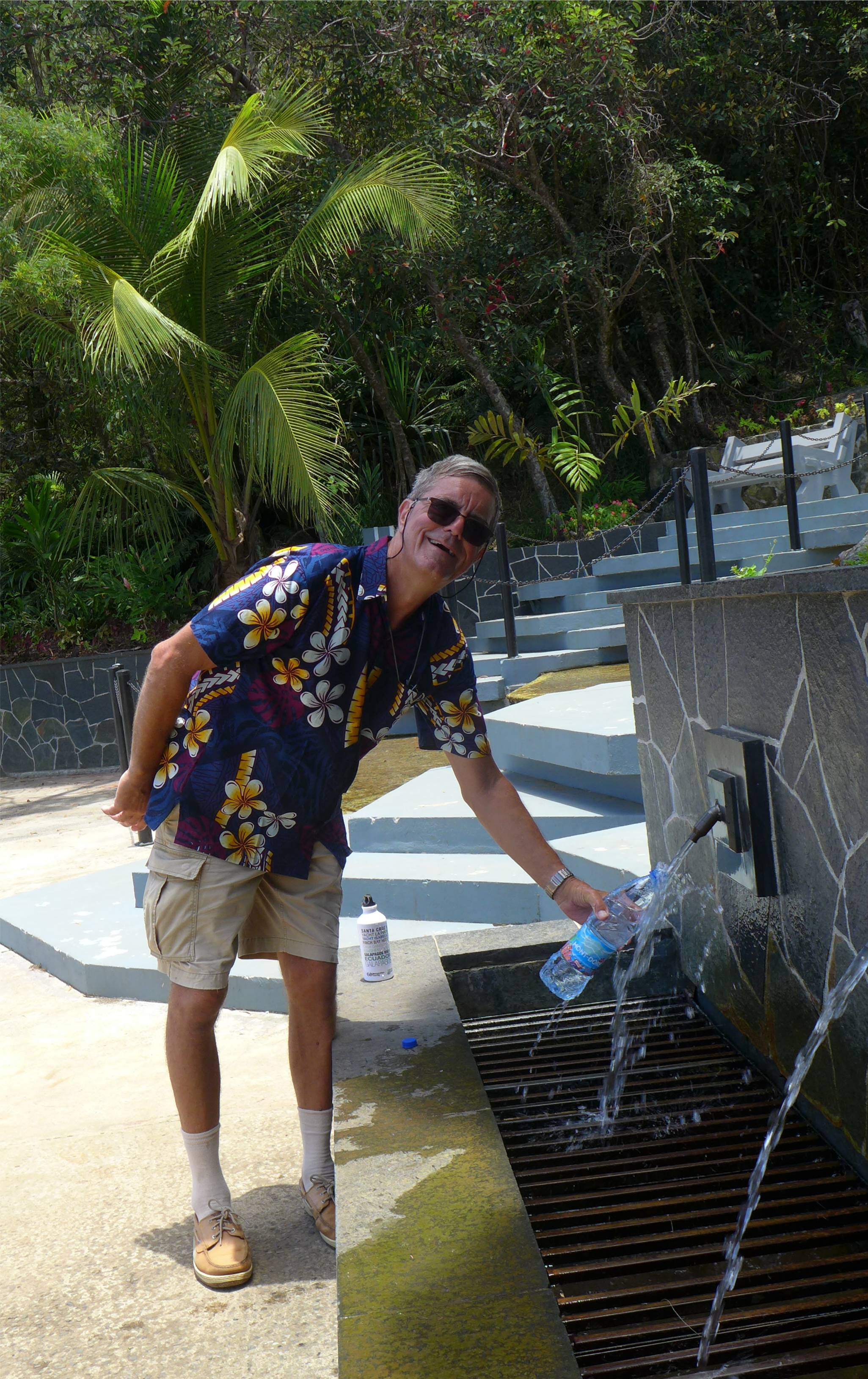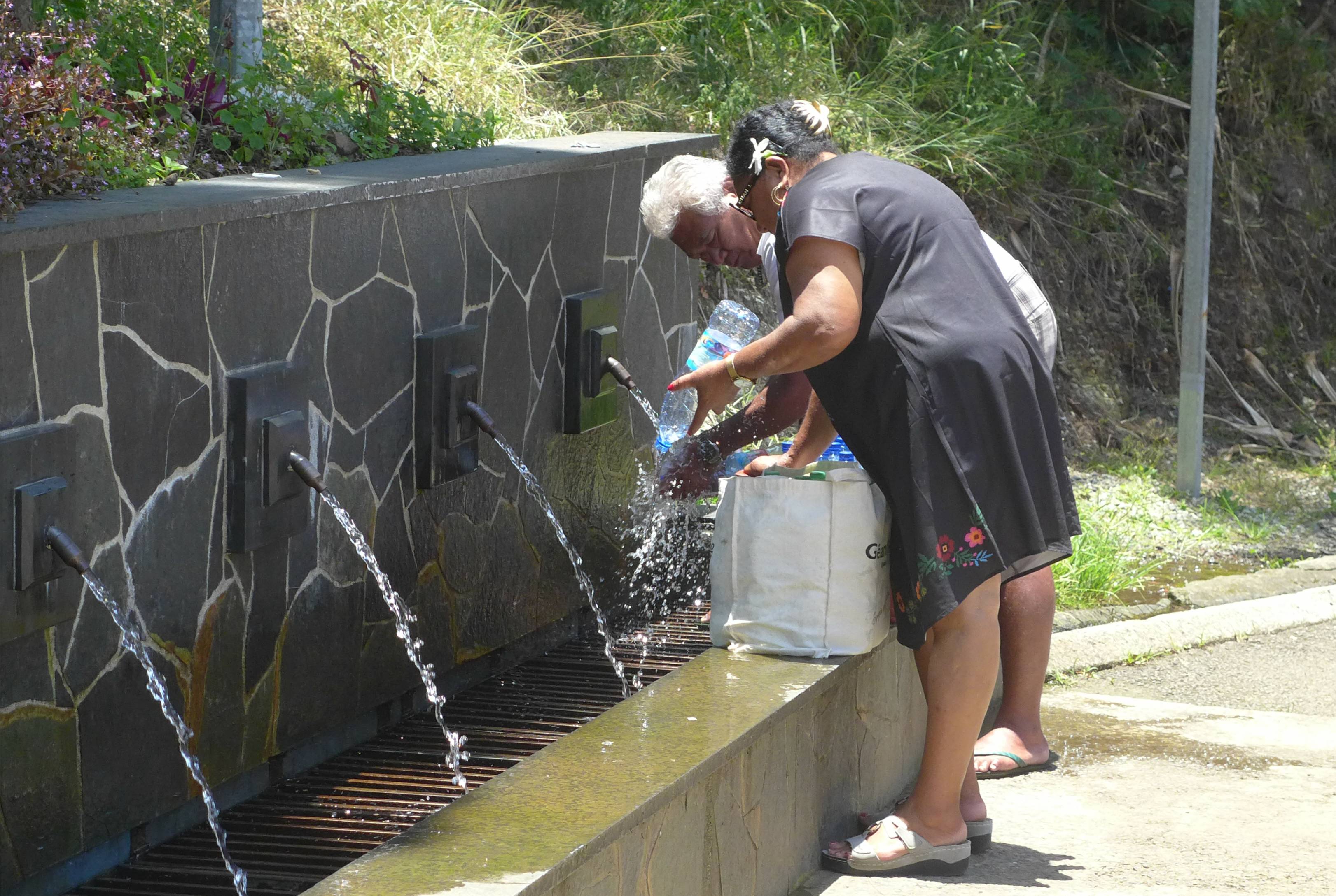 In der Karte ist ein Aussichtspunkt bei einer Quelle eingezeichnet. Mit dem Auto sind es nur wenige Kilometer, der Aussichtpunkt ist nicht zugänglich, die Quelle wird aber fleißig besucht. Das Wasser sprudelt aus einer Anzahl von Rohren und viele Menschen füllen eine Wasserflasche nach der anderen. Das Wasser der Mont Dore Quelle wird nur 200m weiter in Flaschen gefüllt und ist in jedem Supermarkt erhältlich. Wir haben unsere Kanister nicht eingepackt und füllen nur unsere beiden Wasserflaschen.