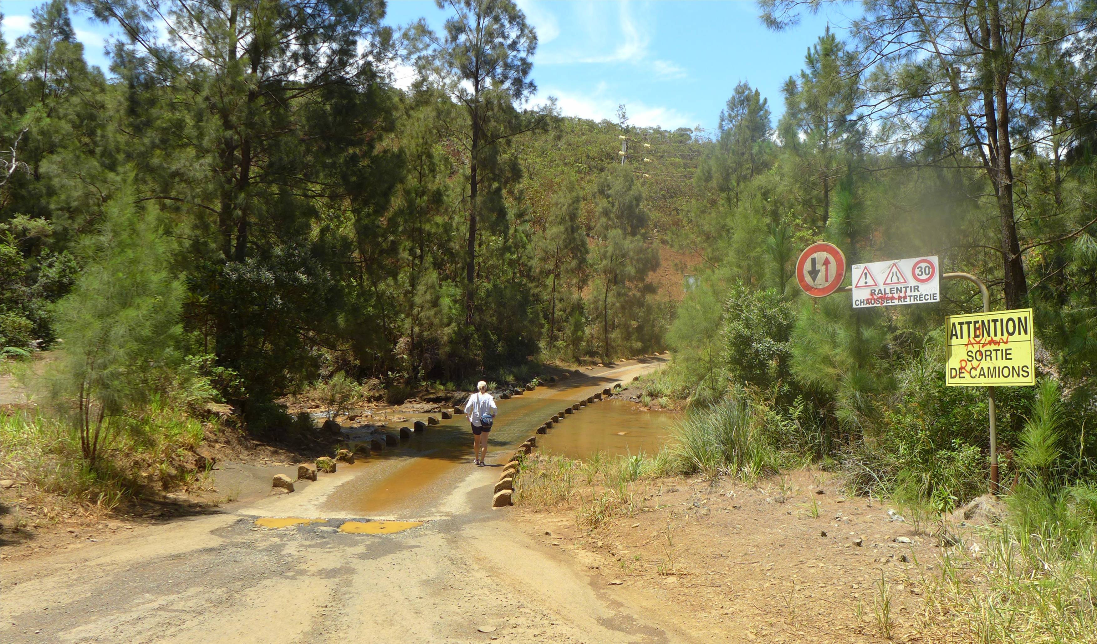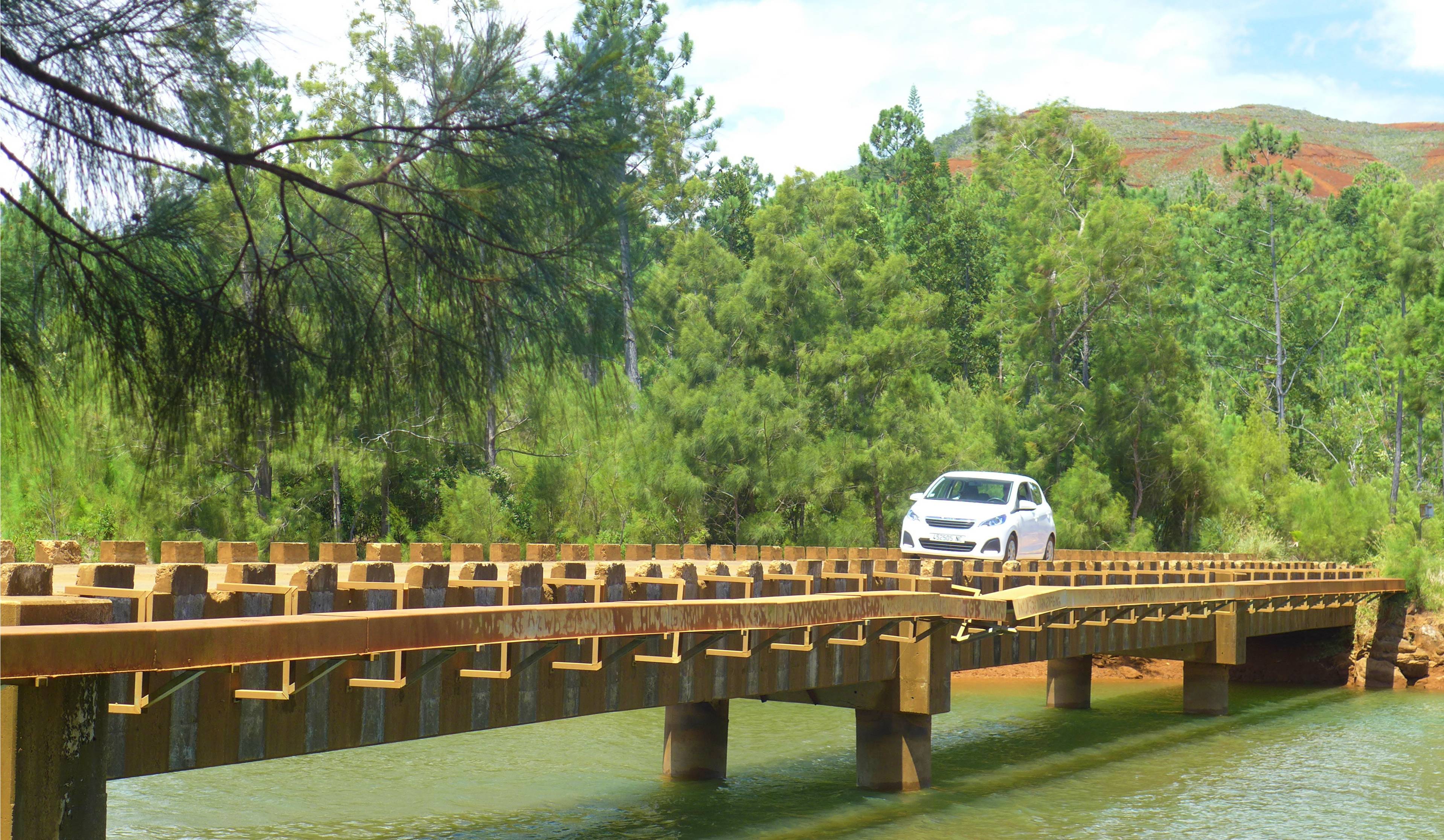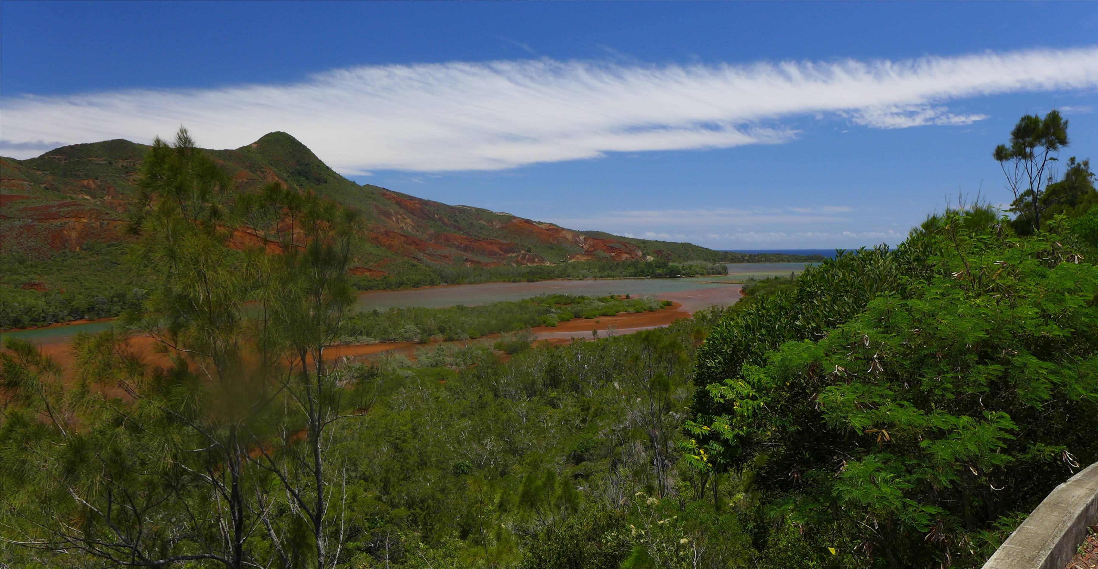 Nun folgen wir der Straße entlang der Küste und halten immer mal wieder. Die Straße wird bald einspurig und wir treffen nur selten andere Autos. Eine schmale Brücke führt über den Rivière des Pirogues, einen flachen Fluss. Ich finde die Brücke etwas unheimlich, Nobbi macht sie natürlich Spaß. Ein paar Kilometer weiter führt die Straße durchs Wasser, das wollen wir unserem fast neuen Peugeot 108 dann doch nicht zumuten. Außerdem sehen wir auf der anderen Seite hochbeinige Trucks in hohem Tempo über die sandige Piste jagen. Hier scheint es vorbei zu sein mit der Idylle, wir haben uns anscheinend einem Nickelabbaugebiet genähert.