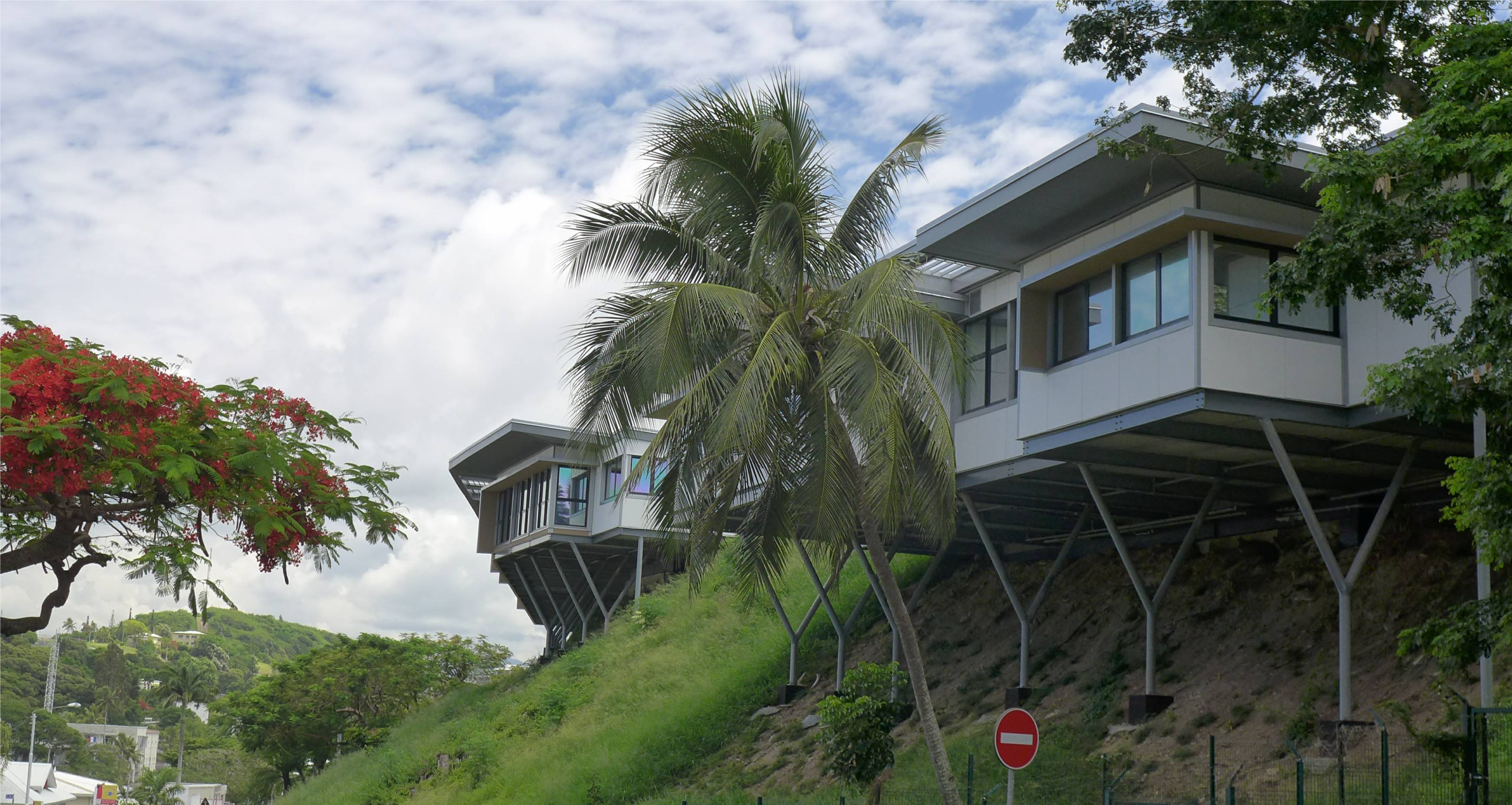 Das moderne Gerichtsgebäude fällt auf, einige Gebäudeteile stehen auf Stelzen am Hang. Vom Hügel aus, können wir uns auch die anderen Gebäude ansehen.
