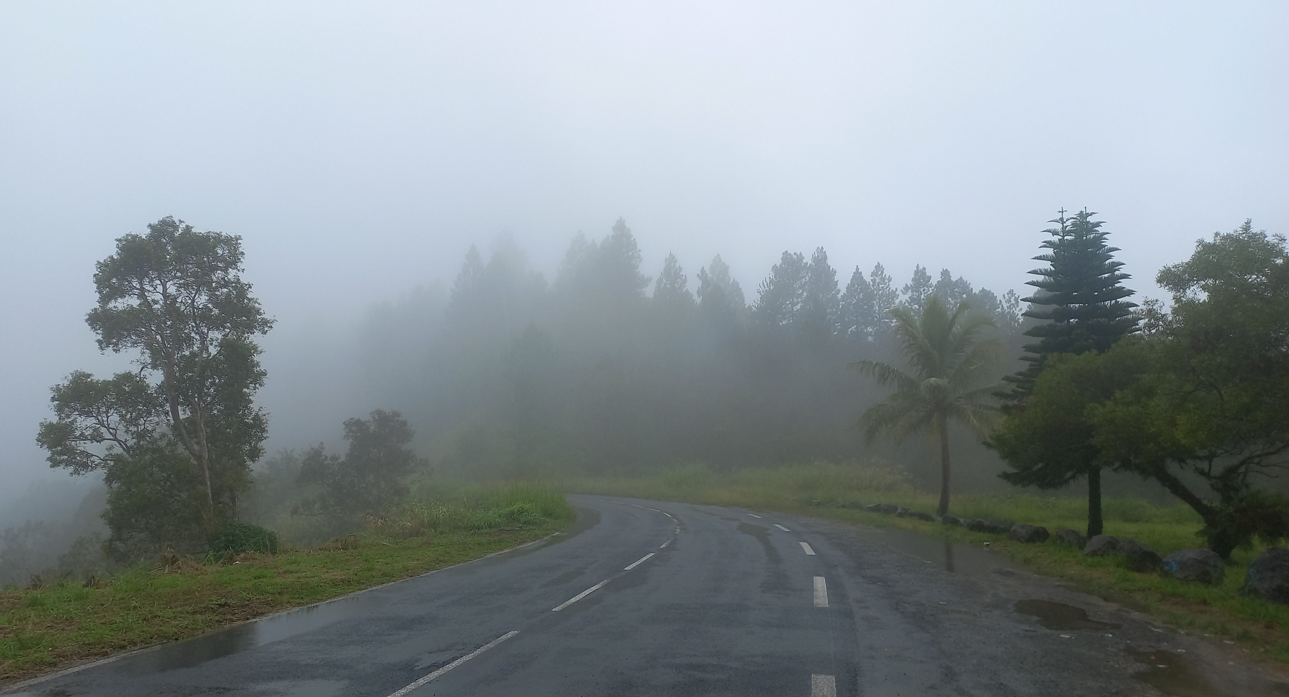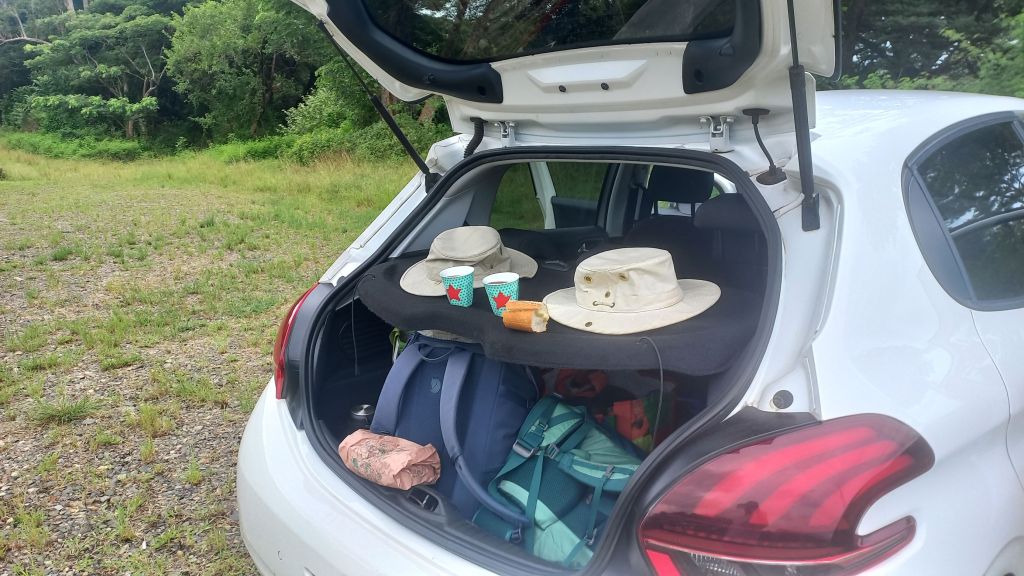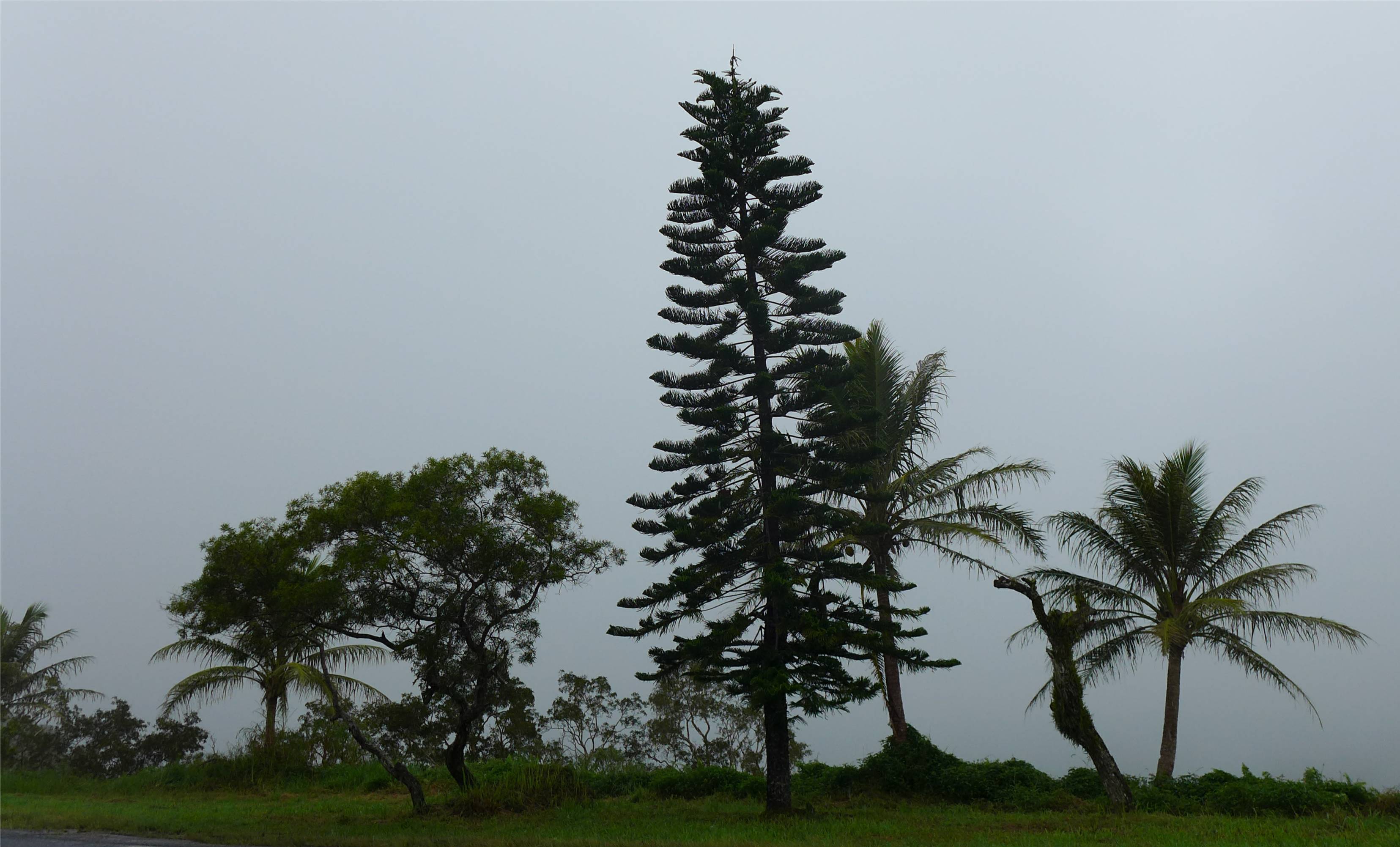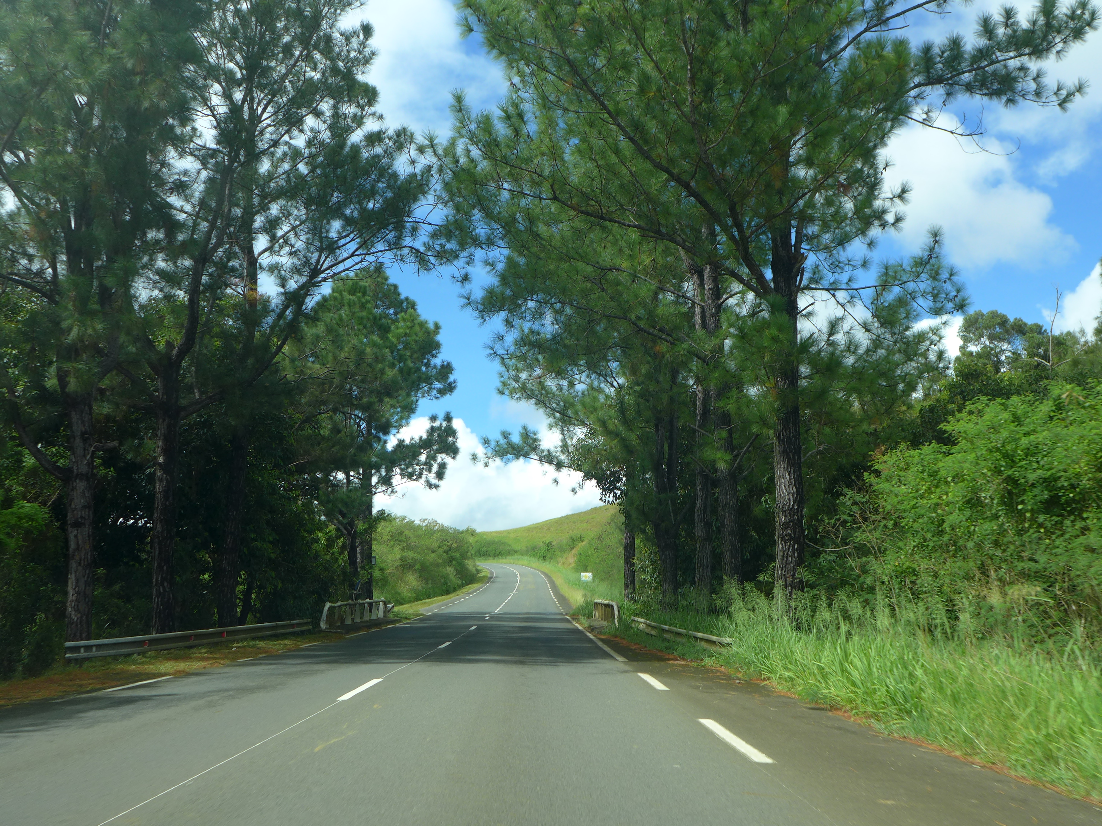 Wir entscheiden uns trotzdem eine Tour zu machen und buchen nach einigem Hin und Her zwei Übernachtungen. Am Samstag starten wir zeitig. Vor uns liegen 370 km, eine Strecke die uns auf deutschen Autobahnen nicht lang vorkäme, aber die Berichte über die Straßenverhältnisse sind gemischt. Zunächst geht es 170 km die Westküste entlang bis Bourail. Diese Strecke kennen wir schon, hier waren wir vor einigen Wochen zum Wandern. Unterwegs legen wir eine kleine Teepause ein, ansonsten wollen wir Meilen machen. Nach Bourail biegen wir ab, hier geht es für uns quer über die Insel an die Ostküste. Ein Gebirge, das sich über die ganze Insel zieht, teilt die fast 400km lange Insel in einen feuchten Osten und einen trockenen Westen. Die höchsten Berge sind bis zu 1600m hoch, die Straße verläuft aber die meiste Zeit in einem Flusstal und schlängelt sich zwischen den Bergen durch.