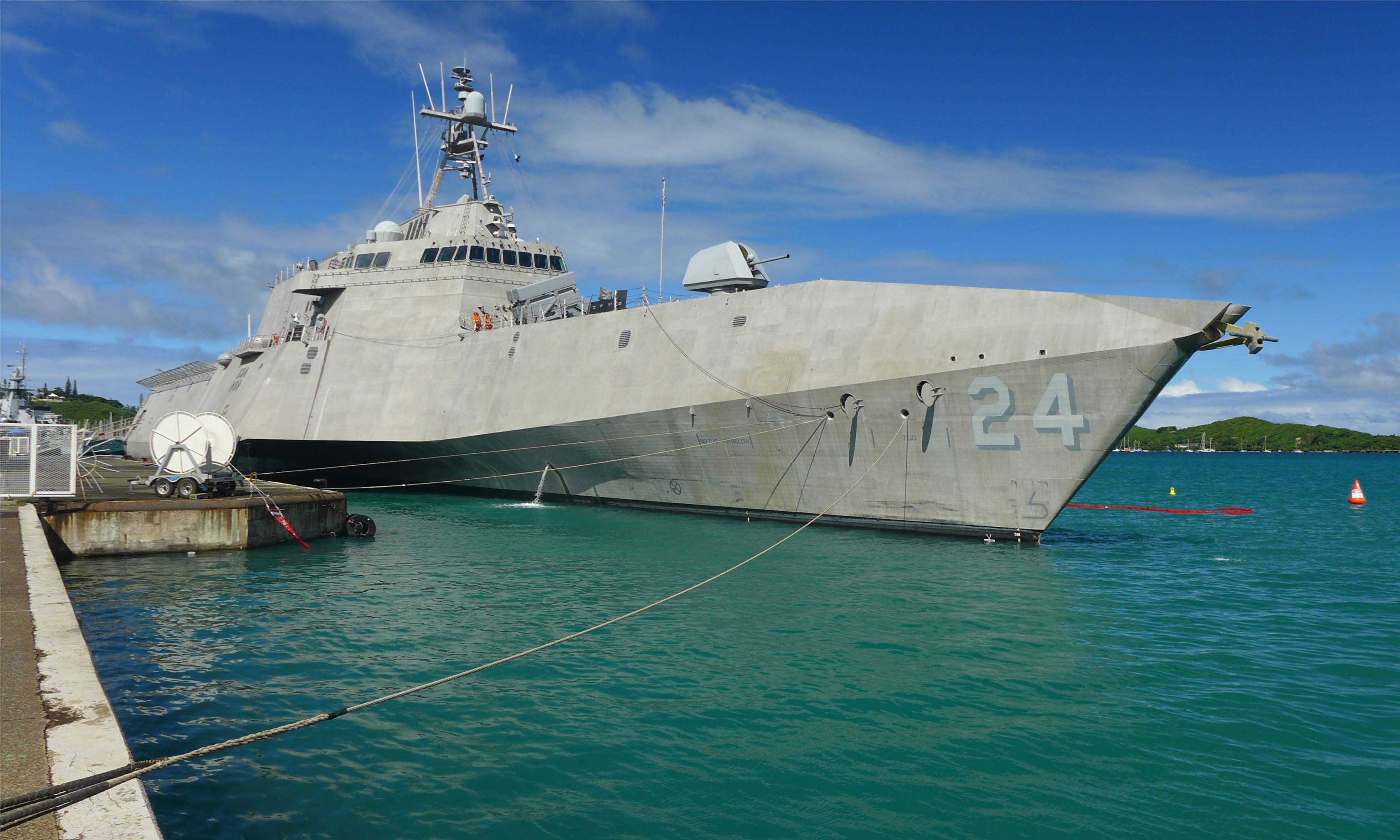 Die Oakland ist ein ungewöhnliches Schiff. Ein Trimaran. Von achtern ziemlich hässlich, von vorne schnittig. Wir wollen wissen, was es kann und Google hilft uns weiter. Die Fregatte der Independence-Klasse ist schnell. Sehr schnell, maximal 45kn, leer noch schneller, ergibt die Recherche. Der fast 130 m lange Trimaran ist hauptsächlich aus Alu und der Wasserstrahlantrieb bekommt seine Kraft aus Dieselmotoren und Gasturbinen. Natürlich ist auch dieses Schiff ordentlich bewaffnet, aber da kenn ich mich nicht gut aus und es interessiert mich auch wenig. Interessanter finde ich die anderen Features, zum Beispiel hat es eine RoRo-Rampe, um schnell Fahrzeuge aufnehmen zu können, und Platz für Helikopter und Drohnen.