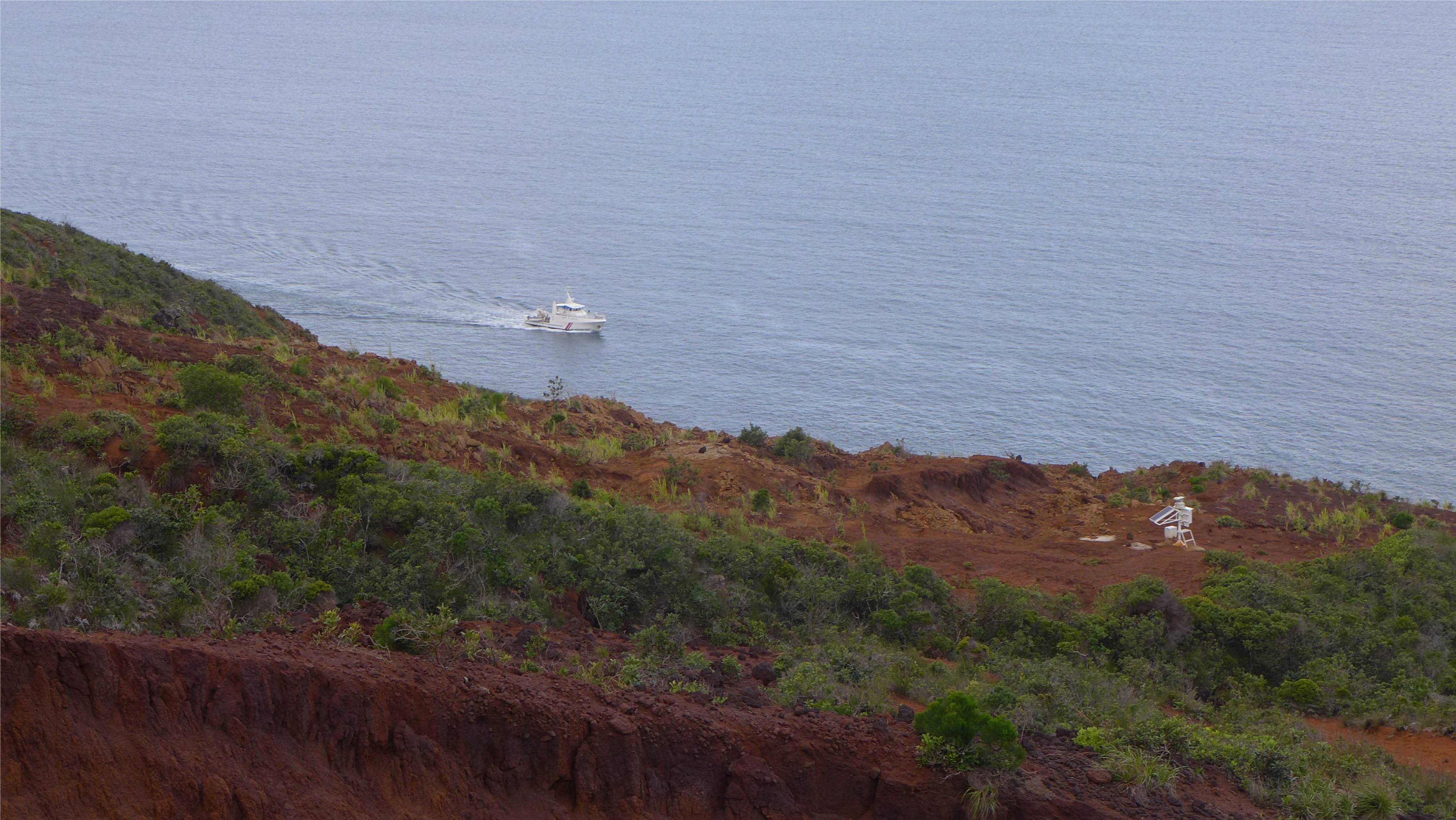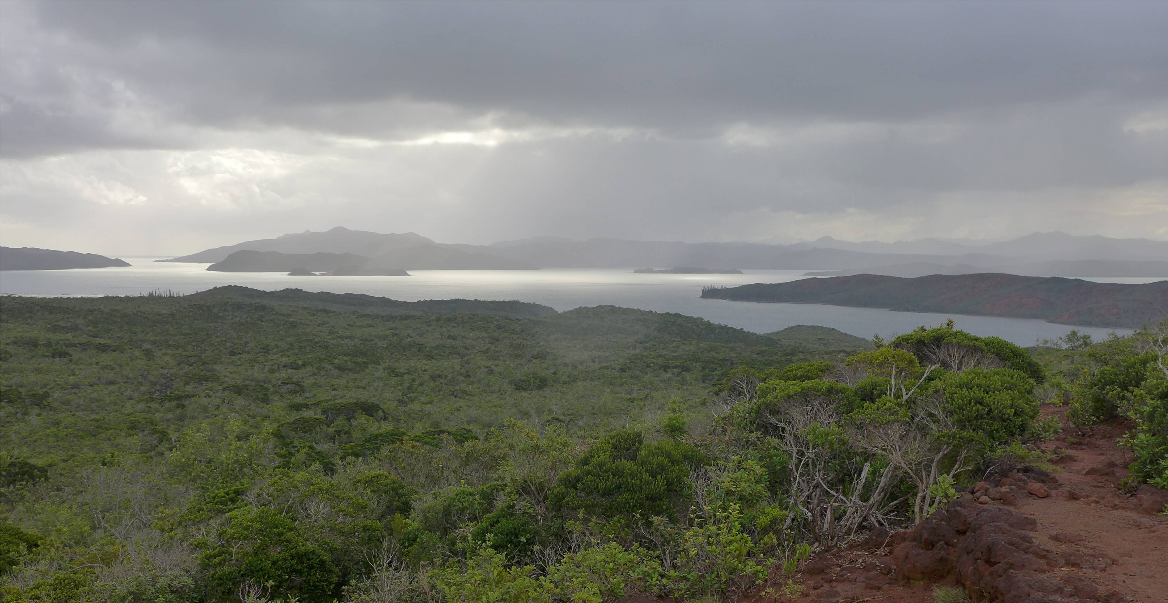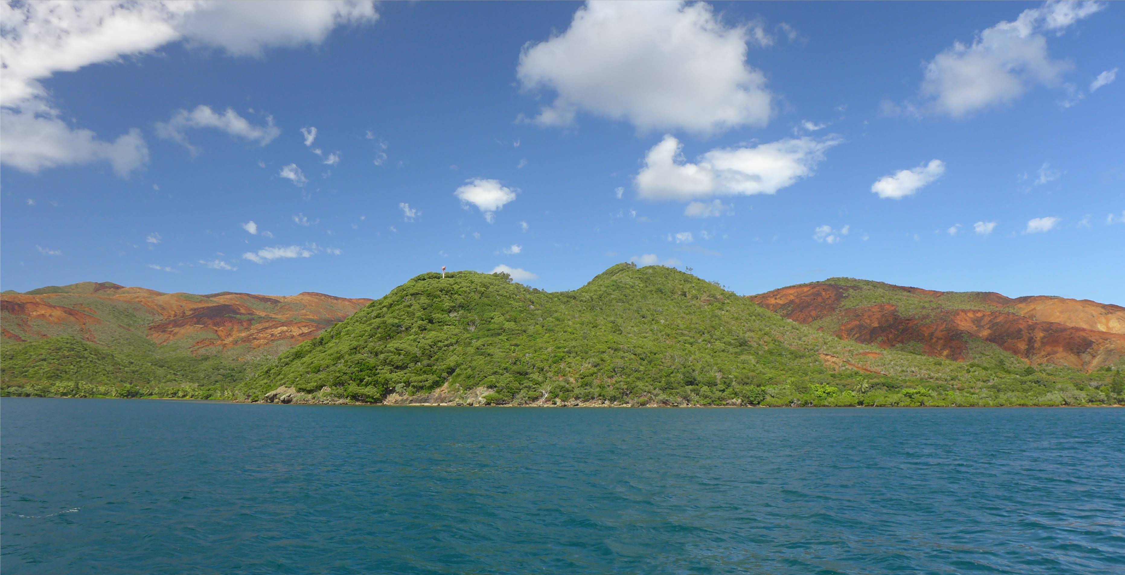 Wir segeln bis in den Canal Woodin und gehen im Norden der Insel Ouen vor Anker. Nachts läuft der Schwell in die Bucht und schüttelt uns durch. Am nächsten Tag hat der Wind auf Süd gedreht und wir segeln nach dem Frühstück in die Anse Majic und legen uns dort an eine Boje. Wir wollen noch einmal zum Leuchtturm laufen, wir waren im September bereits einmal dort. Leider ist das SUP ziemlich platt, ich wäre gerne mit dem Ding an den Strand gepaddelt. Wir falten also unser Bananaboot auseinander und rudern ans rote Ufer. Die kleine Wanderung macht uns wieder Spaß und der Blick über die Lagune ist toll. Irgendwann reißen wir uns los, es wird jetzt früh dunkel, wir müssen zurück zum Boot. Wir verzurren die Banane wieder am Seezaun und spülen das Deck. Diese rote Erde färbt unglaublich, wie werden einige permanente Flecken als Andenken mitnehmen.