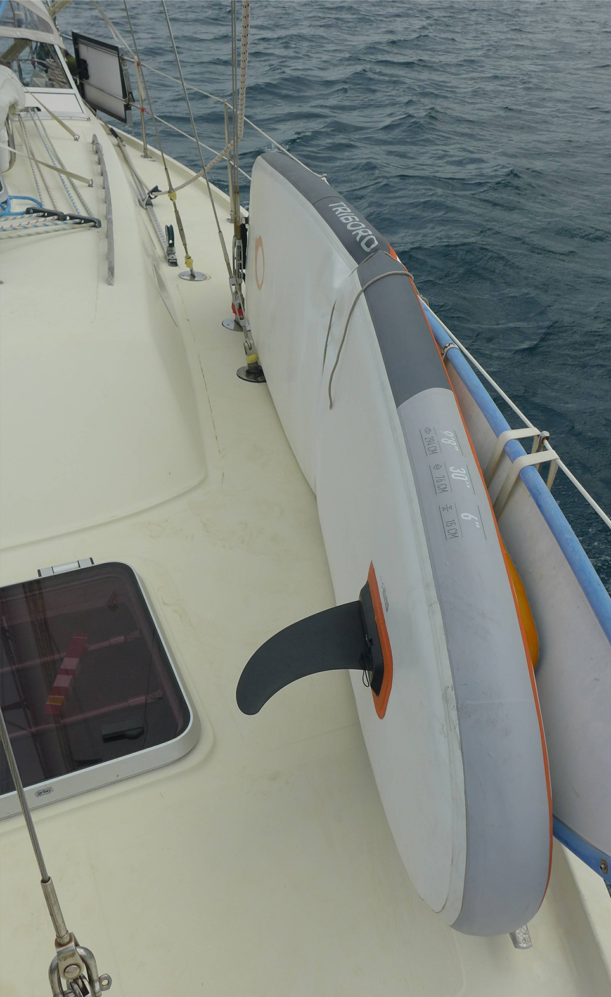 Dienstagmorgen kaufen wir ein und laufen dann aus. Praktischerweise haben wir Westwind und entscheiden uns deshalb nach Osten zu segeln. Südlich von Nouméa hören wir plötzlich im Funkgerät „Marisol, Marisol, Marisol“. Das sind ja wir! Nobbi meldet sich und wird informiert, dass vor uns irgendetwas treibt. Wir verstehen, dass wir uns freihalten sollen und nehmen eine großzügige Kursänderung vor. Vielleicht eine Übung? Gerade ist ein Flugzeug dicht über uns geflogen. Nach einiger Zeit werden wir wieder gerufen. Das Objekt liegt jetzt 45 Grad von uns. Nobbi fragt nach und erfährt, dass wir dort hinfahren sollen. Wir stellen fest, dass es sich um ein Stand-up-Paddleboard handelt, bergen die Segel und fischen es aus dem Wasser. Nobbi funkt die Küstenwache an und berichtet. Ist eine Leine an dem Bord? Ist es alt oder neu? Ist es bewachsen? Wie ist der Zustand? Dann werden wir für unser Manöver und unsere Mitarbeit gelobt und dürfen weitersegeln. Wir sollen uns wieder melden wenn wir wieder in Nouméa sind.