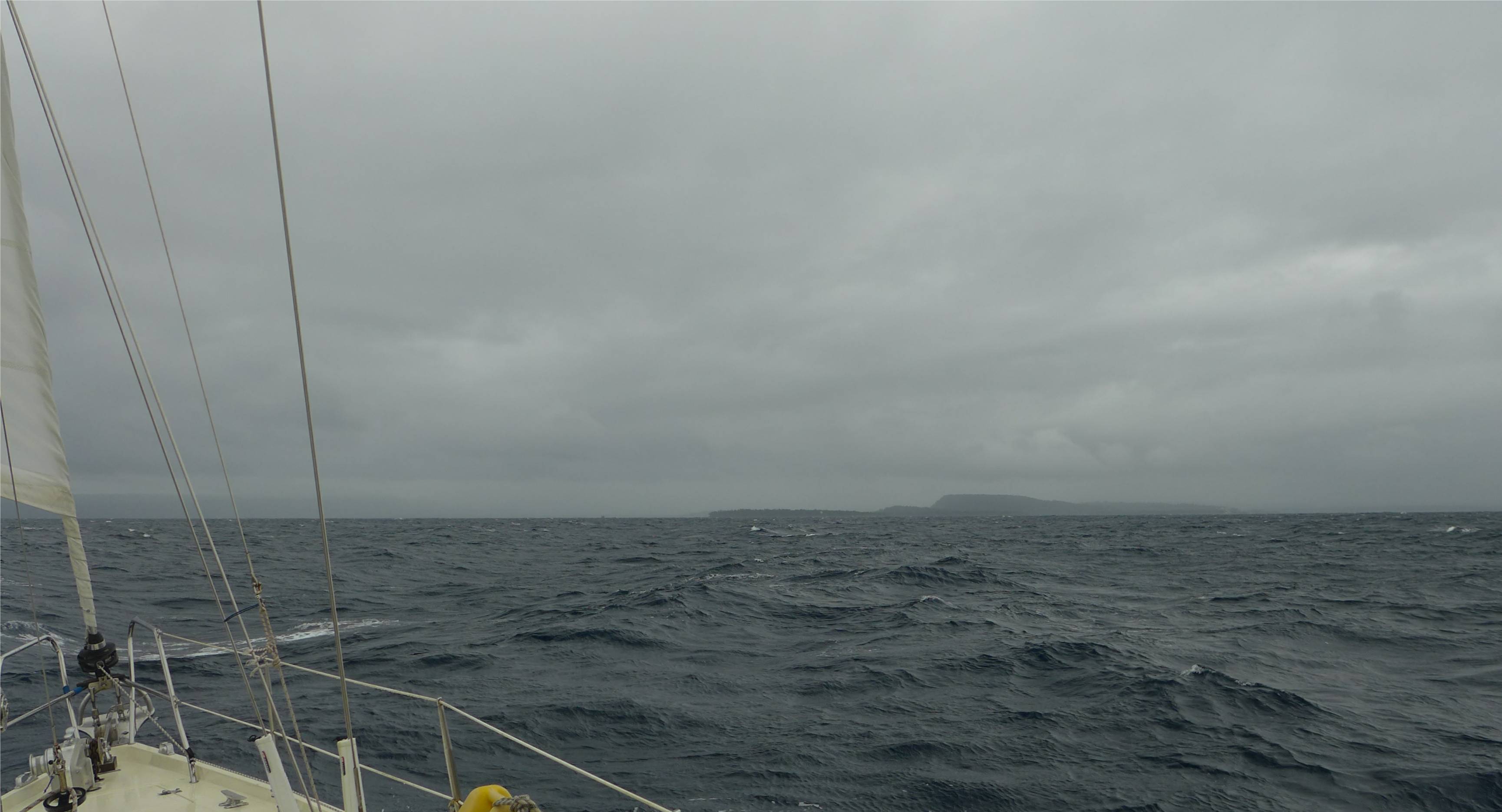 Bei der Abfahrt aus Nouméa beginnt es zu regnen, dadurch fällt der Abschnied etwas leichter. Unser Timing ist wirklich gut, wir können mit Westwind nach Osten Richtung Baie de Prony segeln. Den Canal Woodin kennen wir bisher nur als eine malerische Enge mit etwas Strömung, heute haben wir hier eine unangenehme Wind-gegen-Strom-Situation. Die Wellen steilen sich auf. Da der Wind genau von achtern kommt müssen wir mit mehreren Halsen durch den Kanal fahren, richtig anspruchsvoll und auch nicht gerade gemütlich dieses wilde Geschaukel.