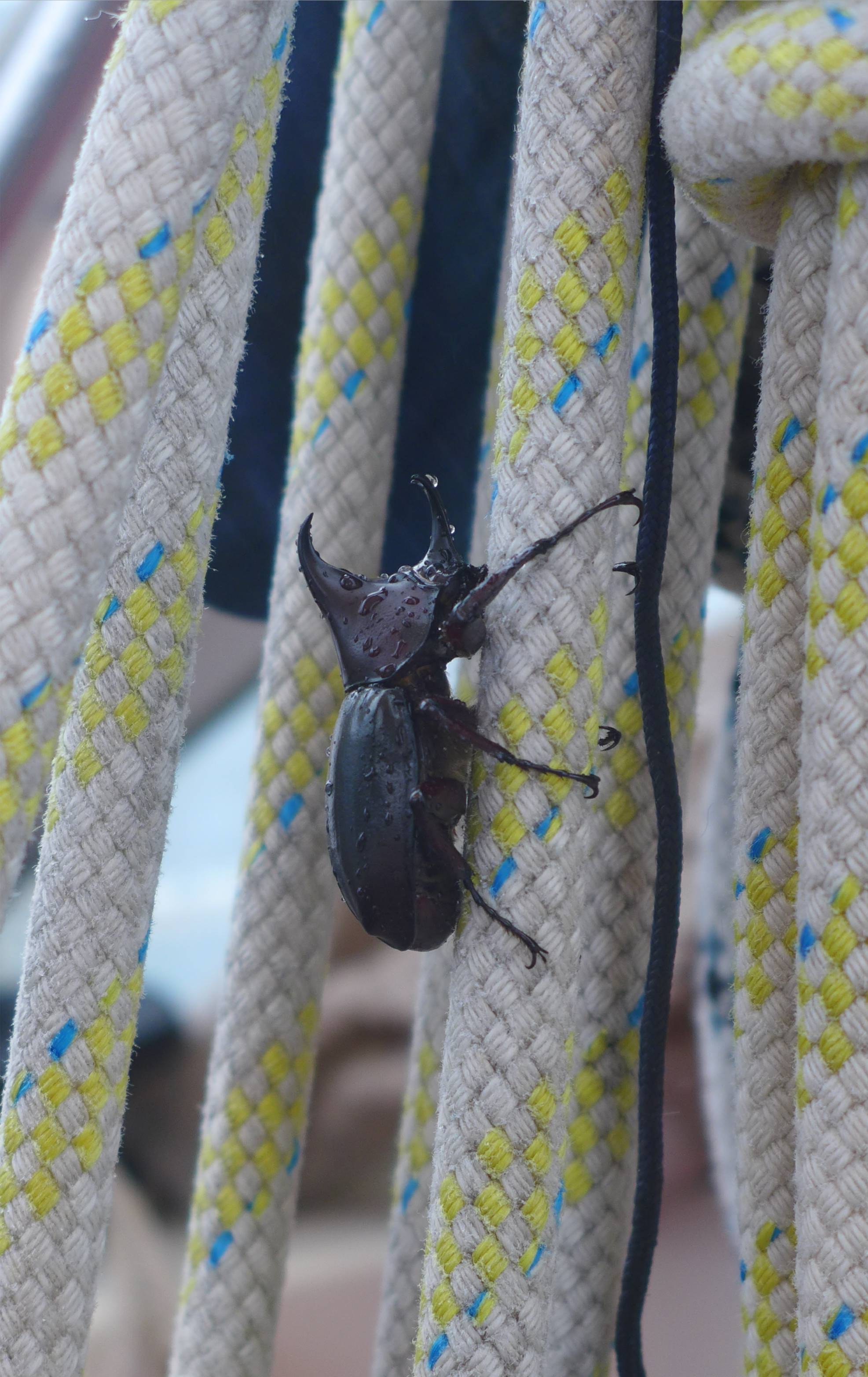 Viel früher als gedacht machen wir Bekanntschaft mit dem Riesenkäfer, dem Kokosnussschädling mit dem Nashorn. Er sitzt an unserer Großschot und faucht. So sehr, dass ich dachte das Dinghi hätte ein Loch. Ganz schön groß so ein Vieh, etwa 4 cm. Sehr interessant, ich schaue ihn mir genau an, aber dann muss er ausziehen, wir wollen ihn nicht an Bord haben.
