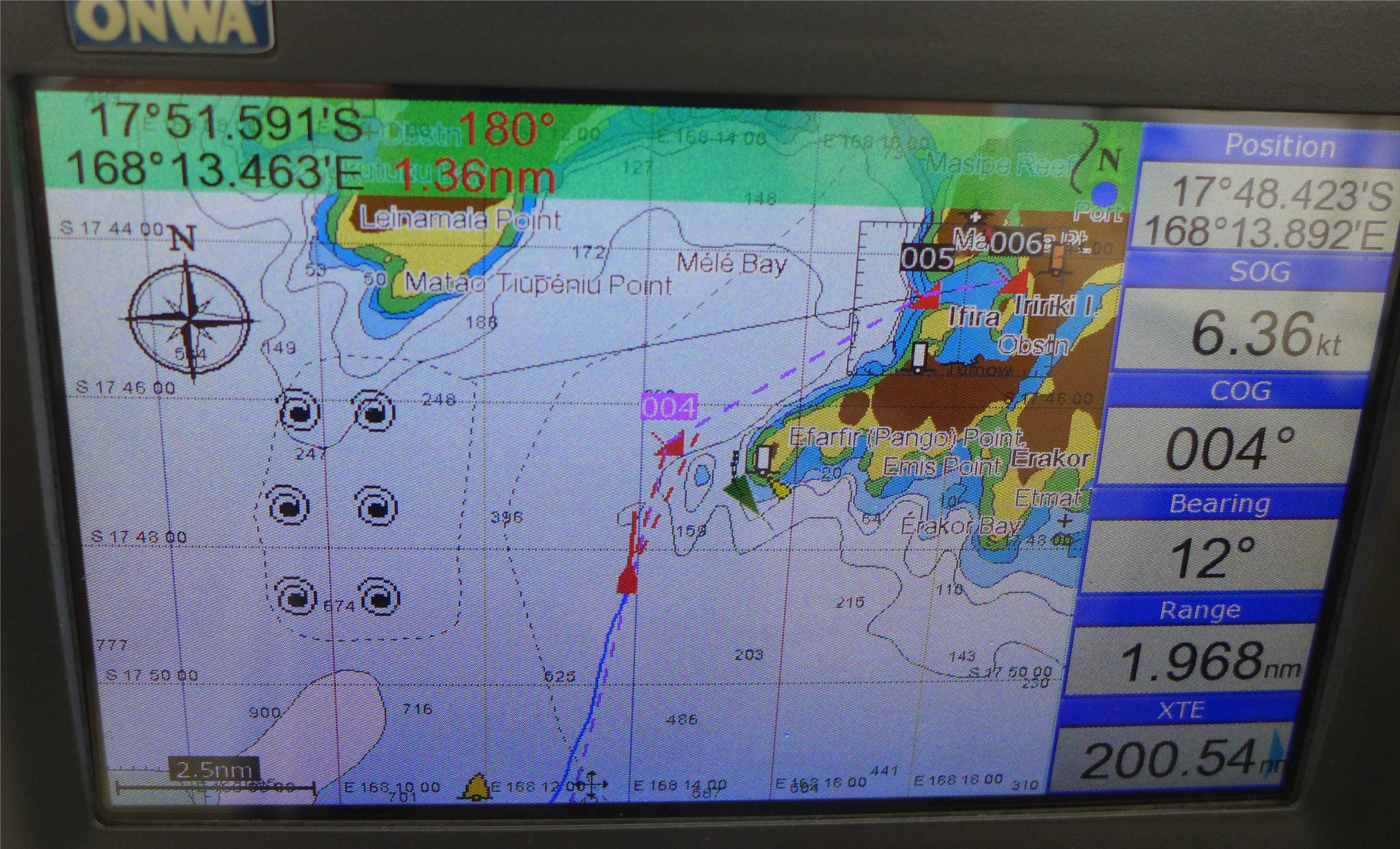 Mari ist flott unterwegs, der saubere Bauch, das neue Großsegel und eine kleine Diät scheinen ihr gut zu tun. In der Nacht erreichen wir Lifou, eine der Loyalitäts-Inseln und passieren sie im Osten. Außer einem kleinen Leuchtturm sehen wir aber nichts von der Insel. Nun sind es noch 200 Meilen nach Port Vila. Der Wind kommt sehr achterlich, soll aber langsam drehen. Eigentlich schöne Bedingungen, doch der Seegang ist zeitweise sehr konfus und so werden wir immer wieder durchgeschüttelt. Später überlegen wir, ob wir den chaotischen Seegang vielleicht dem Erdbeben zu verdanken haben.