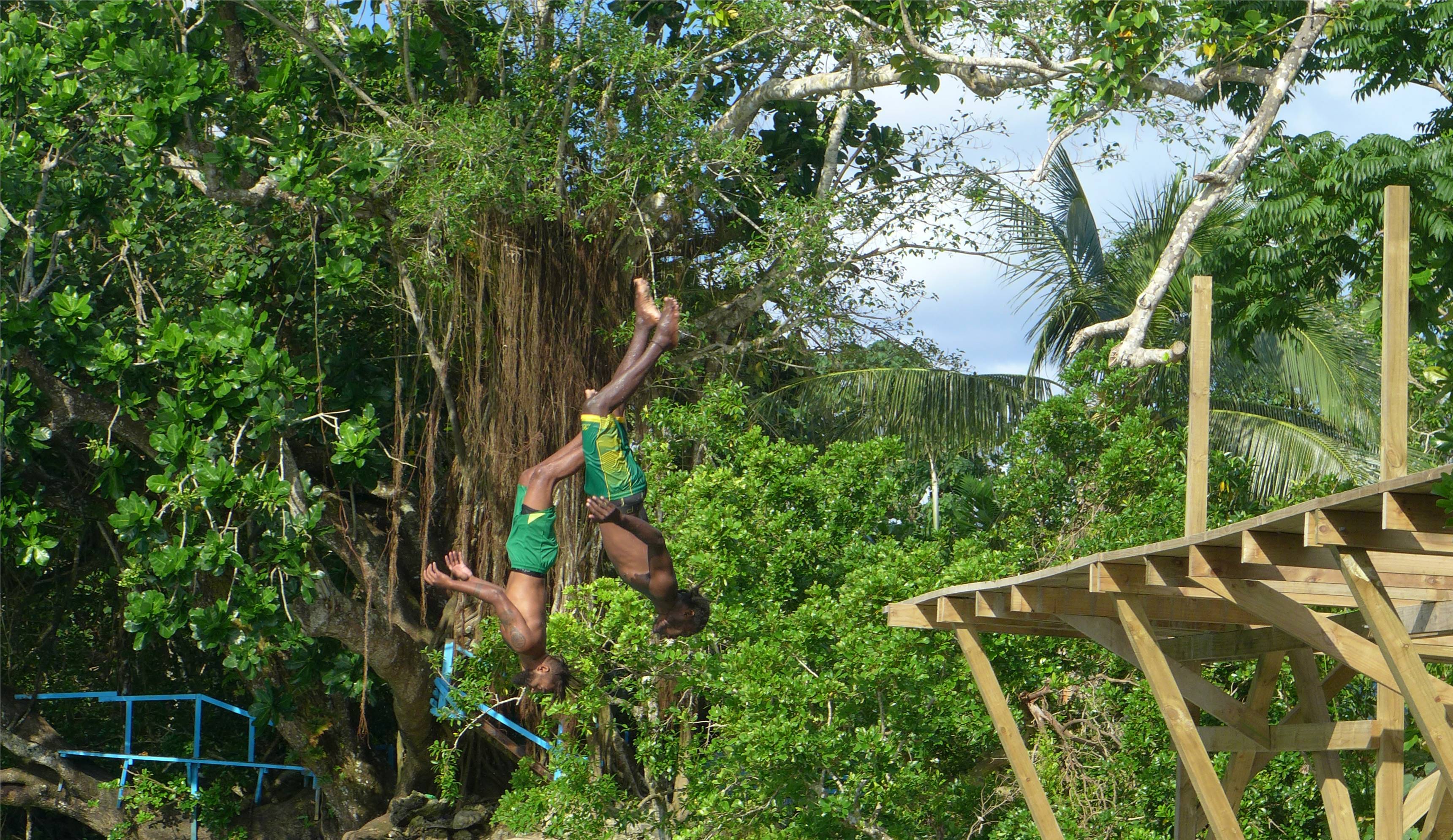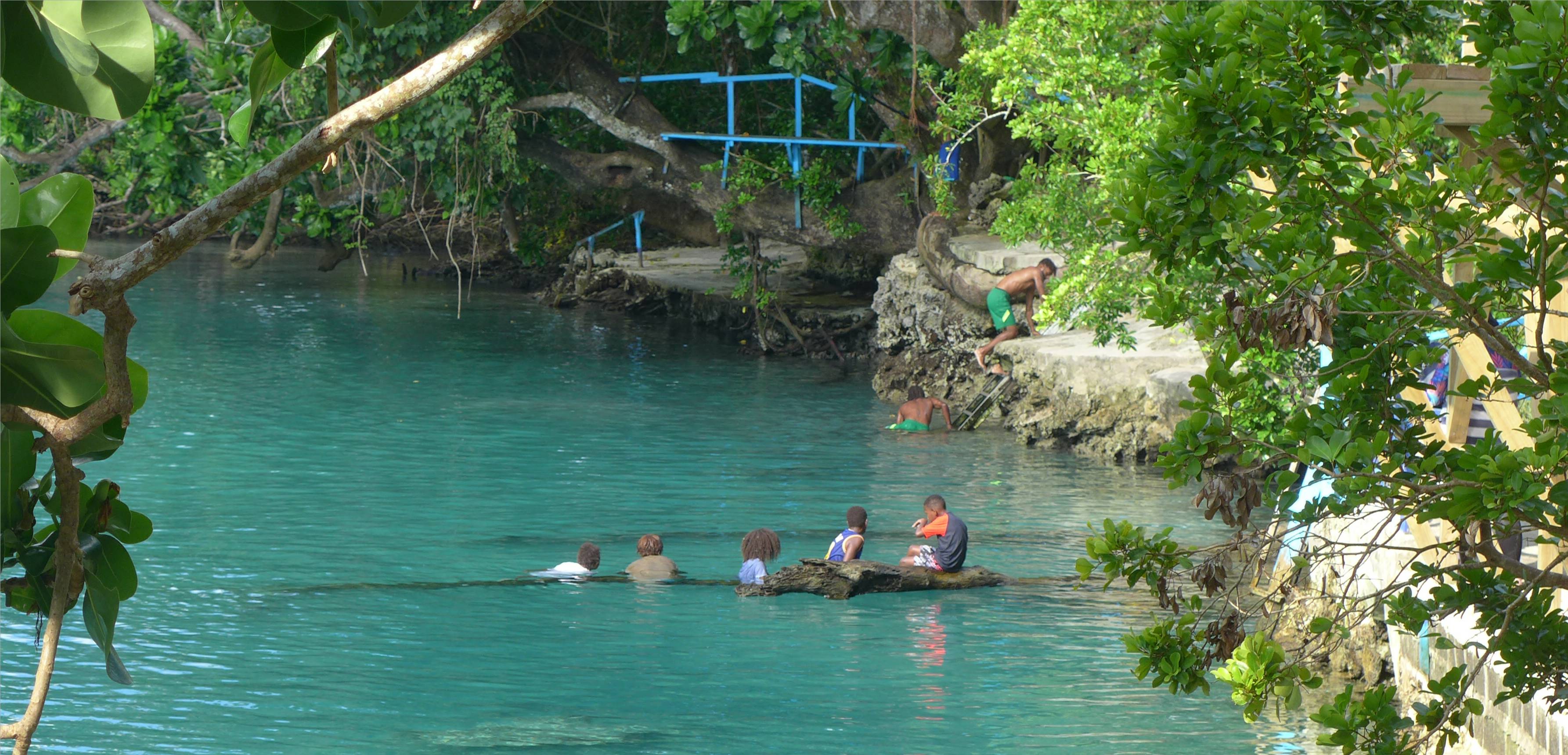Angela und George haben ein Auto gemietet und laden uns zu einem Ausflug ein, die Chance etwas von der Insel Efate zu sehen lassen wir uns nicht entgehen. Wir fahren zur Blue Lagoon. Um das klare Wasser gibt es eine Vielzahl von kleinen schattigen Hütten, man kann sich an Seilen ins Wasser schwingen oder von Plattformen springen. Wir nehmen ein ausgiebiges Bad, sehen den einheimischen Jugendlichen beim Badespaß zu und freuen uns, dass der Badeplatz heute wenig besucht ist. Wir haben ausgesprochen gute Laune und sehen über den sportlichen Eintrittspreis hinweg. Wir werfen noch einen Blick auf einen hübschen Strand, halten gelegentlich an und bekommen einen kleinen Eindruck vom Leben außerhalb „Port Vila Downtown“. Mir gefallen die Kühe unter den Kokospalmen besonders gut. Ob es häufiger vorkommt, dass sie von Kokosnüssen erschlagen werden?