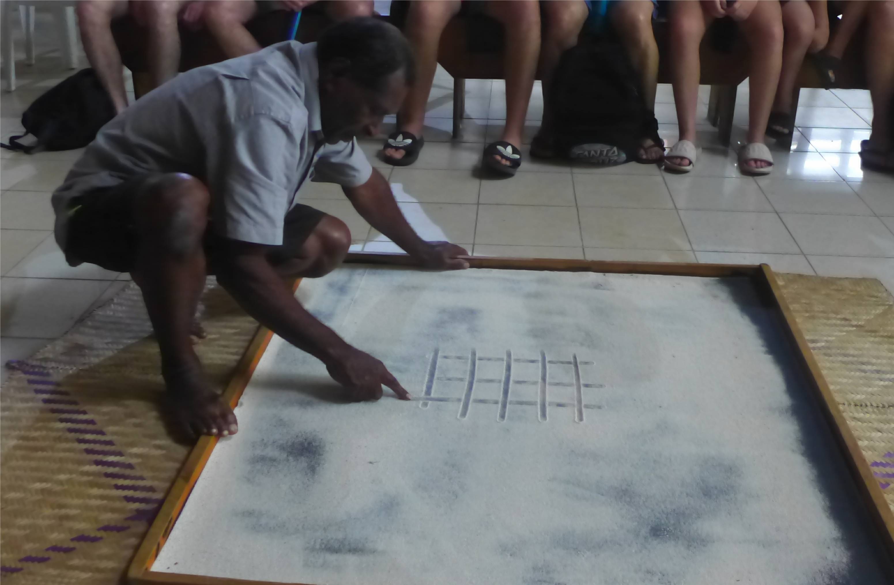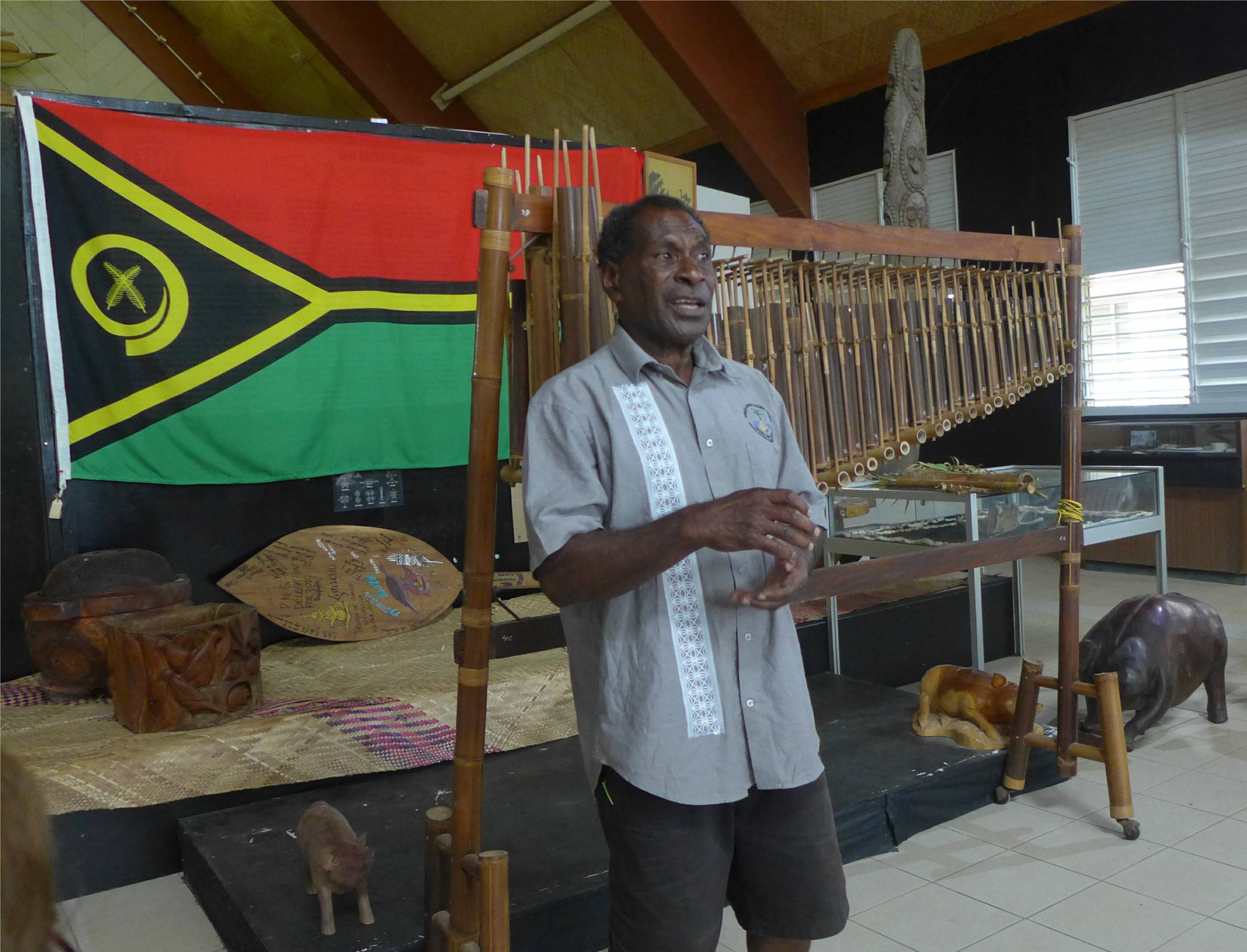 Auch am Dienstag regnet es. Wir entscheiden uns das National Museum zu besuchen. Das Museum besteht aus einer wilden Mischung verstaubter Ausstellungsstücke. Ausgestopfte Vögel, getrocknete Fische, verstaubte Masken, verschiedene Poster, einige ausgegrabene Töpfereien. In manch einem Abstellraum einer deutschen Gesamtschule dürften mehr „Musemsstücke“ vor sich hin schlummern. Da wir schon einiges über Vanuatu gelesen haben, könnten wir viele Dinge einordnen, bzw. erkennen sie wieder. Als wir gerade gehen wollen werden wir aufgehalten, es gibt eine kleine Vorführung, wir dürfen daran teilnehmen. Diese Führung wertet den Museumsbesuch gewaltig auf. Unser Guide begrüßt jeden einzelnen, fasst die Geschichte Vanuatus auf unterhaltsame Art zusammen, führt das traditionelle „Sanddrawing“, das Zeichnen im Sand, vor und erzählt dazu Geschichten, spielt unterschiedliche Musikinstrumente, singt dazu und erklärt uns die Farben der Flagge Vanuatus.