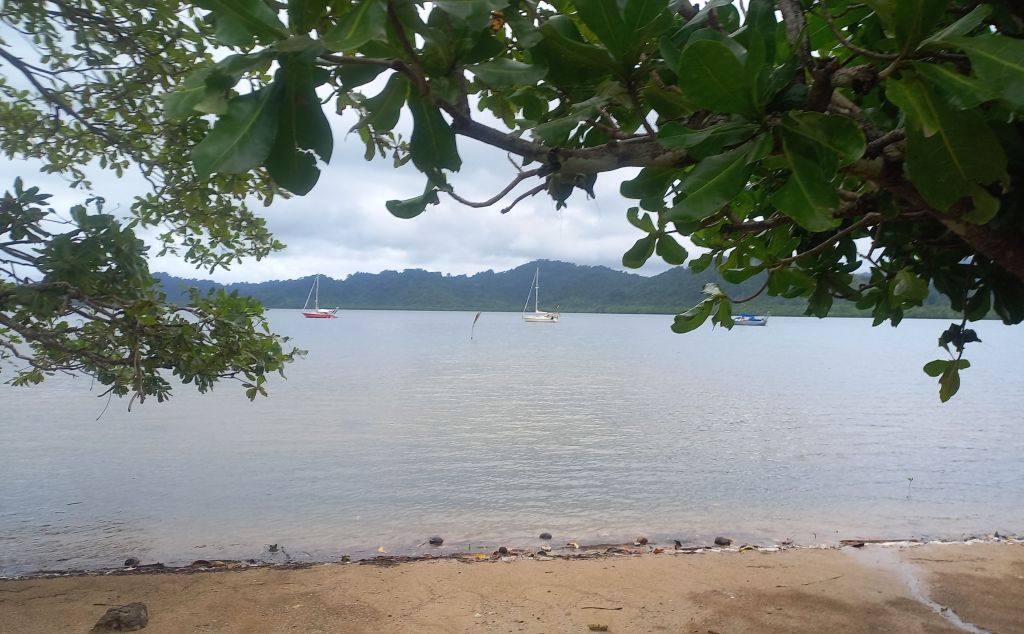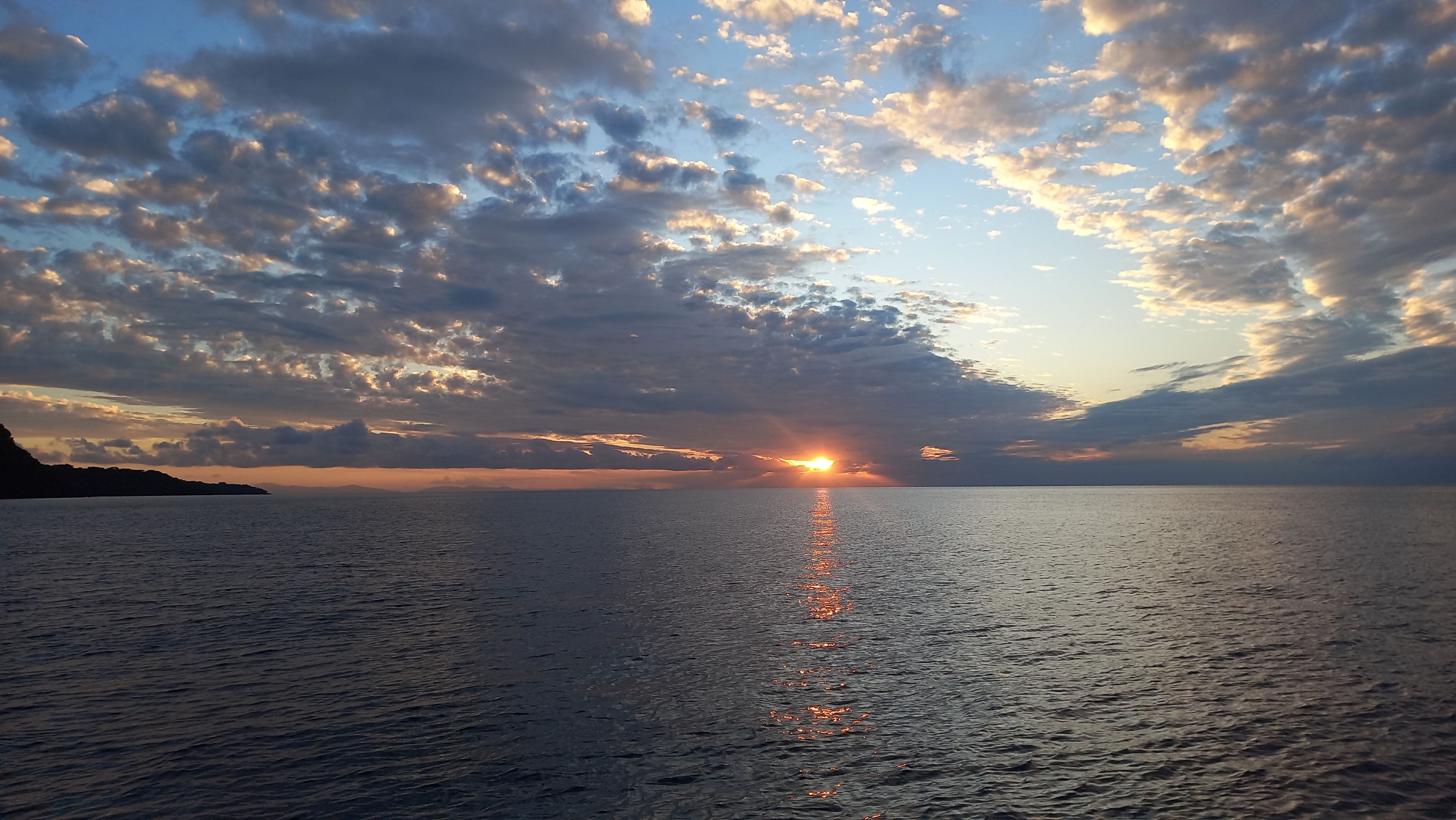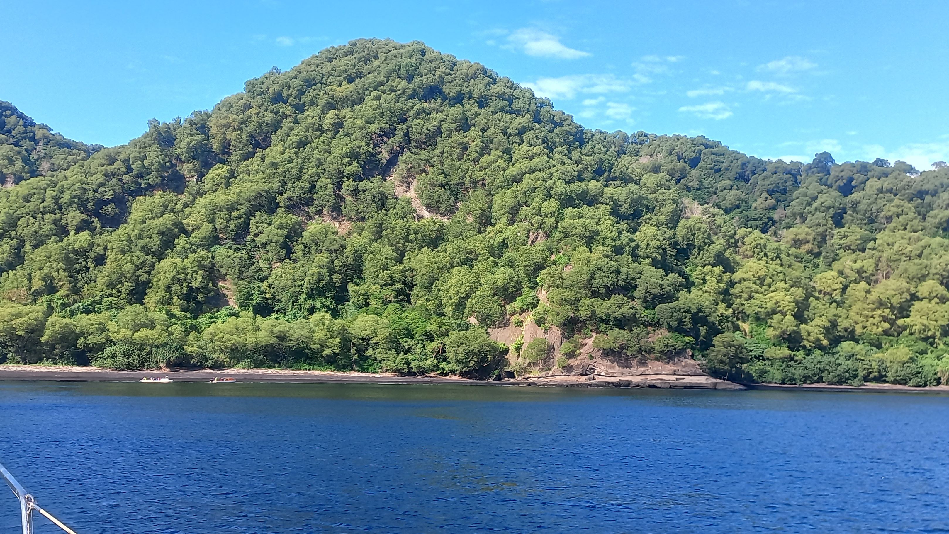 Wir entscheiden uns für einen Ankerplatz vor einem einsamen Strand. Die Insel fällt steil ab, über und unter Wasser. Doch hier gibt es einen Platz an dem wir gut ankern können. Auf 13 m Wassertiefe beißt sich unser Anker in den schwarzen Sandgrund.