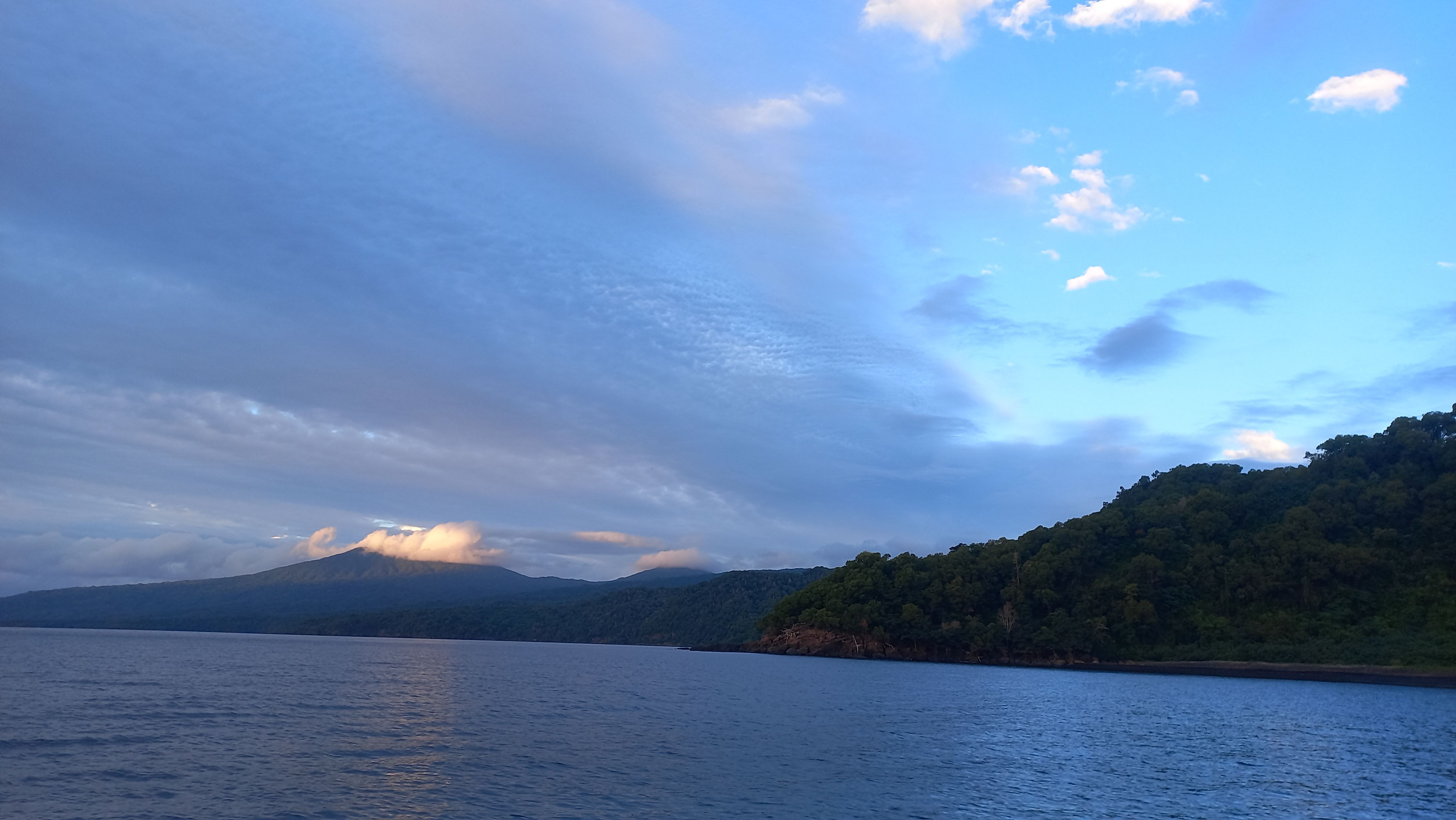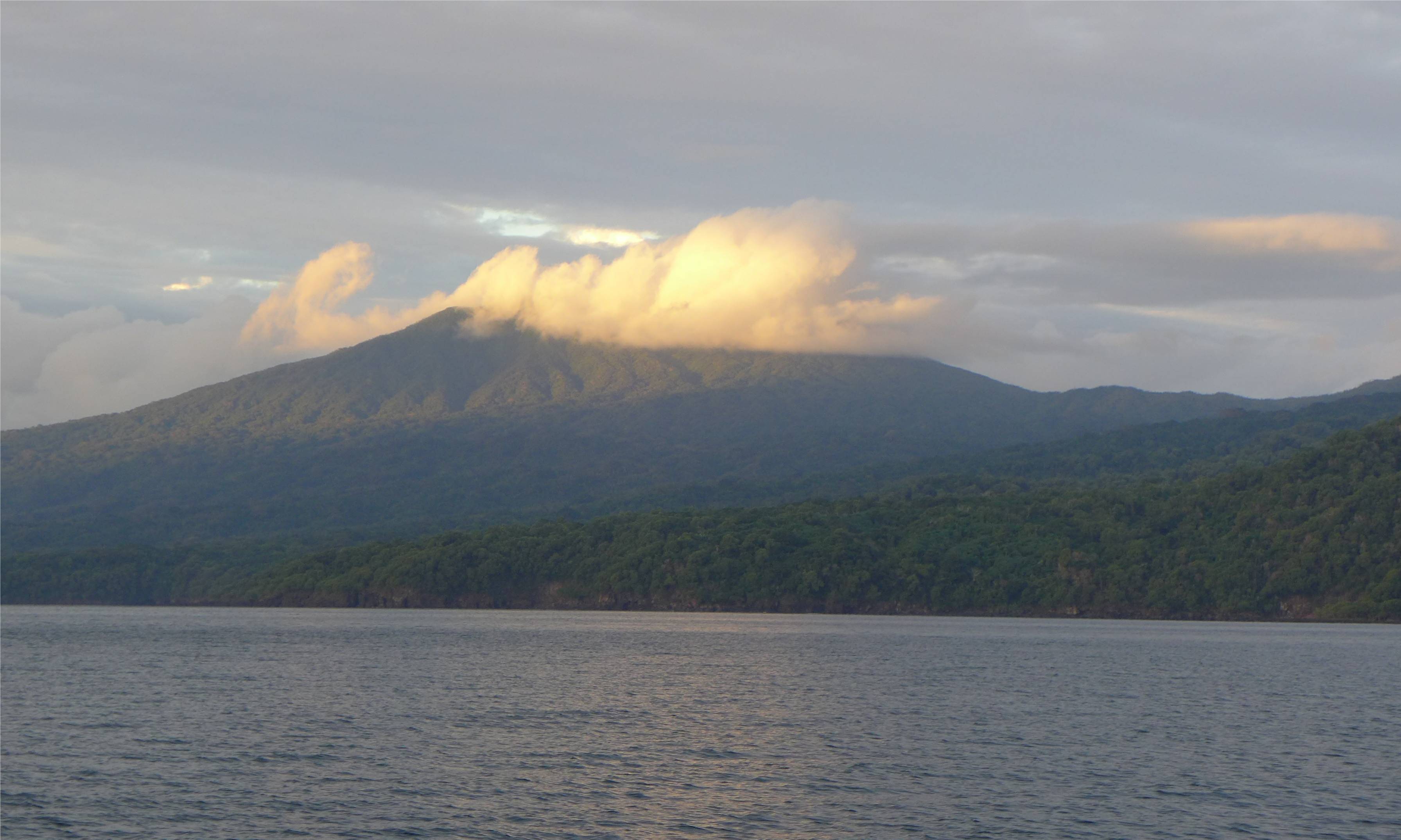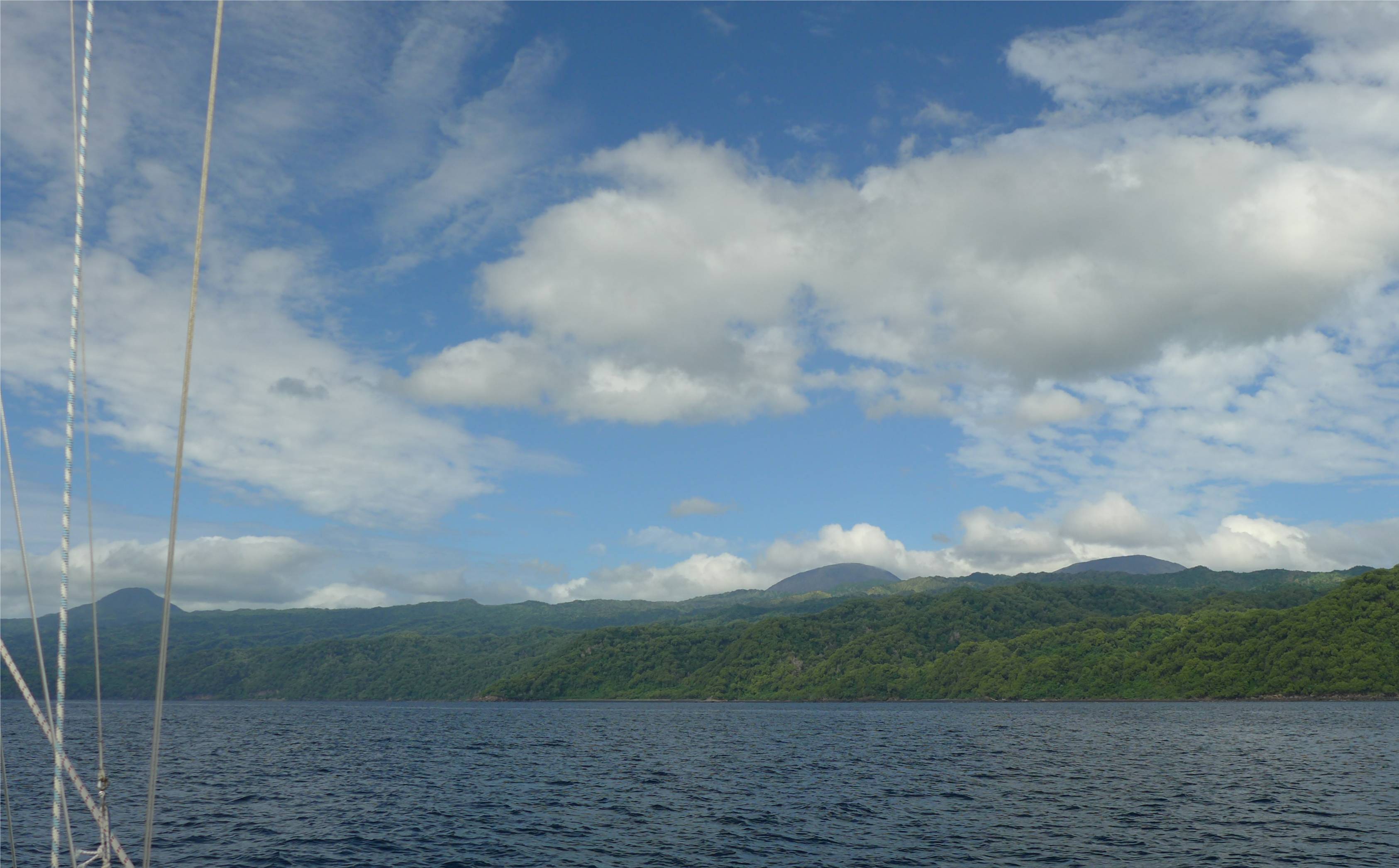 Uns erwartet ein wunderbarer Segeltag. Erst rauschen wir mit über 6 Knoten über die Enge zwischen Malakula und Ambrym. Als wir in den Windschatten von Ambrym kommen, verschwindet der Wind kurz ganz. Doch das macht gar nichts, wir machen gerade Mittagspause und genießen die Windstille zu Makrelenfilets aus der Dose mit Knäckebrot. Der Wind kommt zurück und wir segeln mit leichtem Wind bei absolut glattem Wasser an Ambryms Nordküste entlang.
