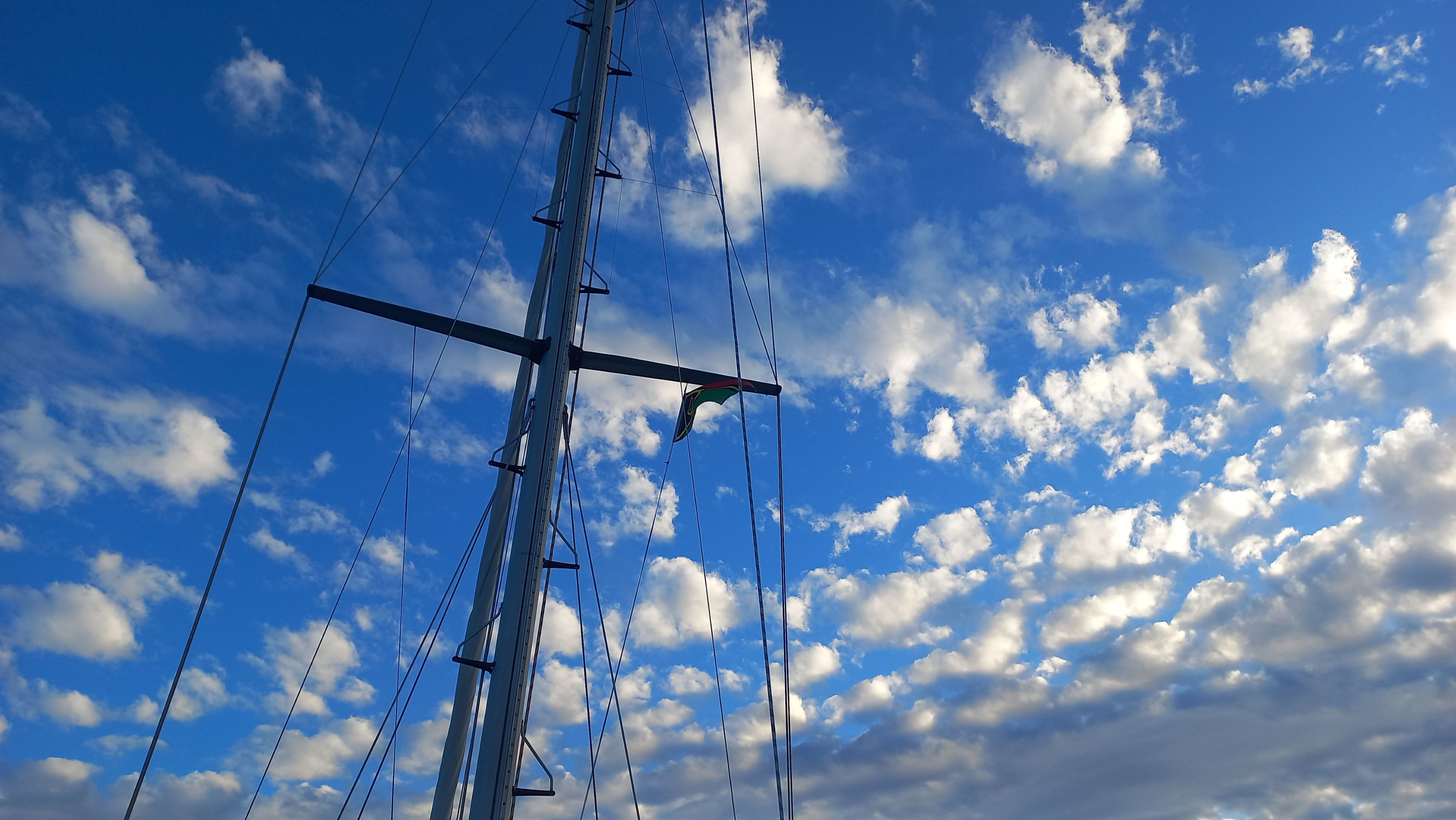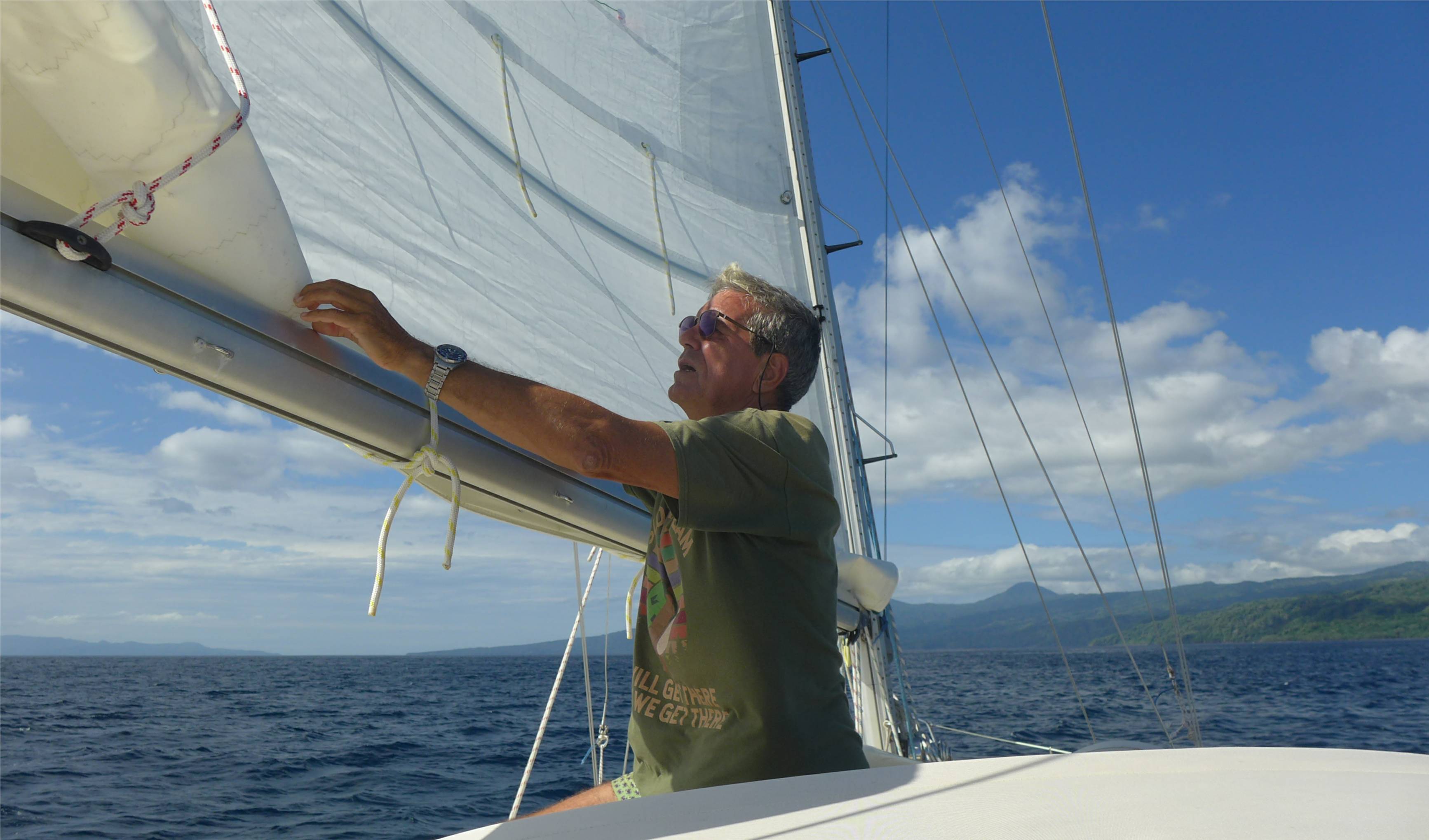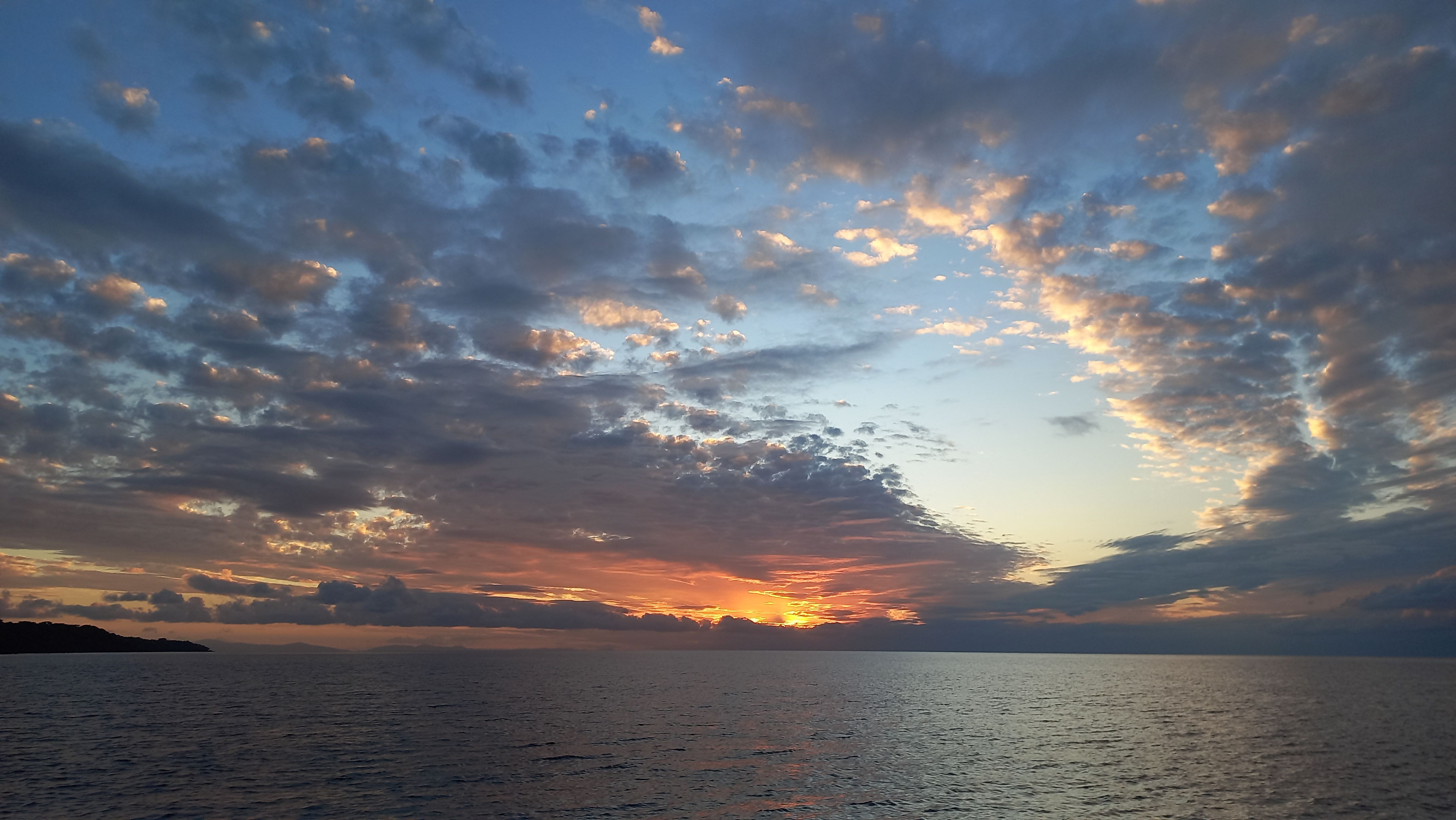Uns erwartet ein wunderbarer Segeltag. Erst rauschen wir mit über 6 Knoten über die Enge zwischen Malakula und Ambrym. Als wir in den Windschatten von Ambrym kommen, verschwindet der Wind kurz ganz. Doch das macht gar nichts, wir machen gerade Mittagspause und genießen die Windstille zu Makrelenfilets aus der Dose mit Knäckebrot. Der Wind kommt zurück und wir segeln mit leichtem Wind bei absolut glattem Wasser an Ambryms Nordküste entlang.