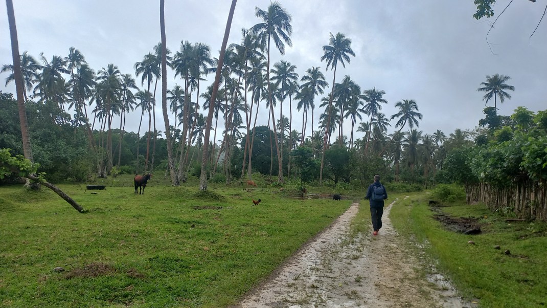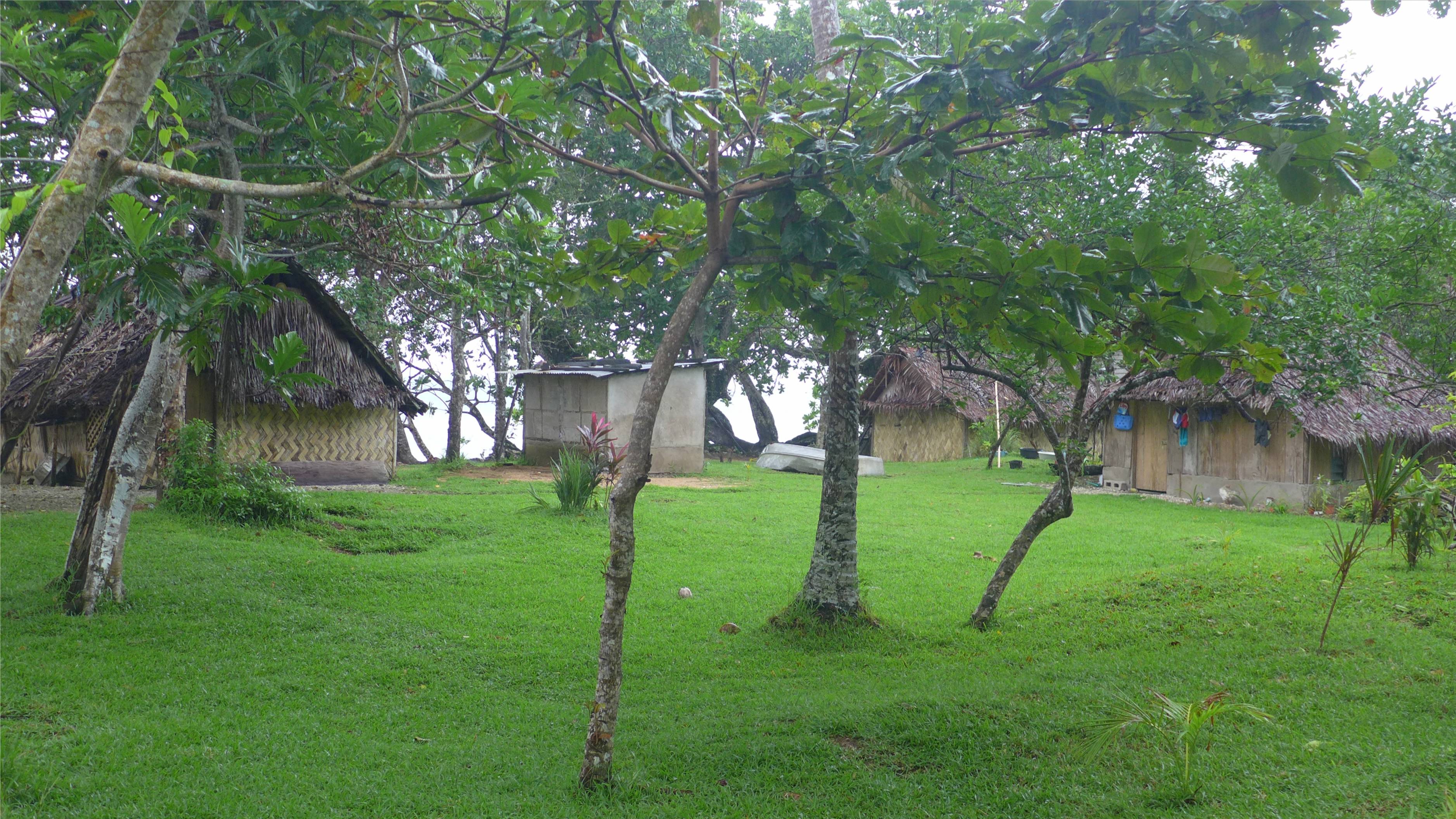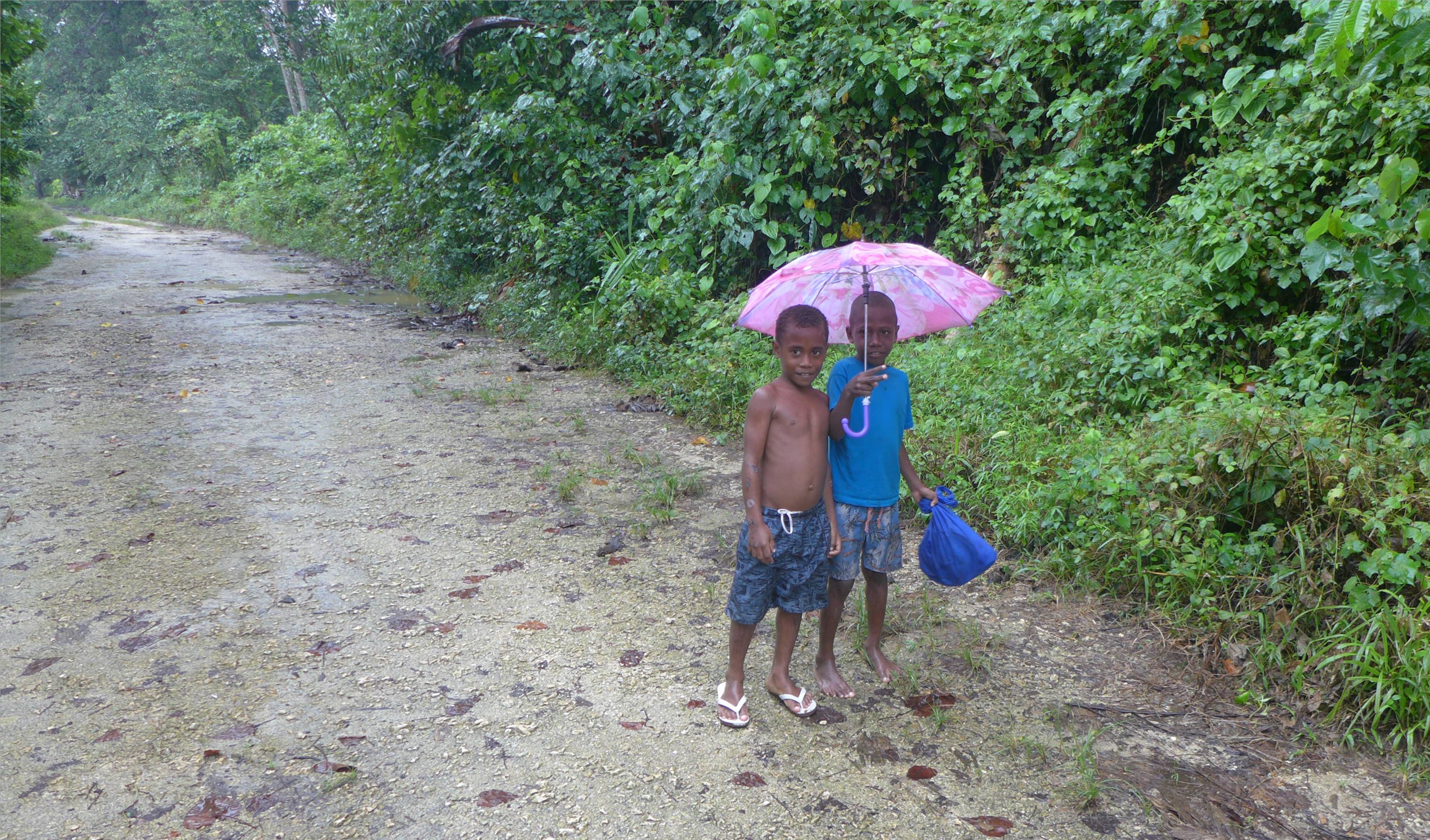 Es regnet und regnet und regnet. Sehr ergiebig und am nächsten Tag auch. Wir wollen uns trotzdem den Ort Lamap ansehen und gehen einfach los. Die „Straße“, eine Schotterpiste, versinkt ab und zu komplett in einer Pfütze. Wir kommen an schönen Gärten und gepflegten Häusern vorbei, ein paar Kinder winken uns, einige Frauen sammeln Muscheln.