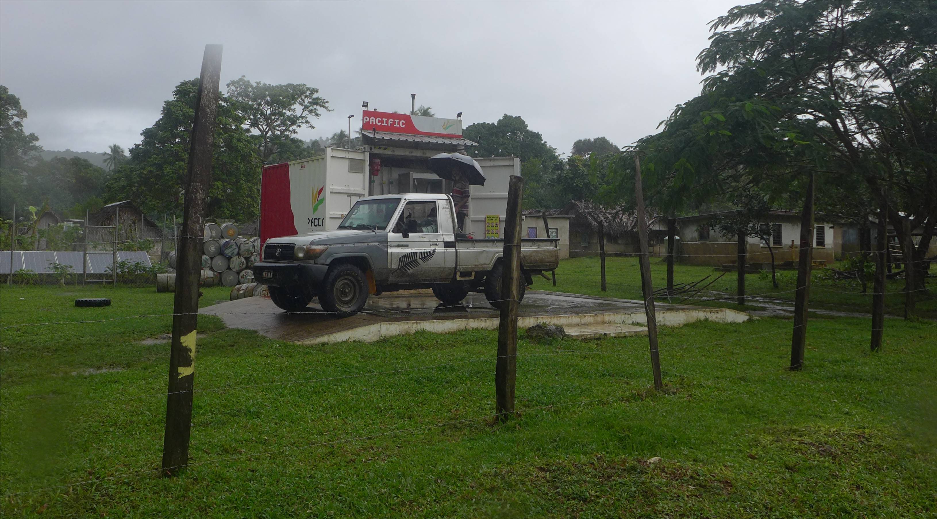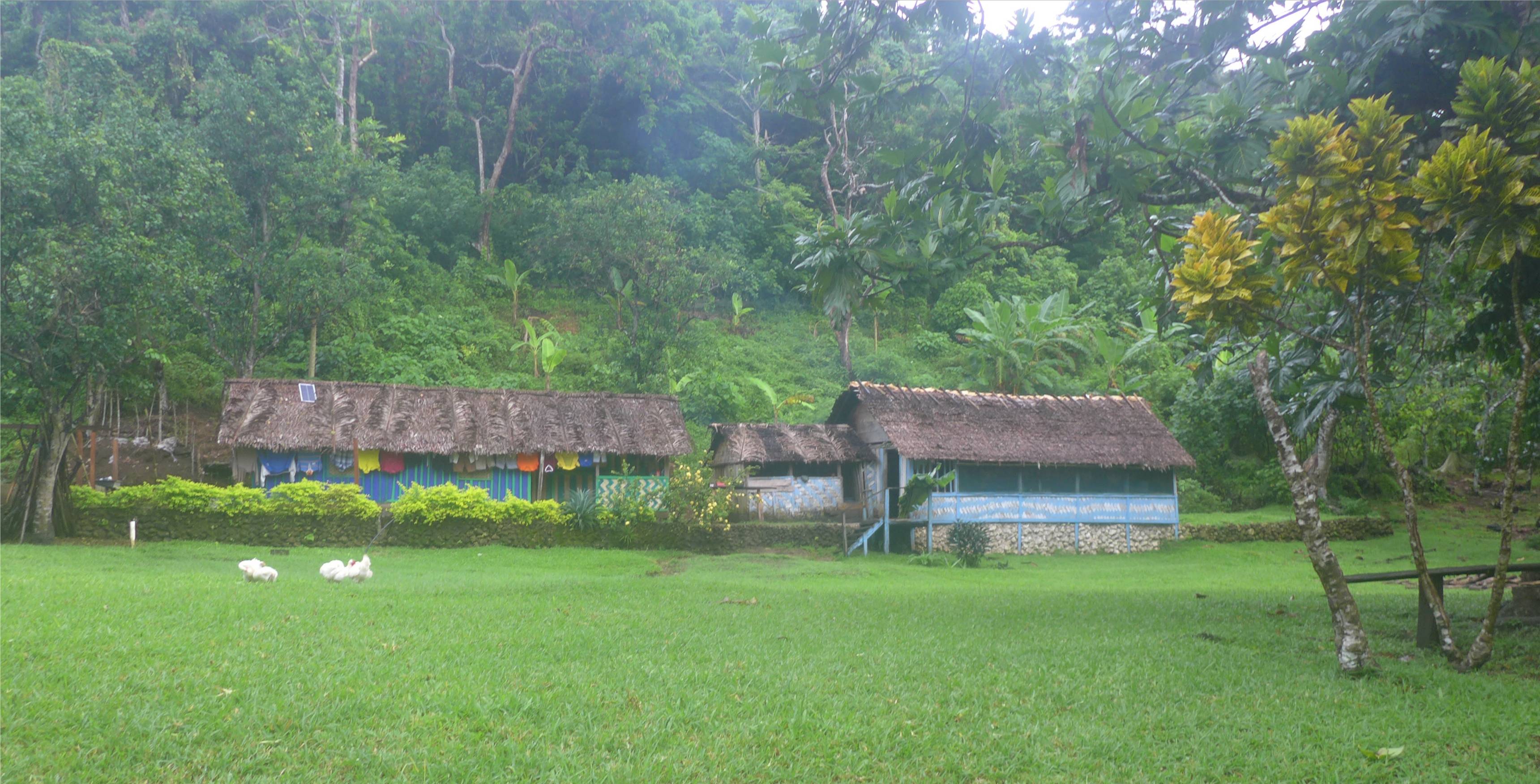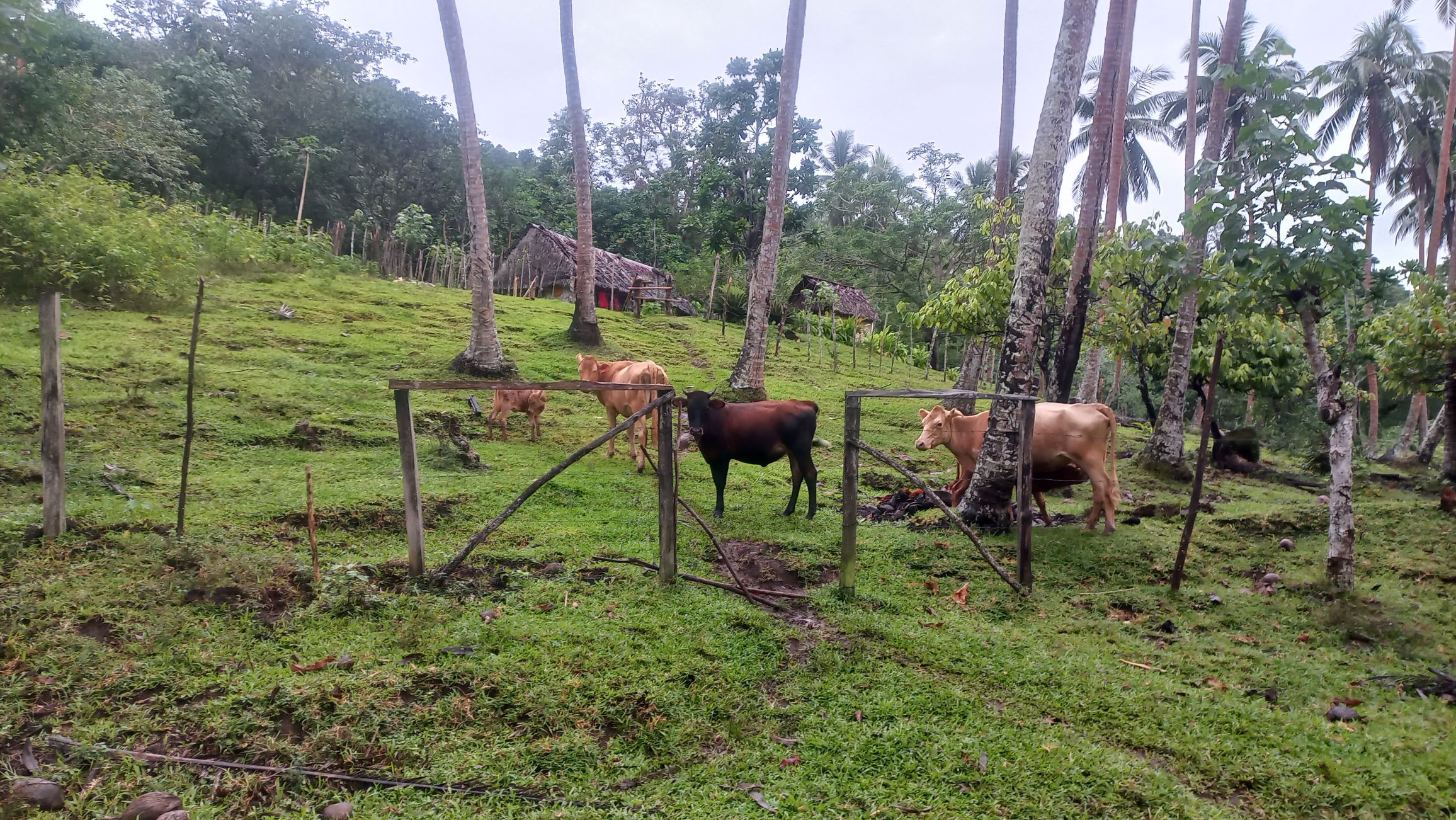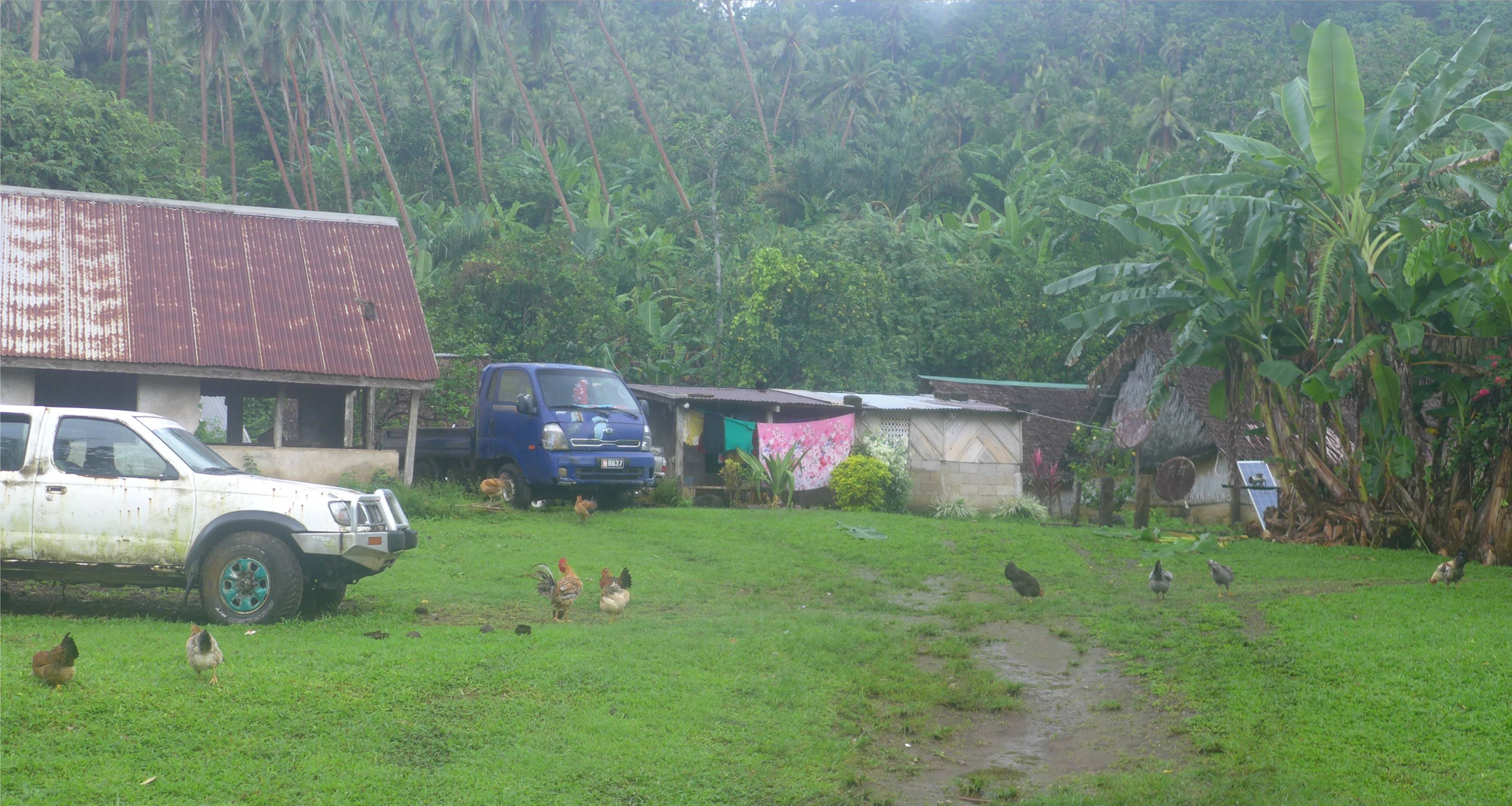 Im Ort sitzen viele Männer zusammen, die ziemlich Kava beduselt wirken und es riecht, als würde hier auch irgendetwas geraucht werden. Die Frauenrunde an der Kirche ist fröhlicher und findet uns in unserer Regenkleidung ziemlich lustig. Der Ort Lamap wirkt etwas traurig, wir sehen viele leerstehende, verlassene Häuser und Ruinen ohne Dach. Das schlechte Wetter trägt natürlich dazu bei. Auffällig sind die vielen Tiere, überall Kühe, Schweine und Hühner. Die Kühe stehen theoretisch auf eingezäunten Weiden, steigen aber ganz souverän über den Zaun um uns genauer in Augenschein zu nehmen.