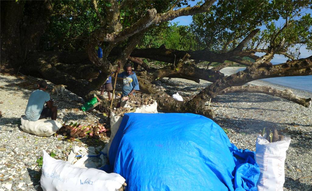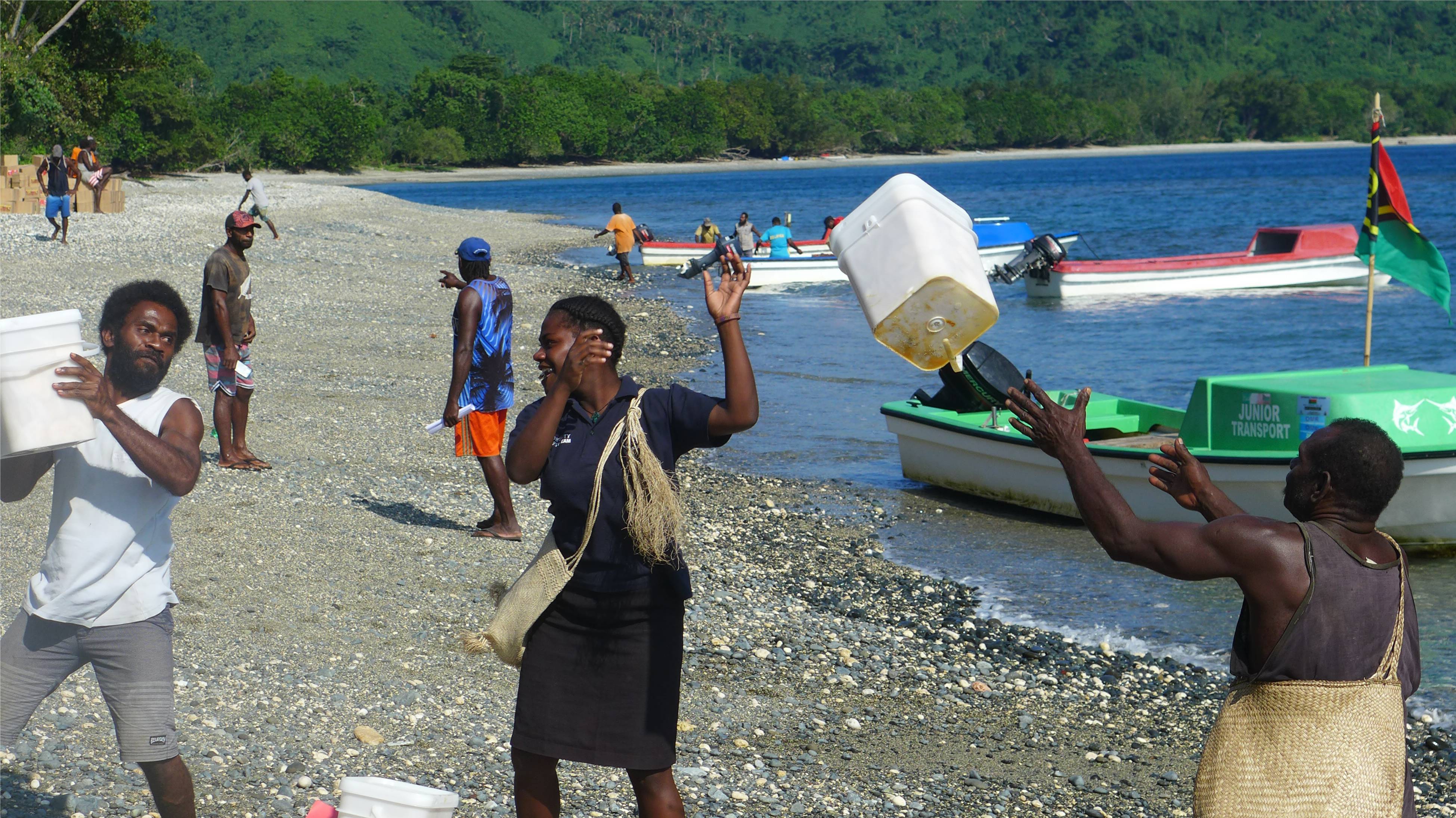 Endlich haben wir sonniges Wetter. Wir nutzen die Chance und waschen am nächsten Morgen Wäsche, nach den vielen feuchten Tagen hat sich einiges angesammelt. Mittags wandern wir am Strand entlang und wollen uns ansehen, welche Waren hier umgeschlagen werden. Reis, Fischdosen und Frühstückscracker werden in die kleinen Motorboote verladen. Wir wollen wissen, ob die Waren mit einem der Schiffe, die wir gesehen haben, gekommen sind und erfahren von einem Mann, dass es sich um einer Hilfslieferung der Regierung handelt. Er koordiniert die Verteilung auf die kleinen Gemeinden. Nicht nur die Schäden durch die Wirbelstürme (Pentecost wurde zuletzt 2020 getroffen), auch die schnell wachsende Bevölkerung stellt die kleinen Dorfgemeinschaften vor Probleme.