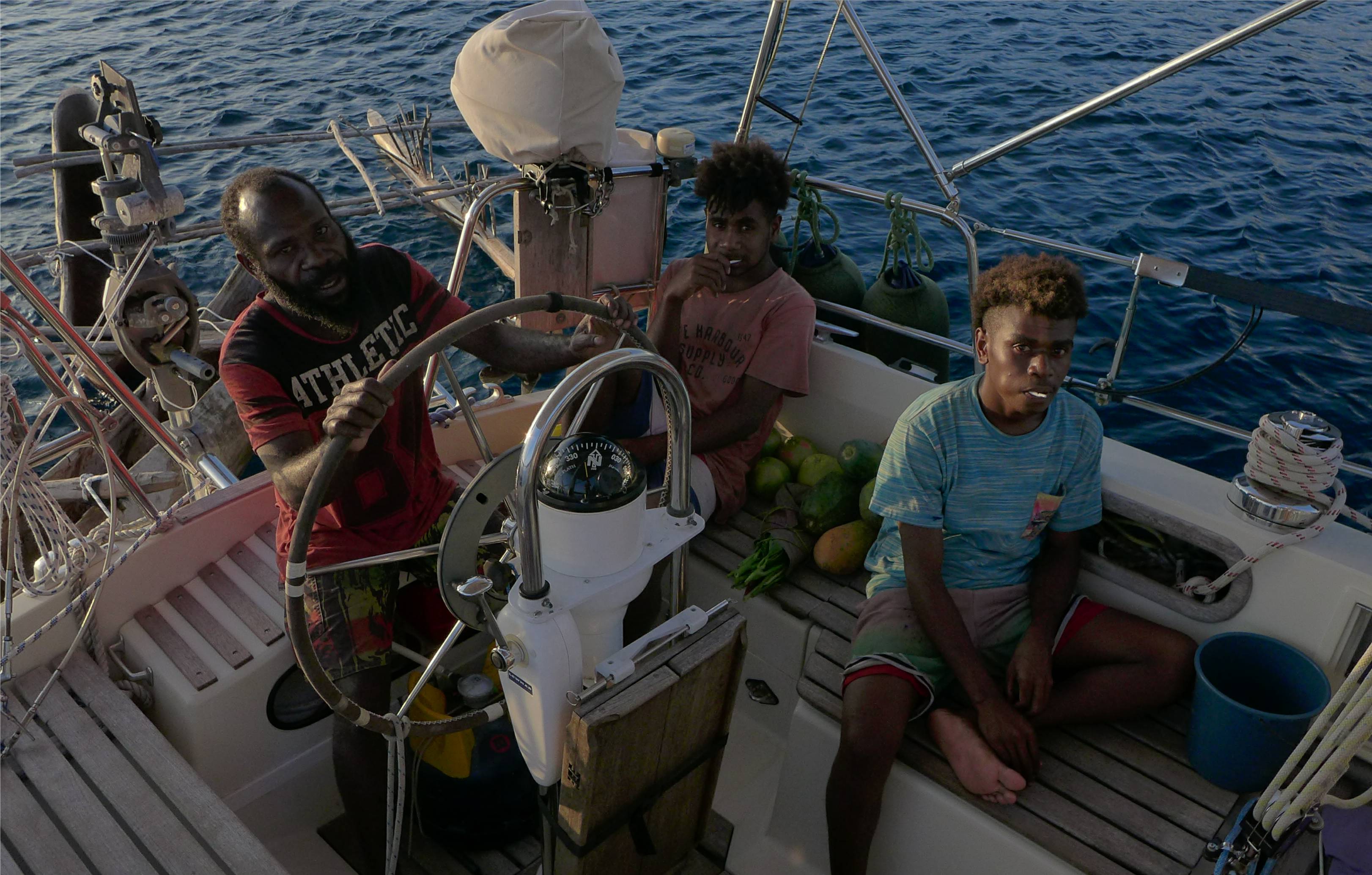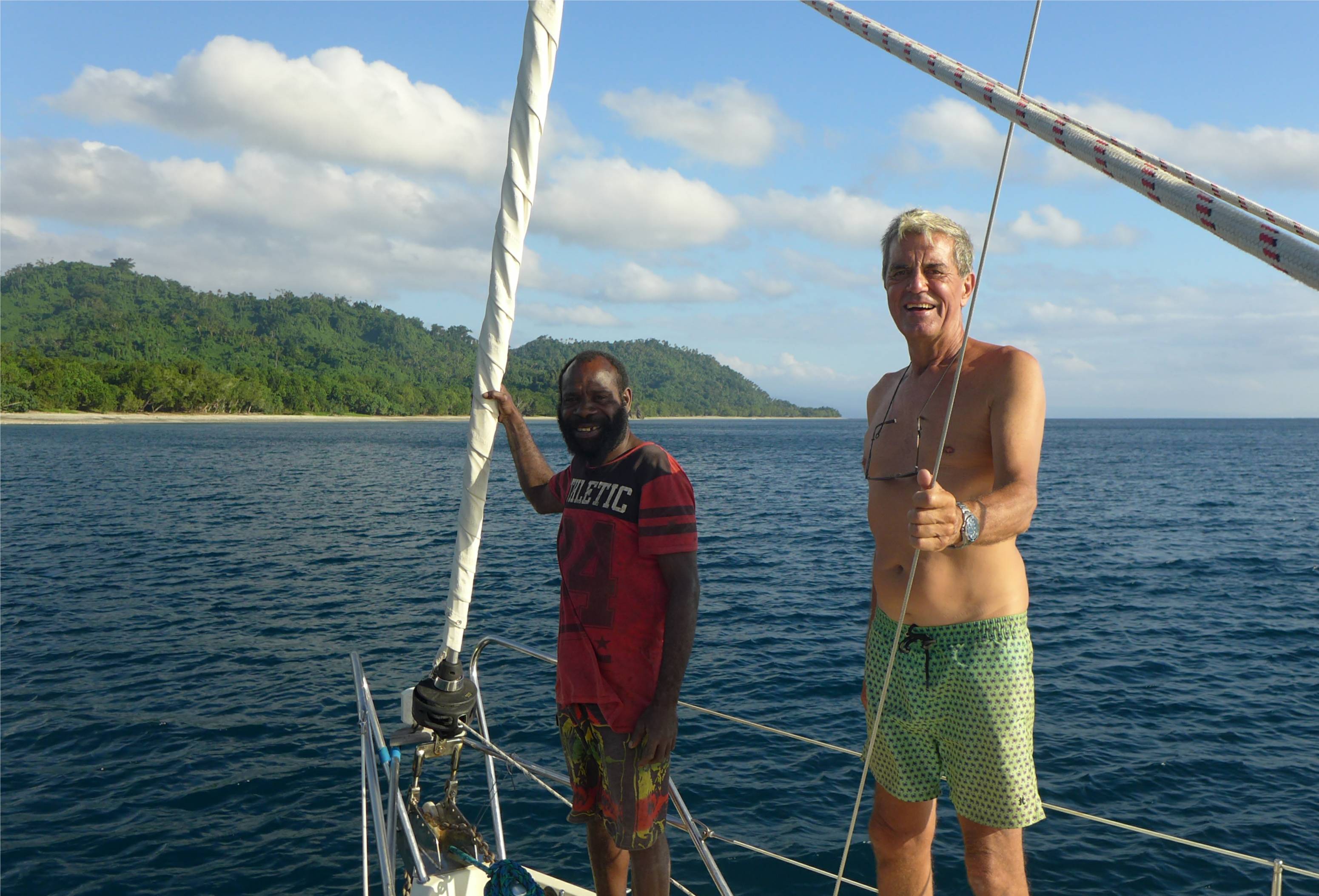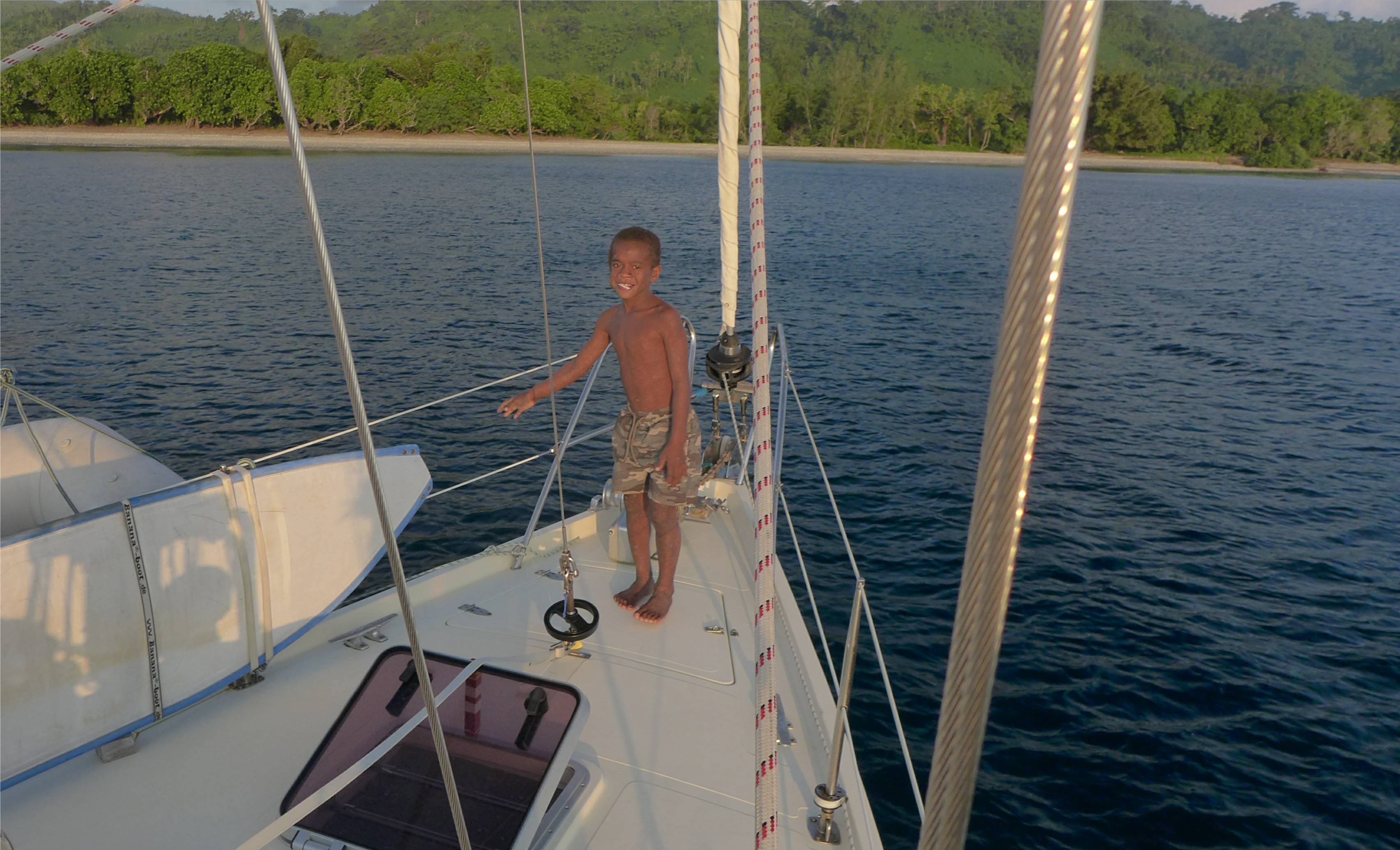 Robert paddelt mit dem Kanu zu uns und freut sich, dass wir ihn an Bord einladen. Ob er mal nach vorne gehen darf, aufs Vorschiff? Vom Bug aus winkt er seinen Freunden an Land zu. Er fragt, ob wir Obst haben möchten und verspricht später wieder zu kommen. Wir werden reichlich versorgt. Fünf Papayas, vier Kokosnüsse, vier Pampelmusen und ein Bündel „Island Cabbage“ hat er dabei, als er zurückkehrt. Außerdem bringt er seinen kleinen Sohn mit und hat zwei Teenies im Schlepptau. Kennt ihr das, junge Männer, die sich mit irgendwelchen tollen Autos fotografieren lassen? Hier übernimmt Mari heute die Rolle des heißen Sportwagens. Alle wollen einmal aufs Vorschiff und den Freunden am Strand winken.